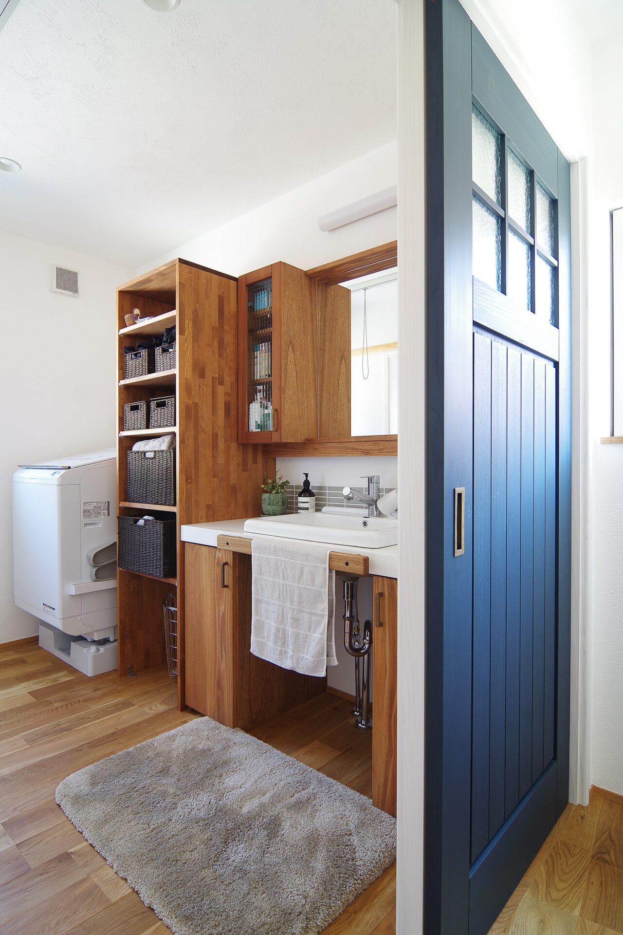 洗面台は自社家具工房の造作家具。自然素材のみで構成されたシンプルな北欧風の空間にピッタリ違和感なく馴染むことが出来る。