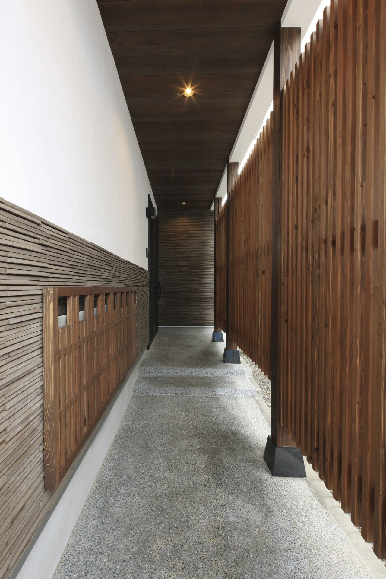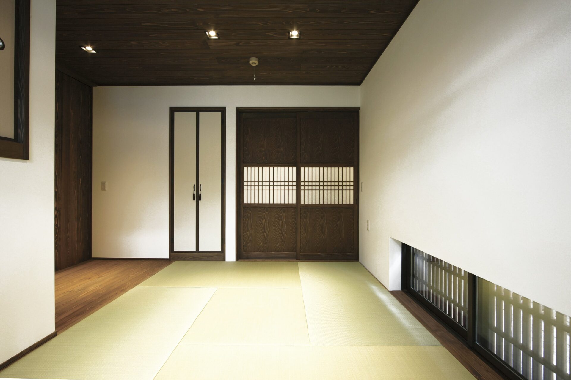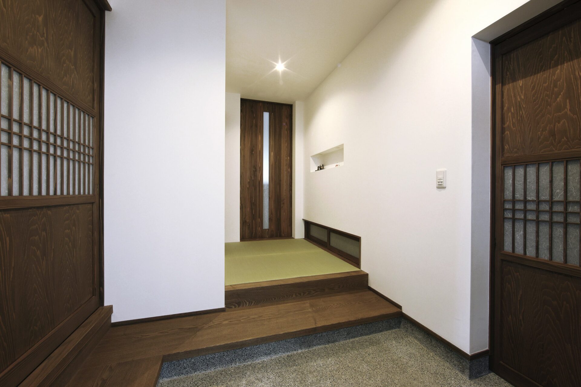 通り土間をイメージした長い玄関アプローチや床に畳を敷くなど、和の趣をもたせながらも渋くならない意匠でおしゃれ。