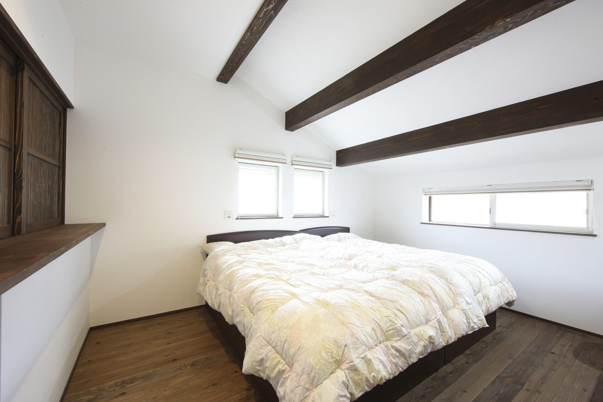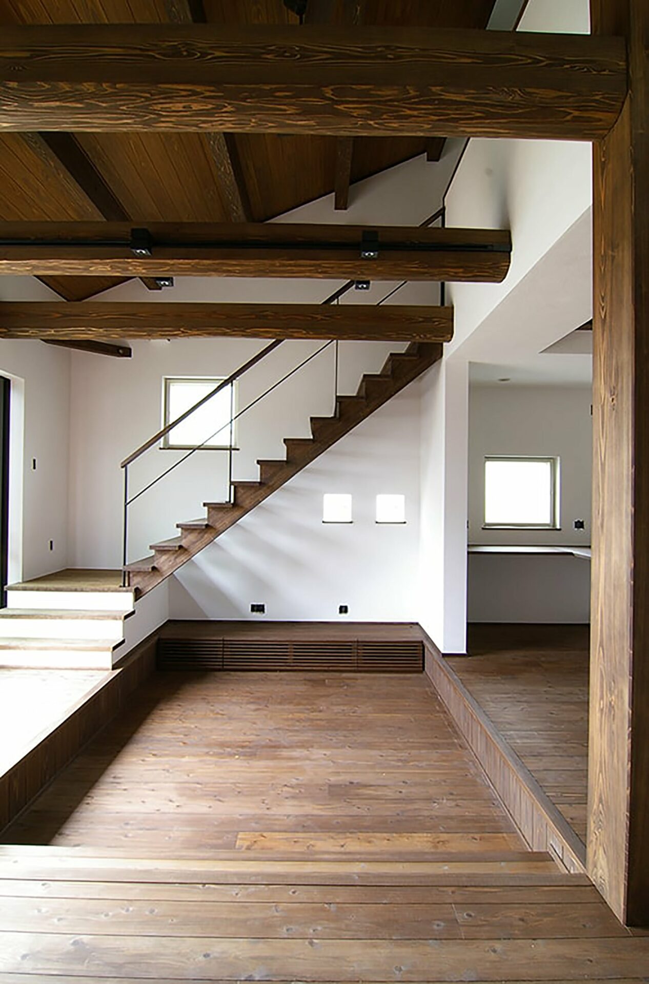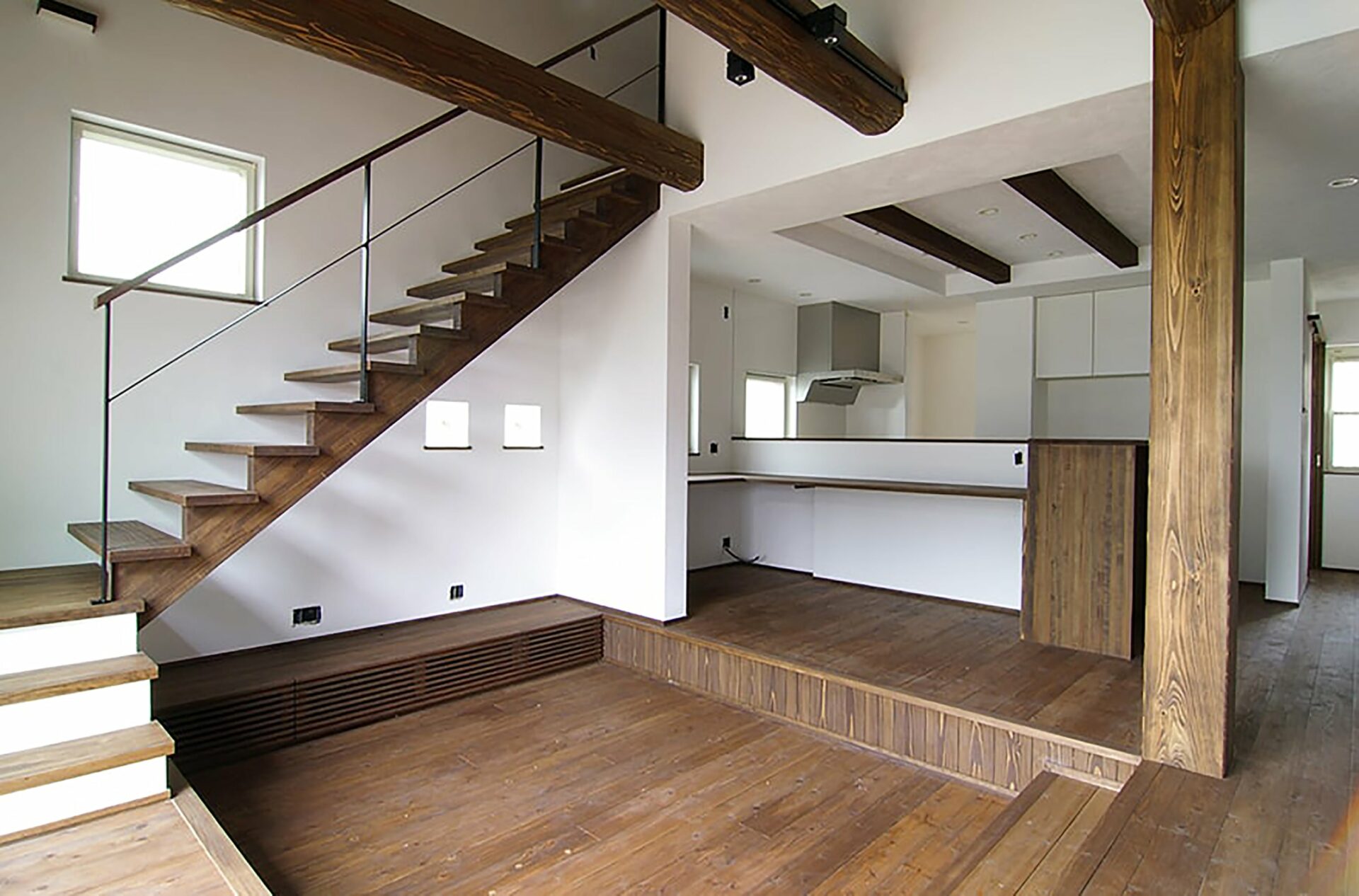 リビングを囲むようなストリップ階段と太い梁に勾配天井。オシャレな古民家を連想させ、ゆっくりとした時間を過ごせます。無垢材や漆喰といった、昔からある素材を使いながら、現代風のモノトーンにまとめることで「和カフェ」を連想させる空間となりました。