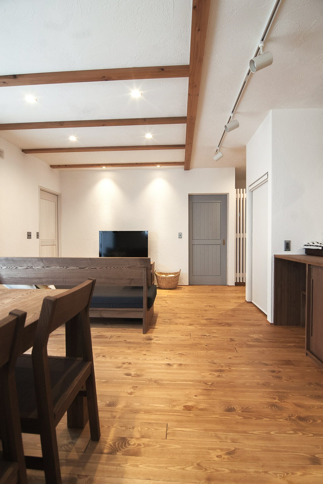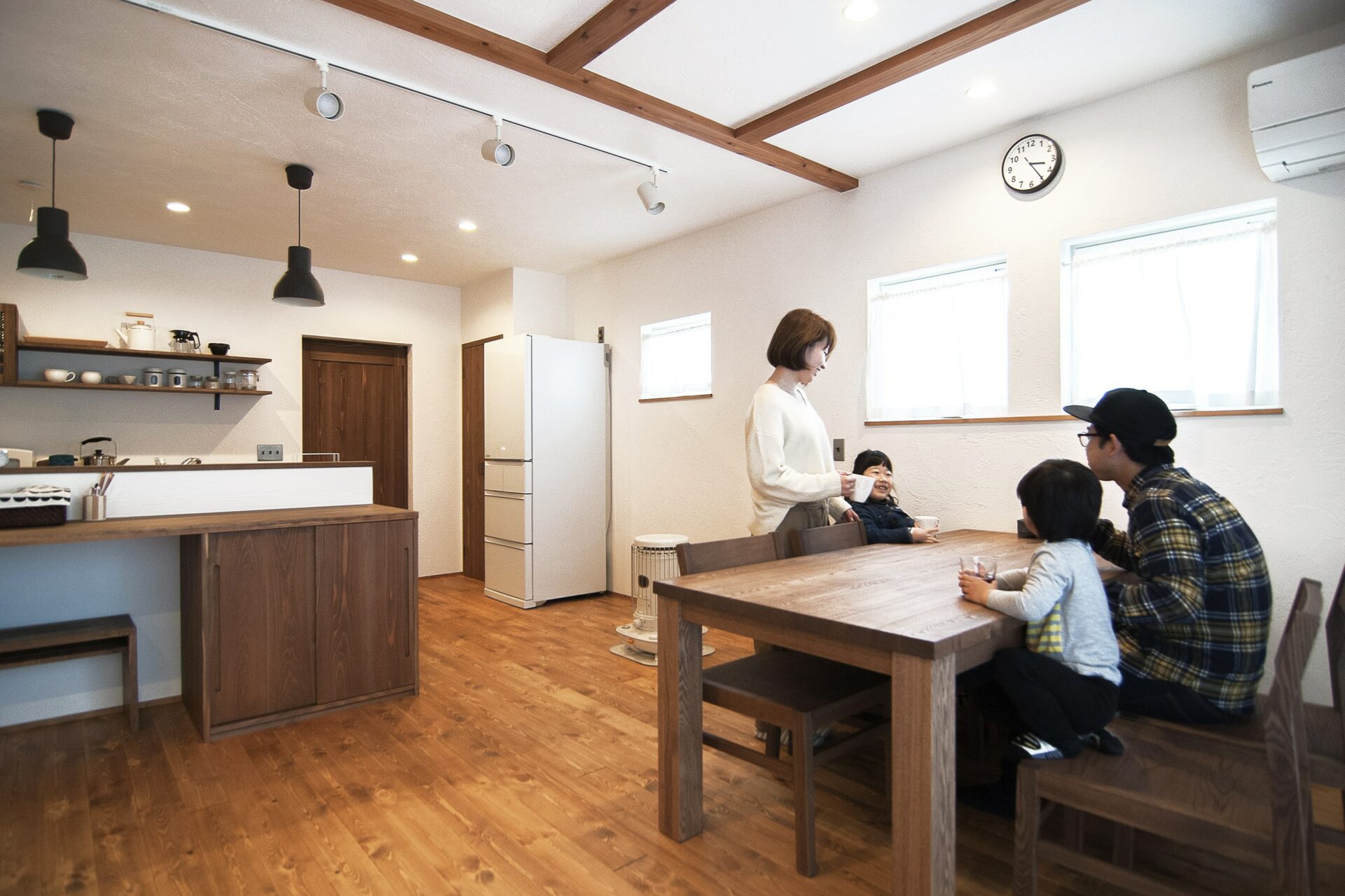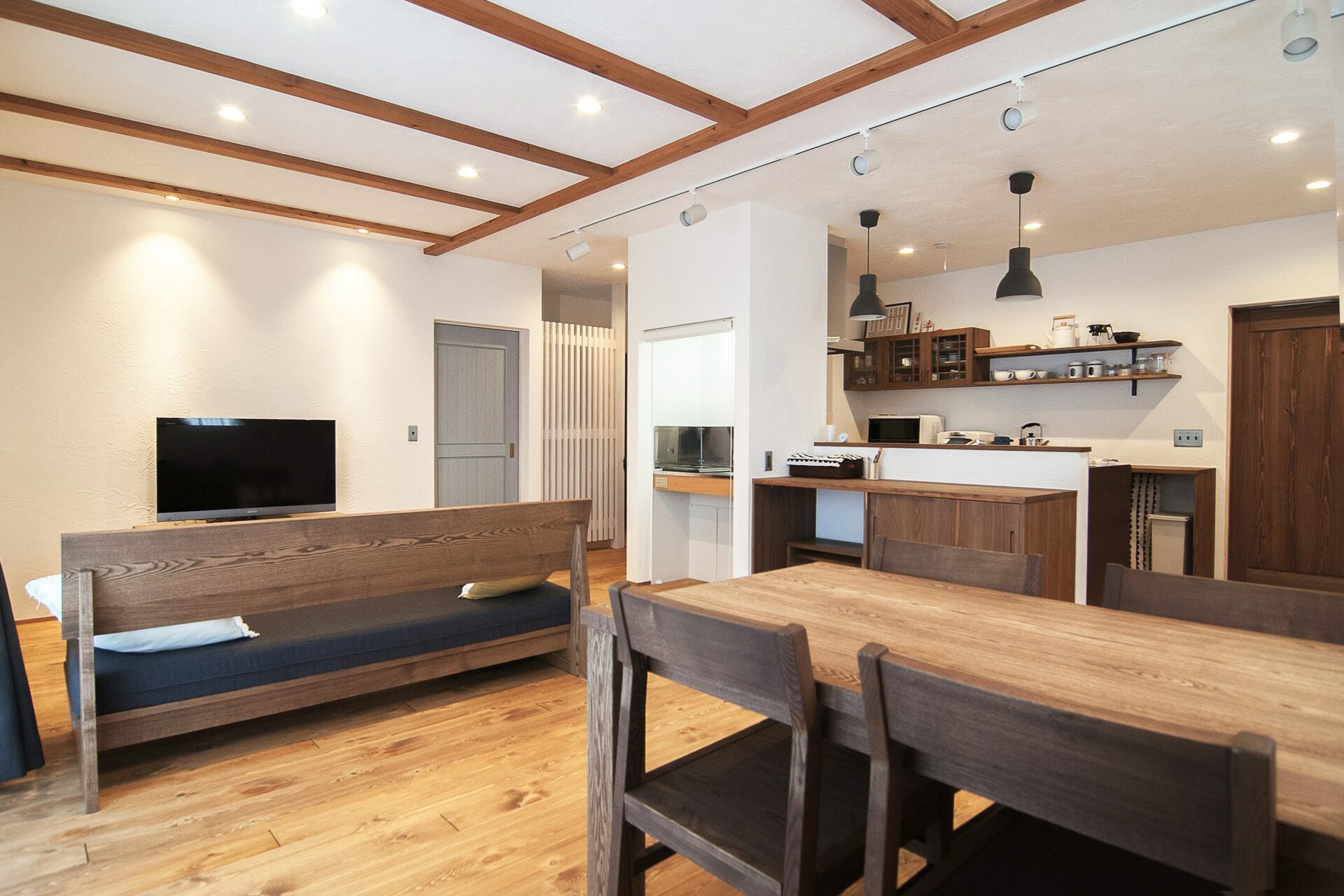 ダイニングセット、ソファ、TVボード、キッチンカウンターは自社の家具工房で製作されたもの。設計時に部屋に合わせ家具も設計するから部屋のトータルコーディネートが実現できます。