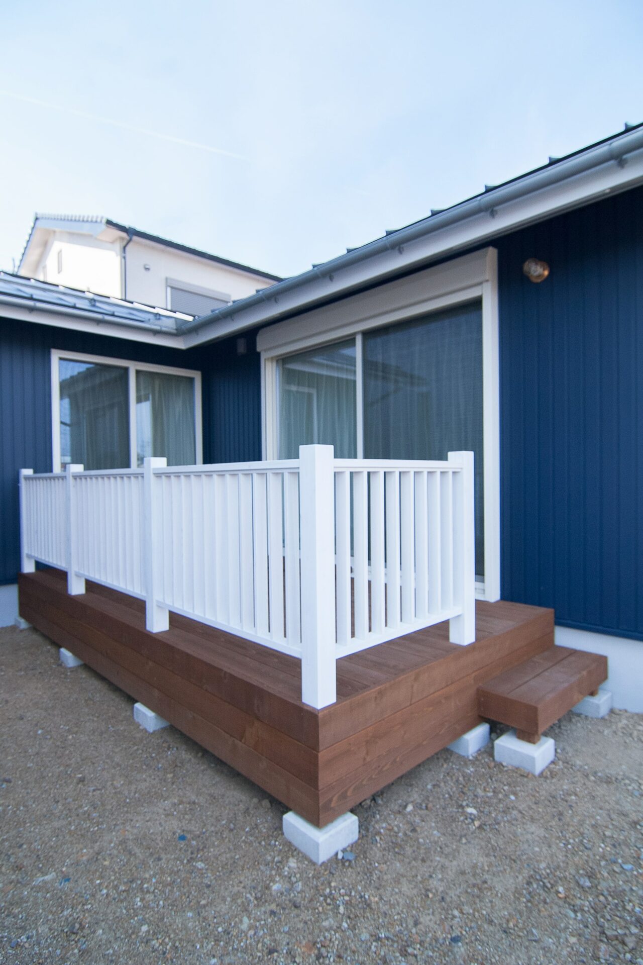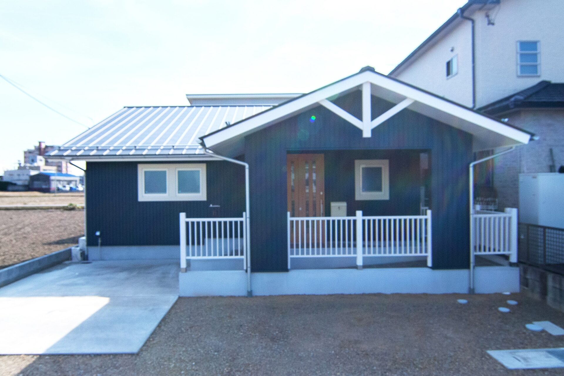 ネイビーのガルバリウムに白の飾り枠が爽やかな、海辺のコテージをイメージしたマリン風の外観です。木製の白い手すりや妻飾りをバランス良く配置することで、カジュアルな雰囲気ながら落ち着きのある外観に。