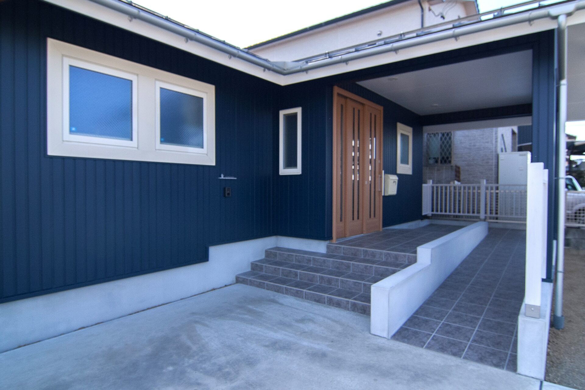 車イスで生活する娘の為にとゆるやかなスロープを設置したポーチ。スロープの上まで屋根を設け、雨の日の車イスの事まで配慮した設計はご家族に好評。玄関戸は三本引戸を採用する事で車イスでも楽に出入りできます。