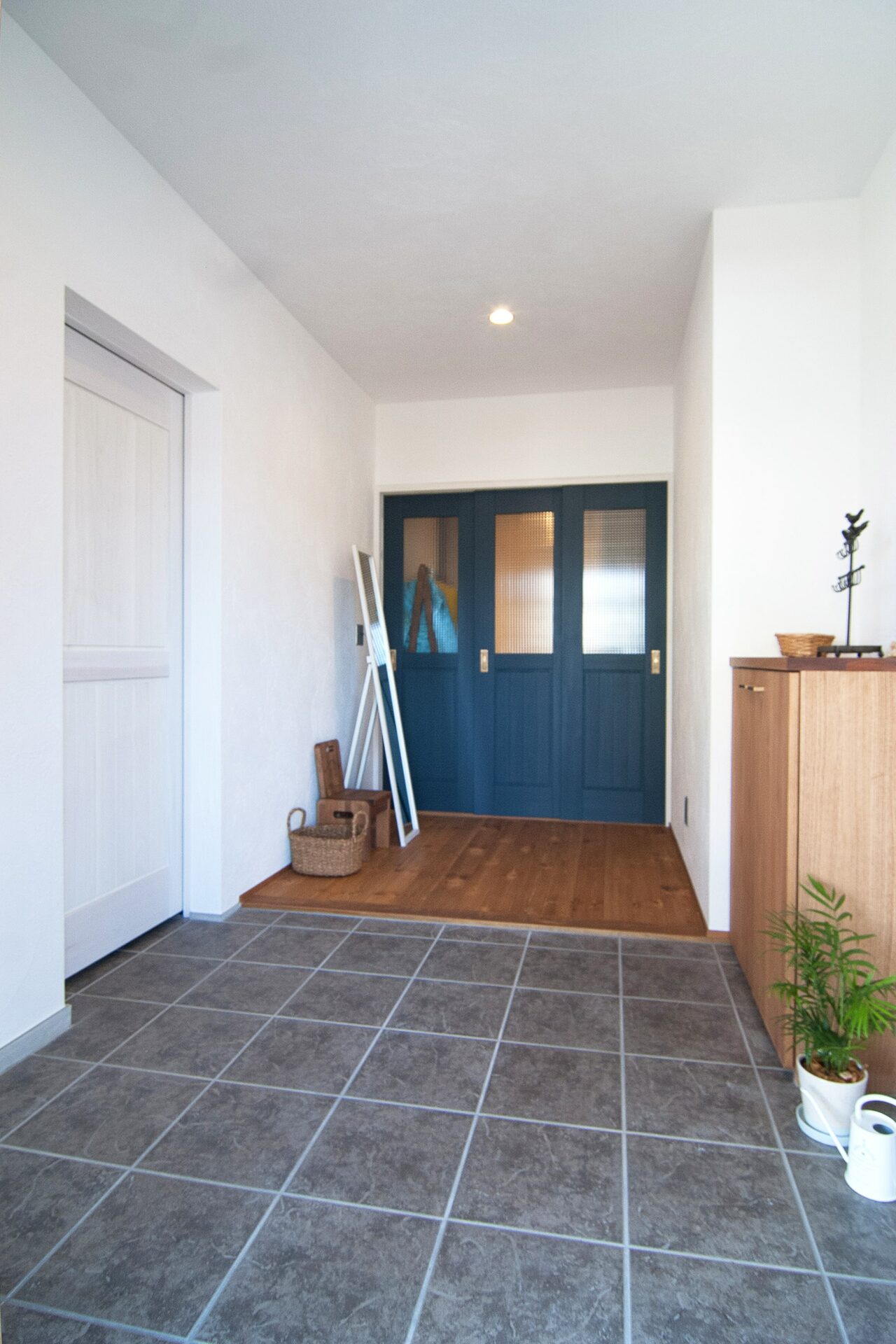 玄関とホールの段差を極力なくしたり、リビングと玄関ホールを繋ぐ建具を三本引戸にしたりとバリアフリーに特化したお住まいです。玄関は外出用車いすを一台置いても通る事ができるほど広々としてます。隣に玄関収納を併設し、物が溢れがえりがちな玄関もすっきり。ネイビーの三本引戸建具は自社で作られたものです。