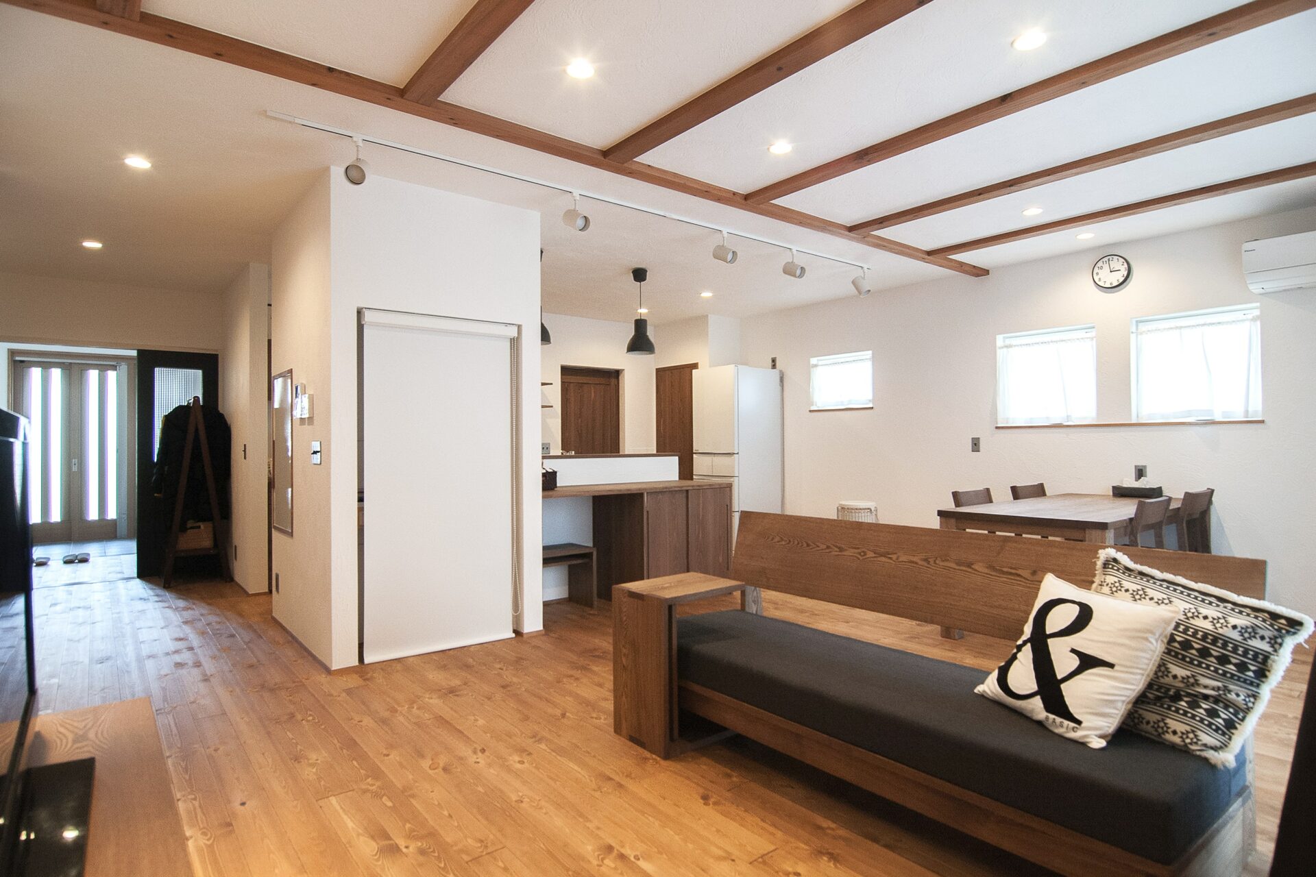 無垢材や漆喰等の自然素材をふんだんに使ったLDKはいつも空気が爽やか。広々とした玄関ホールからリビングへの通路は車イスが通る事を考えた設計です。優しさあふれる間取りを実現しながらツーバイフォー構造で平屋でも比較的お求めやすい価格となっています。