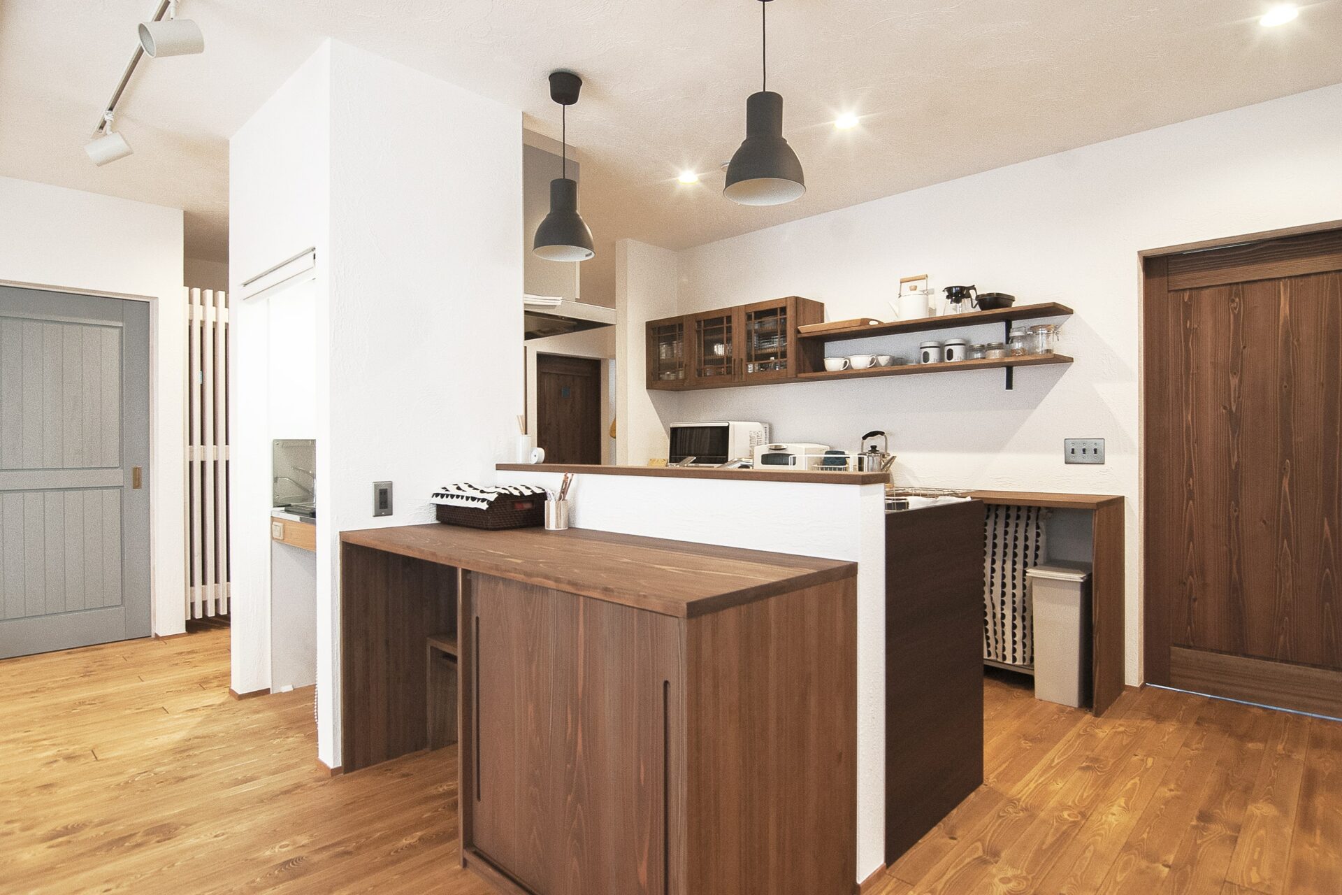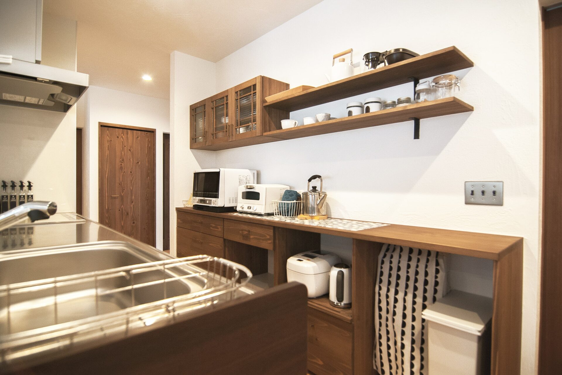 キッチン収納も造作で作られたものです。見た目よりも収納力があり、Kさんの使いやすいような高さに設計されています。