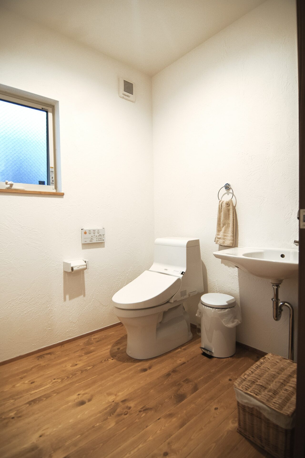 車イスでも楽に入れる広々としたトイレ。壁・天井全てを消臭効果のある漆喰塗りにしているので、臭いがこもらずいつも爽やか。202
