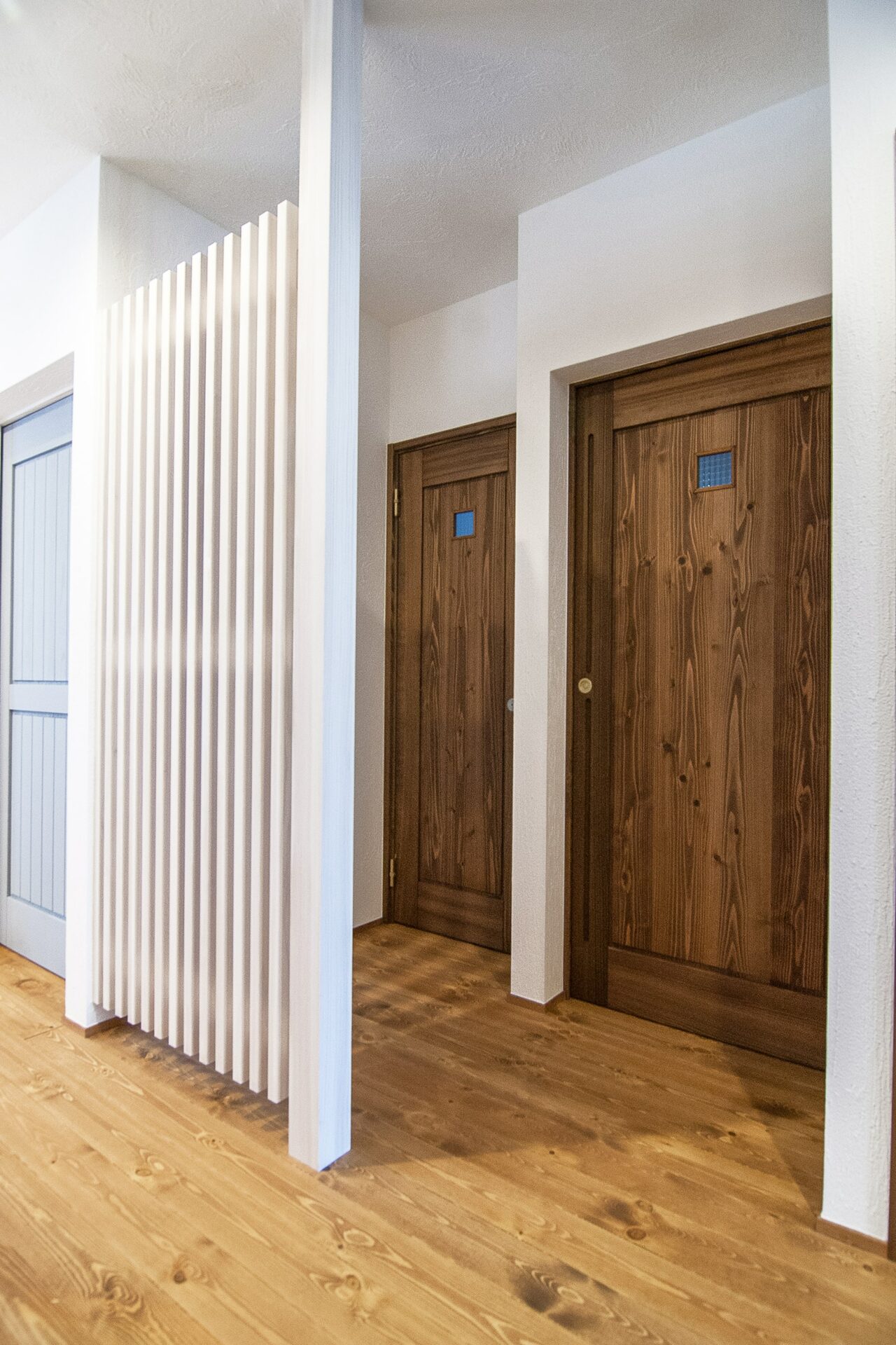 トイレを2ヶ所に設置。一つは車イスが入っても動き回れるほどの広々としたトイレ。もう片方は、トイレに時間がかかる娘を見越し、家族全員が快適に過ごせるように設置。手前に壁の白と合わせた可愛らしい格子をつけることで、リビングからは目隠しとなっています。同じ空間なのにしっかり仕切られているので、とてもお気に入りとのことです。