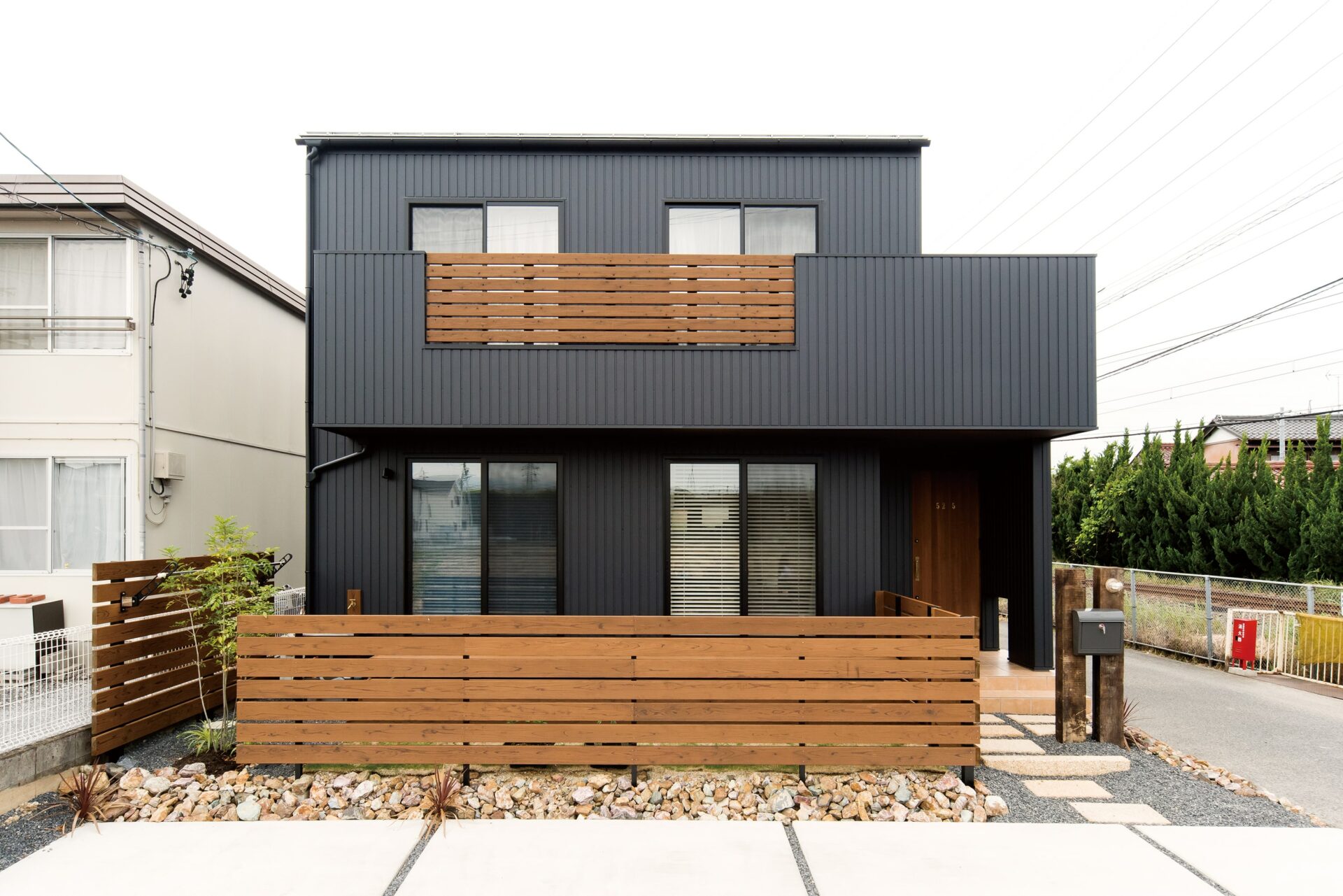 黒のガルバリウム鋼板に木製のフェンスや造作ドアを組合せたスタイリッシュな外観。玄関には真鍮製のランプやアンティークな郵便受けをチョイスするなどレトロな雰囲気にこだわっています。腐りにくい無垢材を使用するなどメンテナンスの容易さにも配慮しました。