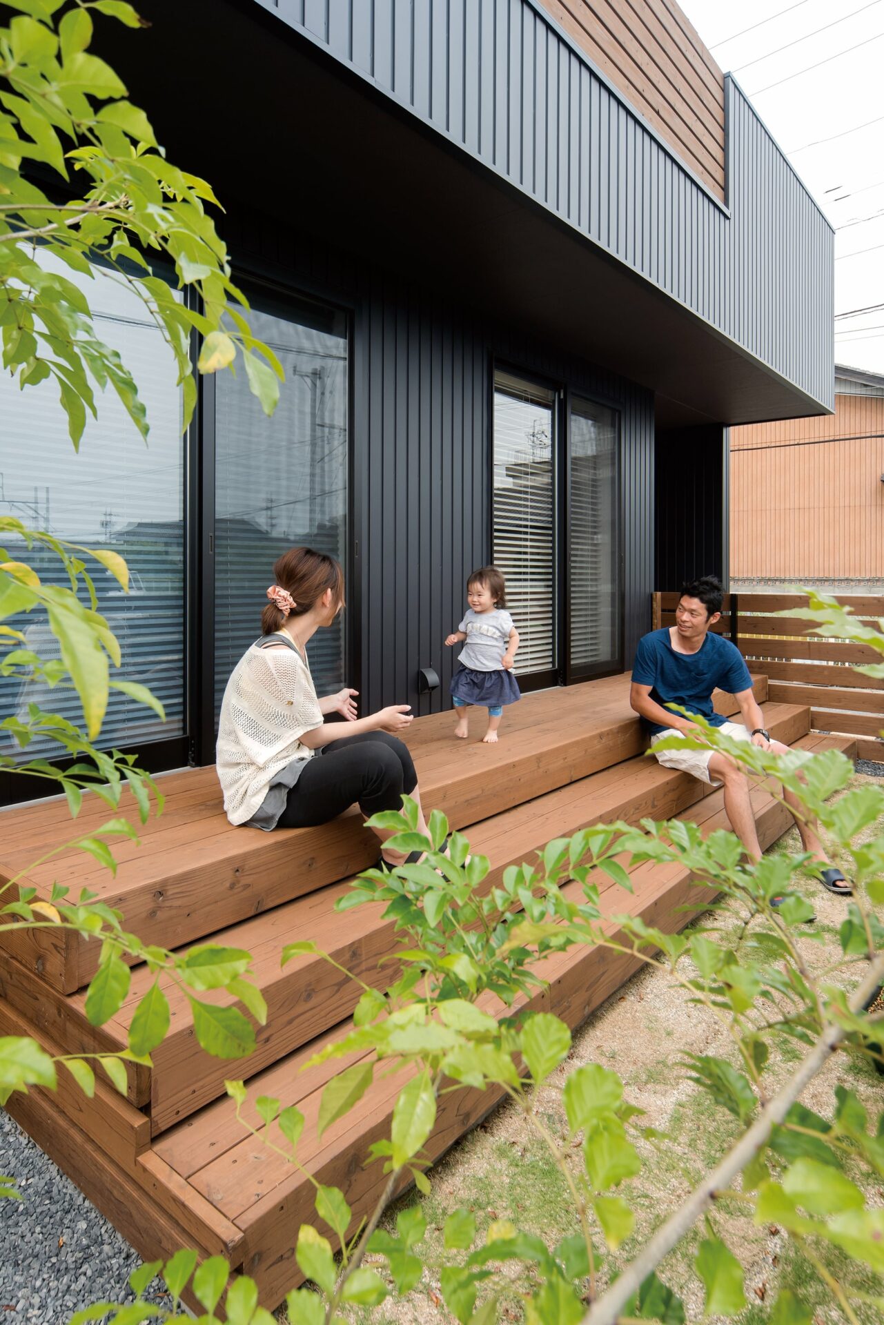 ベンチのように使える階段状になったウッドデッキは、バーベキュー等で大勢の友人が集まった時に大活躍。庭は目隠しのフェンスで囲まれているので、近隣からの目線も気にならないのだそう。