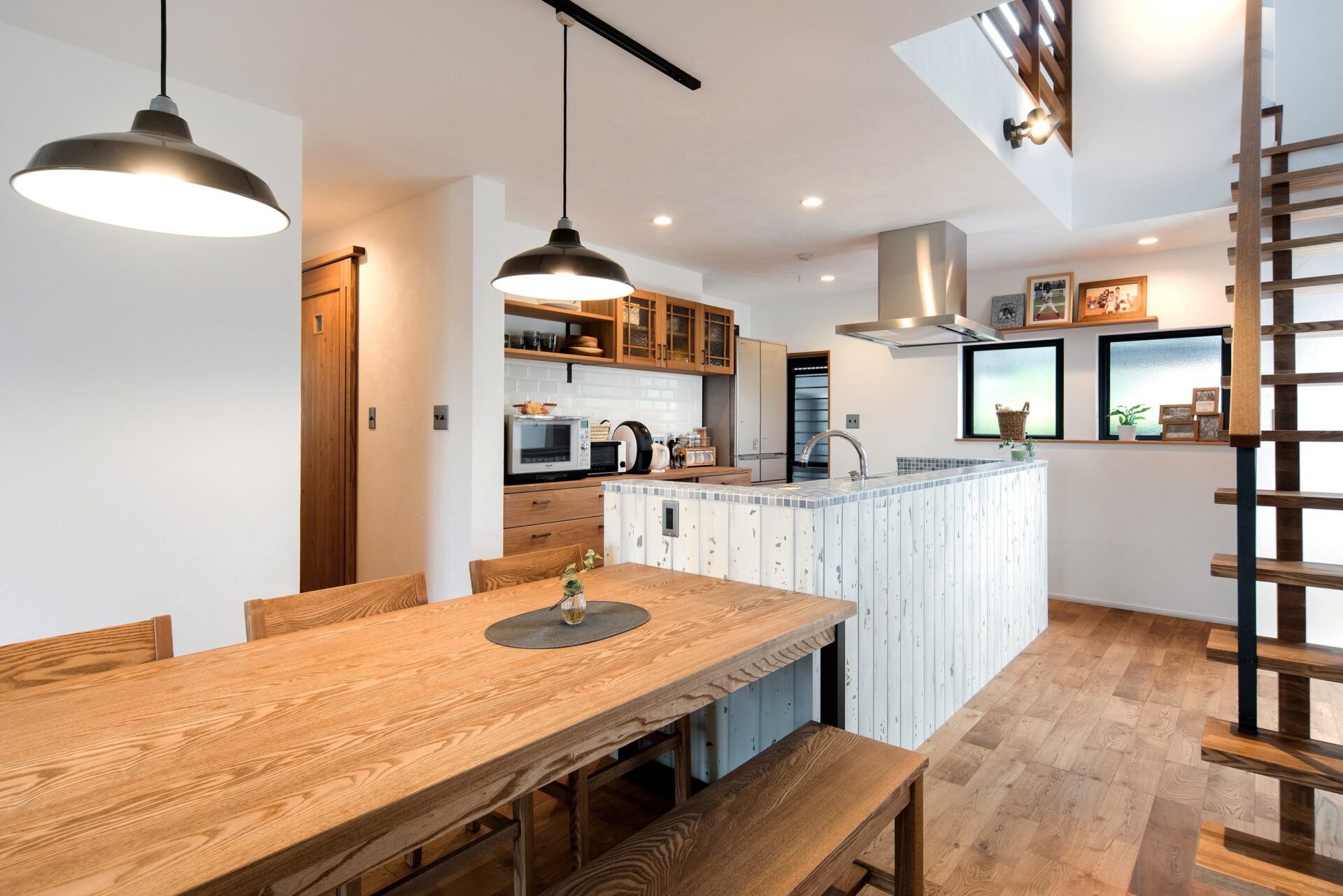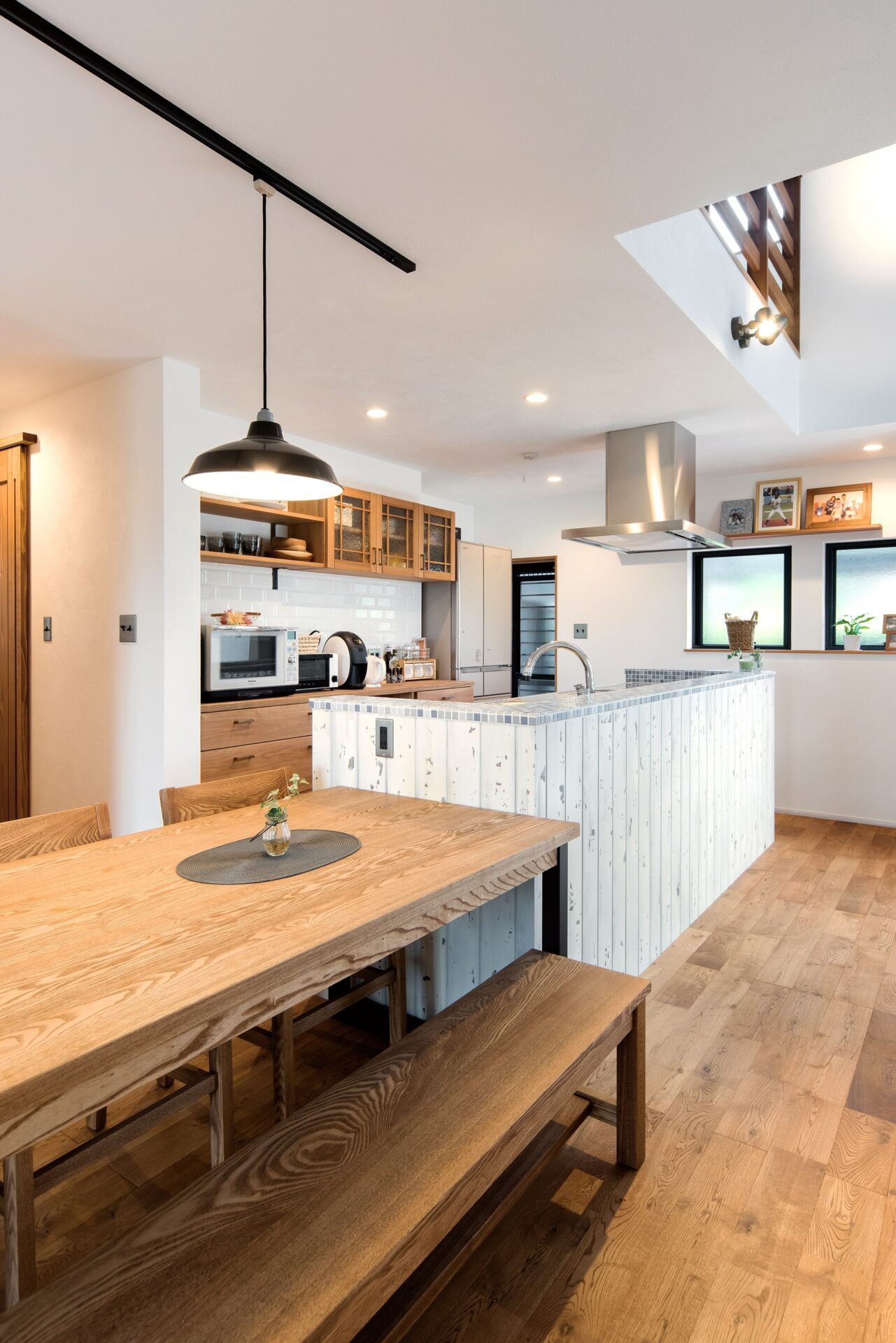 吹抜けから明るい光が降り注ぐ爽やかなダイニング・キッチン。「DKの並びや照明の雰囲気等、雑誌を参考にコーディネートして頂けました。予想をはるかに超える仕上りに大満足です。また、正面の窓から眺められる、風に揺れる緑の中を電車が走り抜ける風景もお気に入りです」とM様。