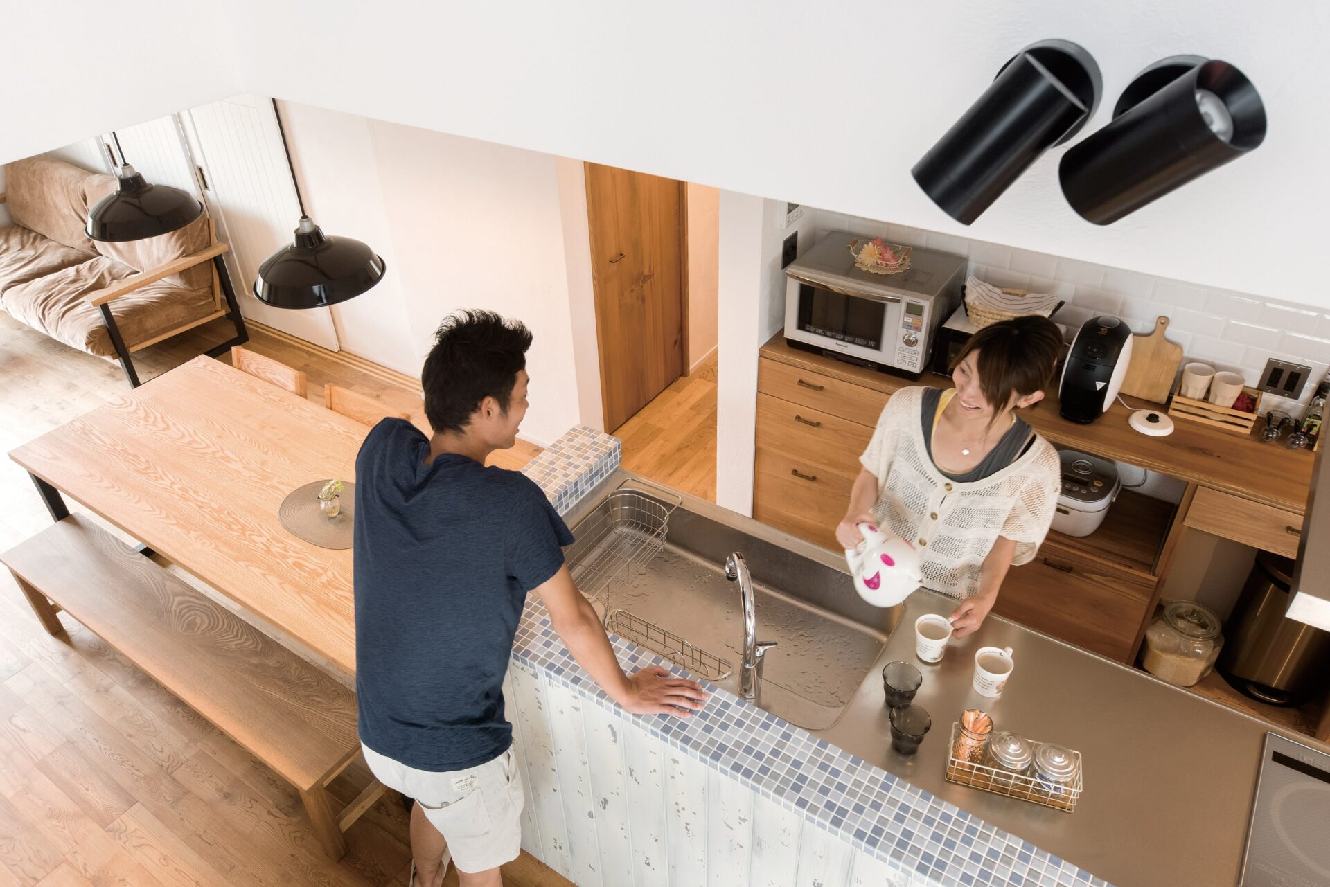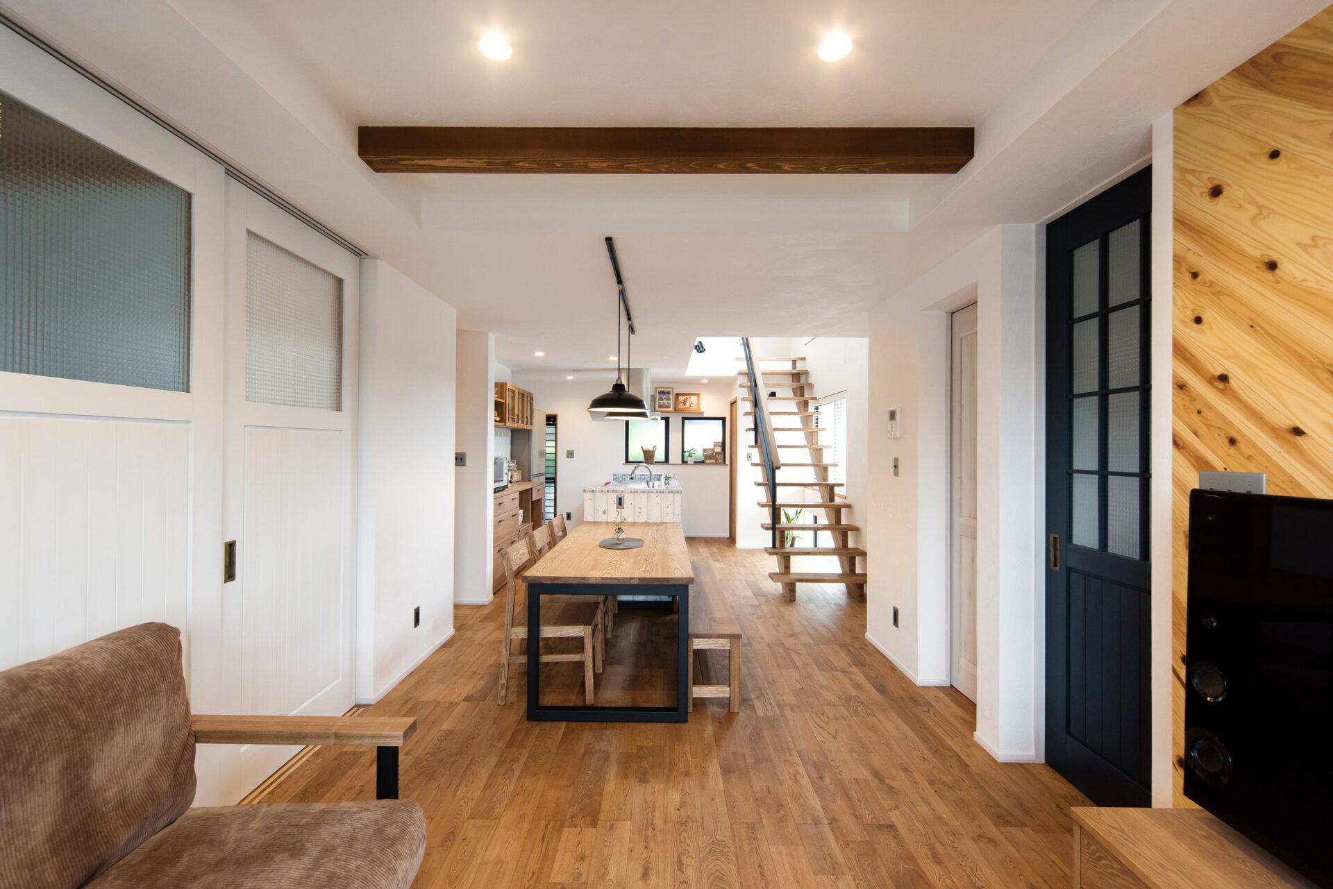 無垢材と漆喰を使い開放的な西海岸スタイルを表現したM様のお住まい。建具やキッチンなど細部まで職人の手でエイジング加工した空間はヴィンテージ感たっぷり。「新築だから大切に住むのではなく、自分らしくラフに暮らしたい」そんな想いに応えました。