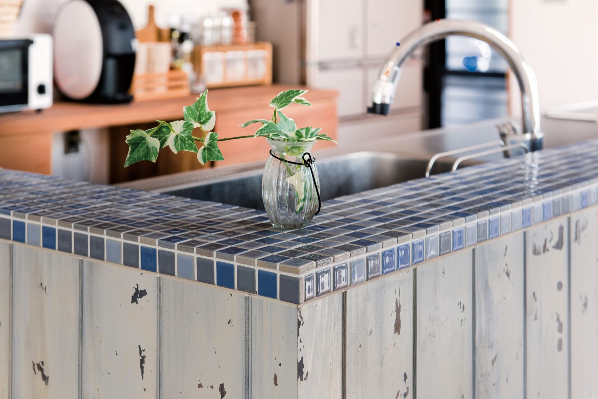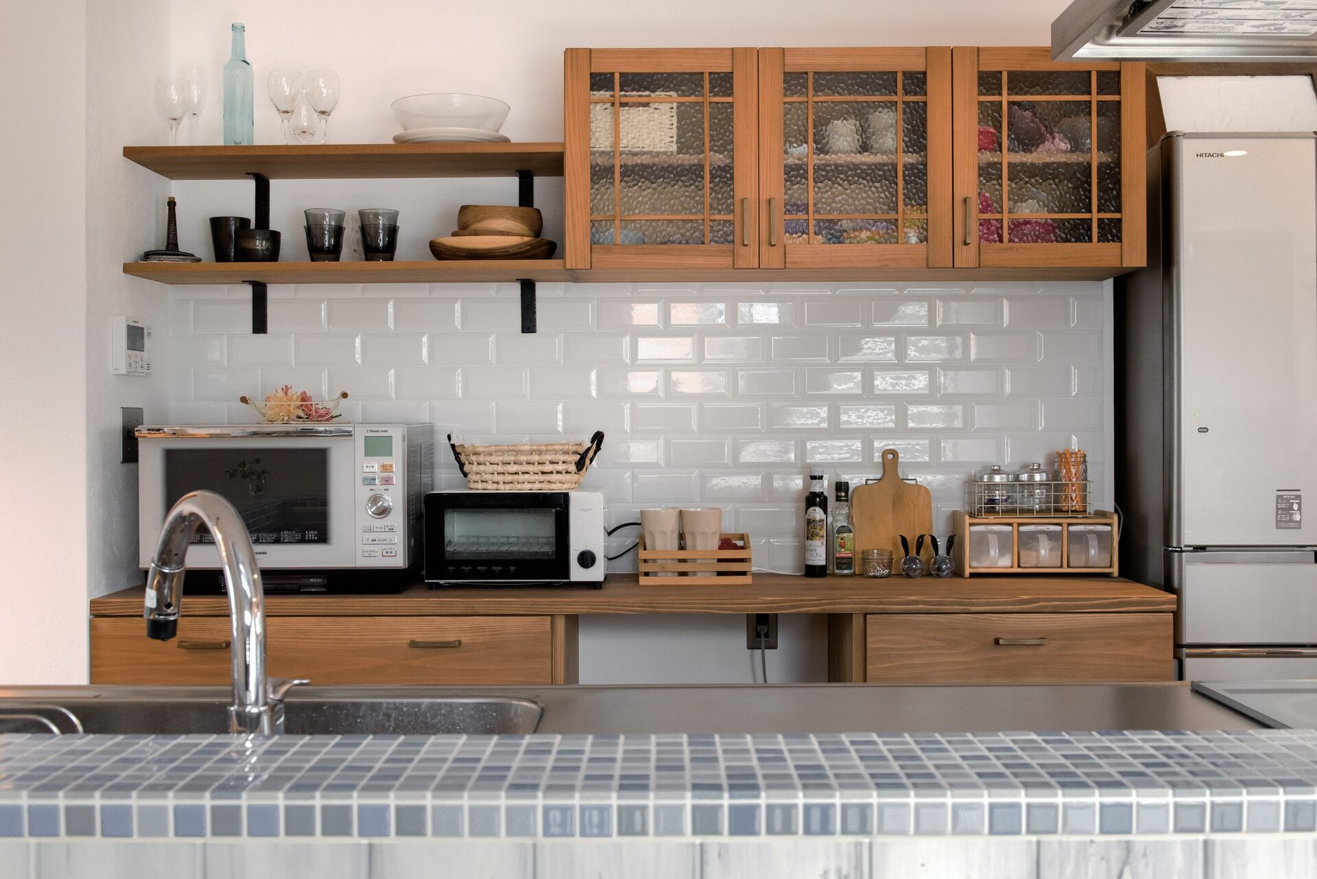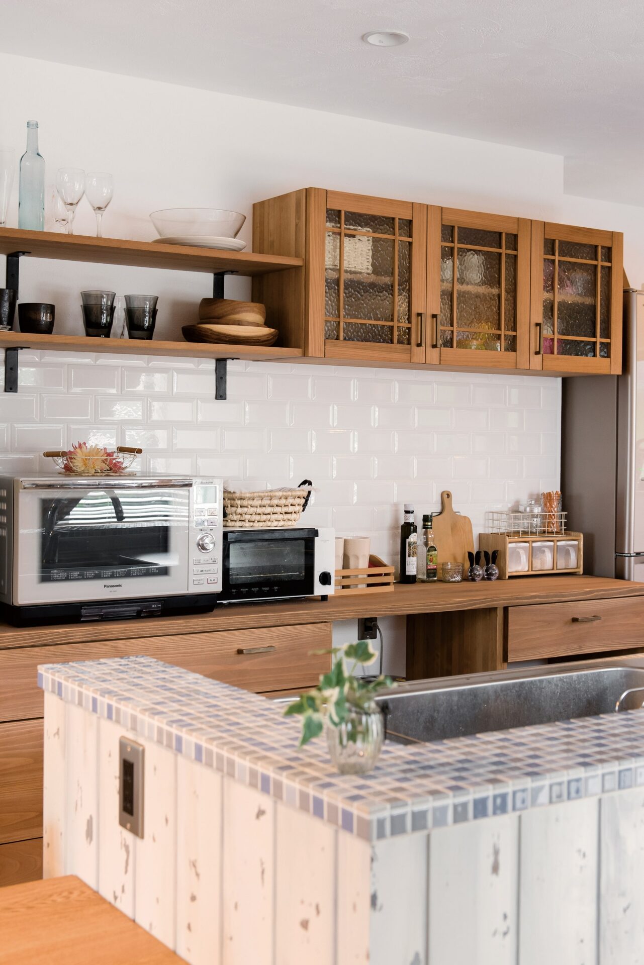 雑誌を参考にオーダーした可愛らしいキッチン収納。面取りされた白タイルもアンティークな雰囲気によく似合っています。