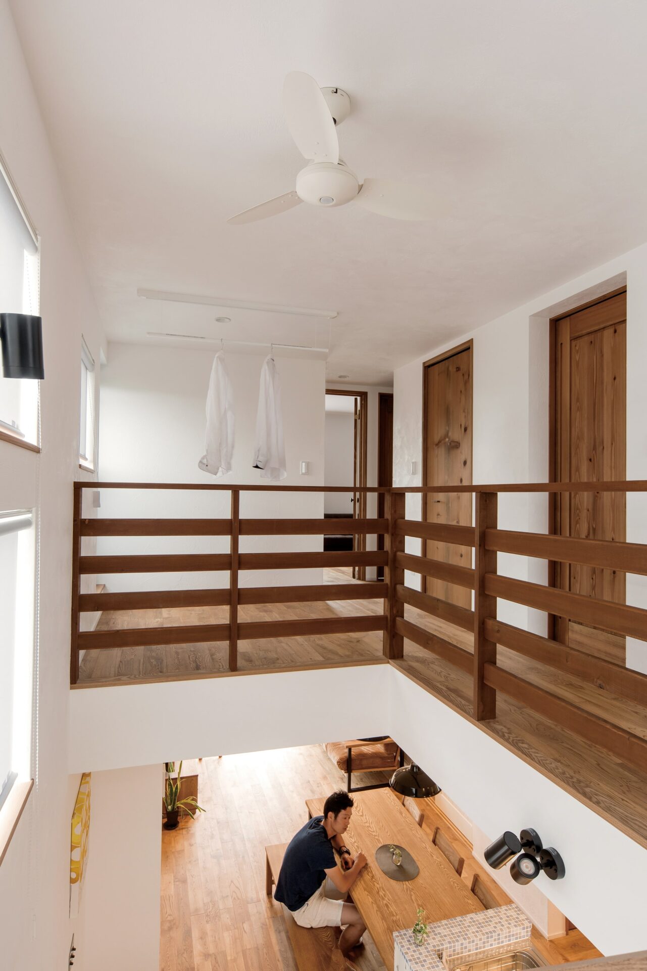 調湿に優れた漆喰と無垢材の空間は梅雨時もジメジメせず、洗濯物を干してもすぐに乾くのだそう。「室内干し特有の嫌な臭いもせず、木の香りを邪魔しないので、とても心地いいですよ」