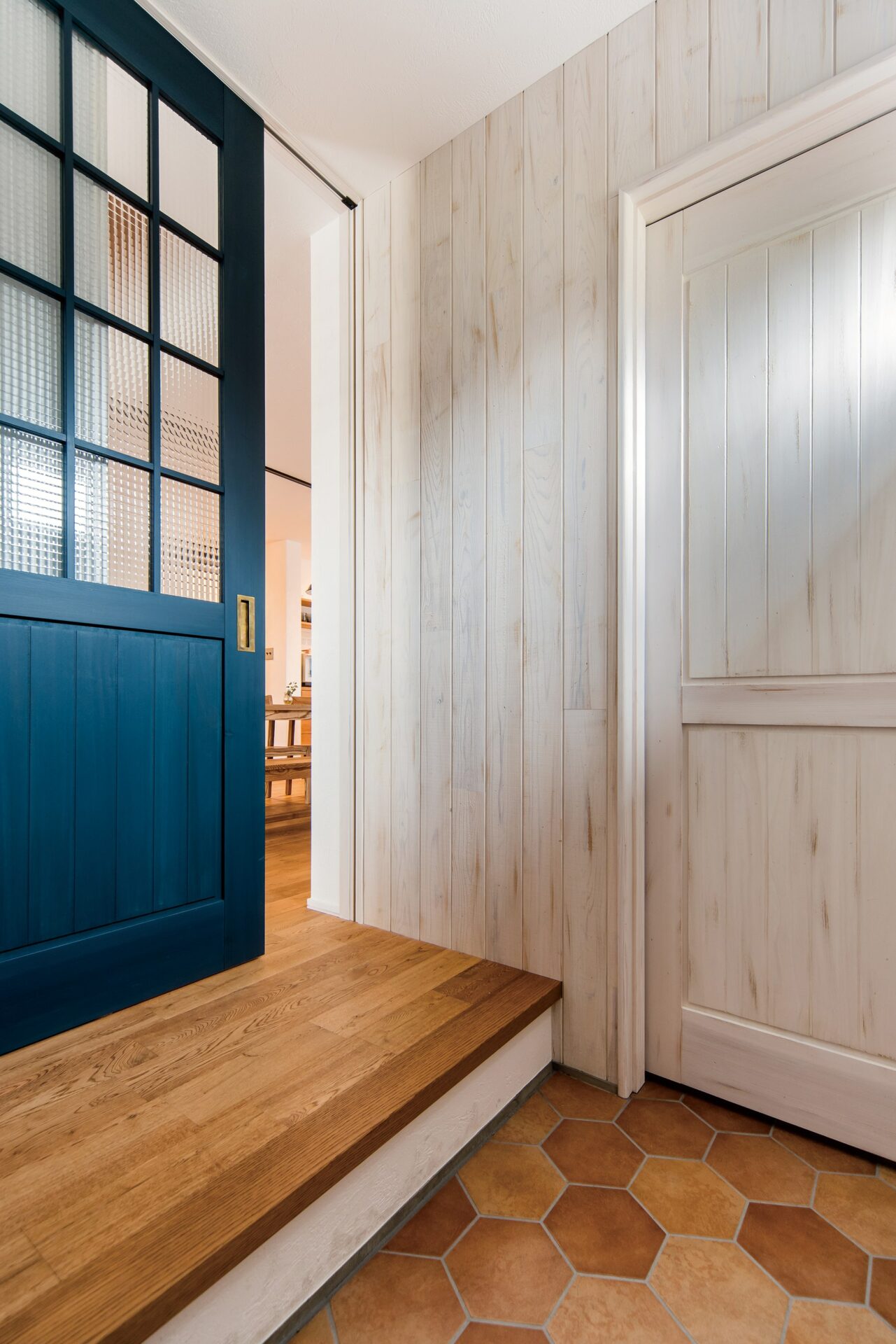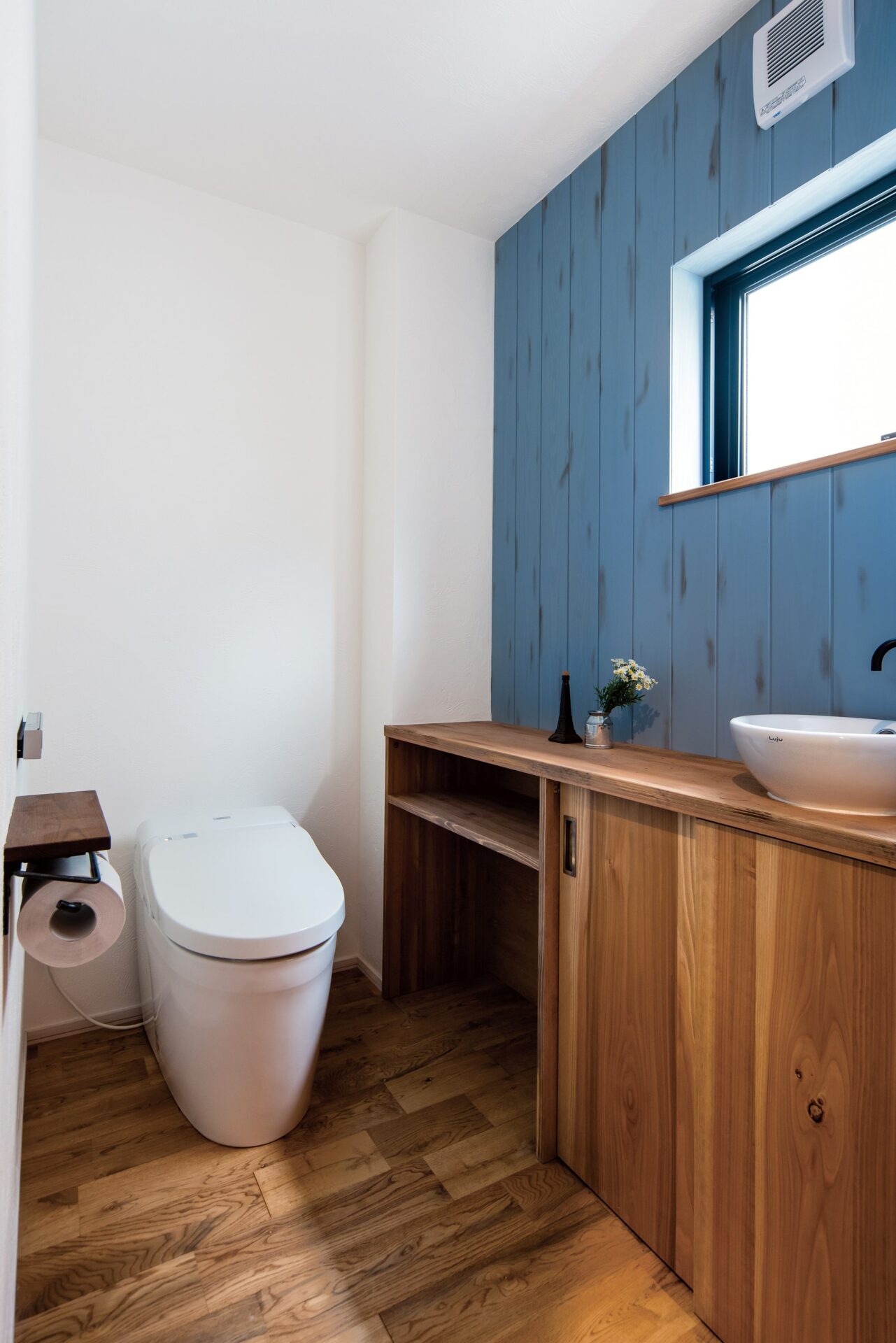 青い壁と造作カウンターがお洒落なトイレは、漆喰の消臭効果で芳香剤いらずなのだとか。トイレの壁もエイジング加工が施されています。
