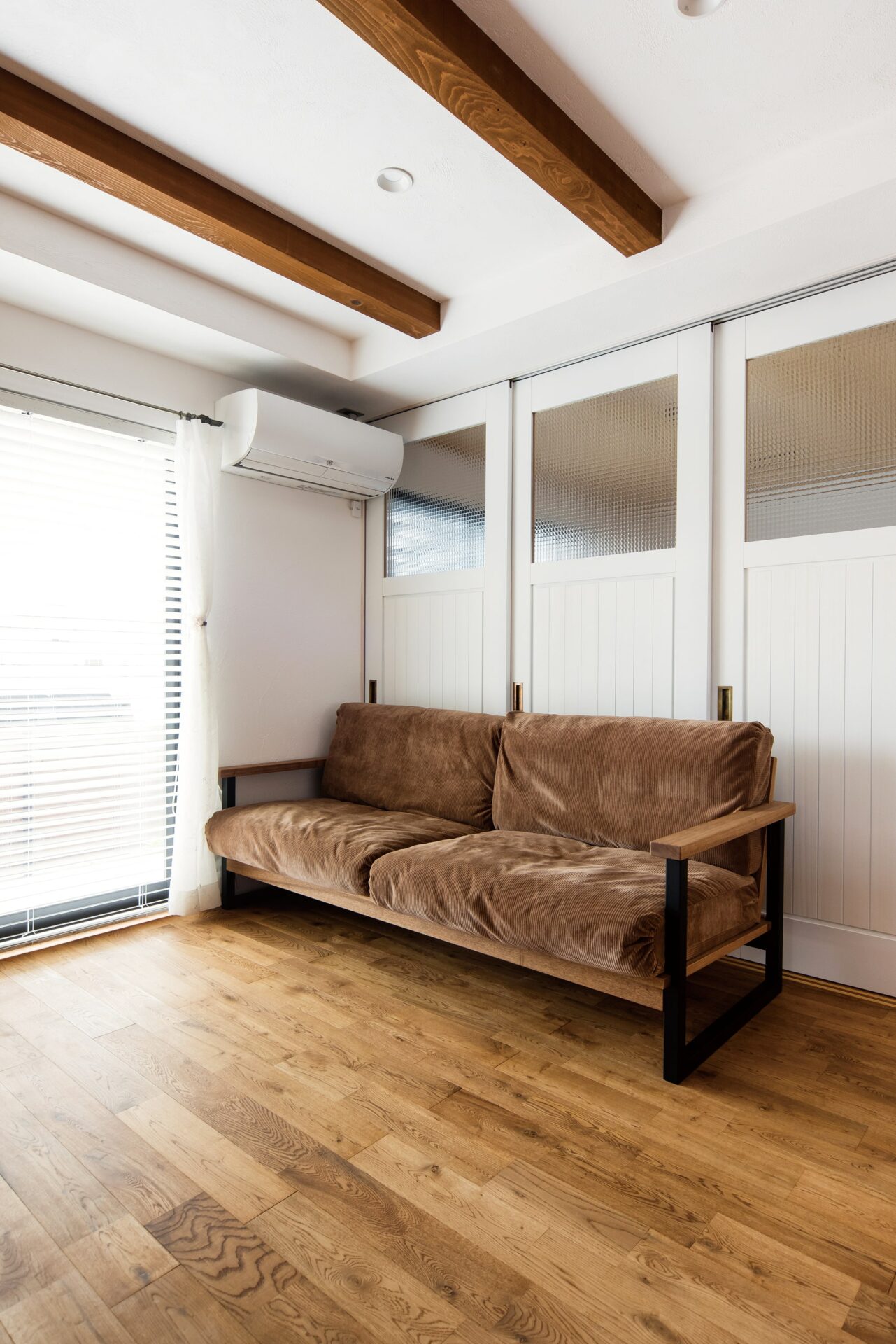 座り心地のよい、どっしりとしたソファも自社で作っています。アイアンと無垢材の組み合わせがマリンスタイルの空間によく馴染みます。大勢の仲間が集まるときは、背面の戸を開け放つことで畳コーナーと繋がる大空間が広がります。