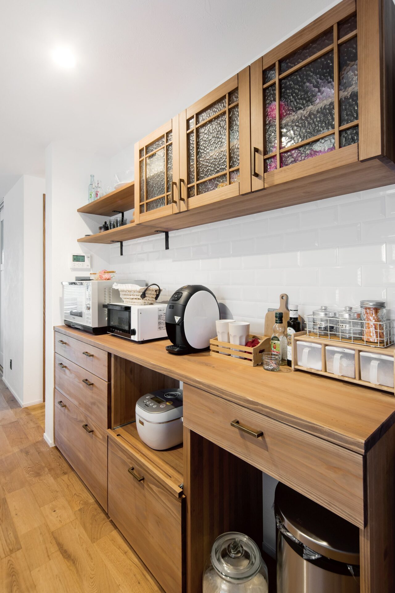 キッチン収納は、夫人の身長に合わせた棚の高さから、家電の配置場所まで細かく指定して設計されているので「使い勝手も抜群!」と好評。