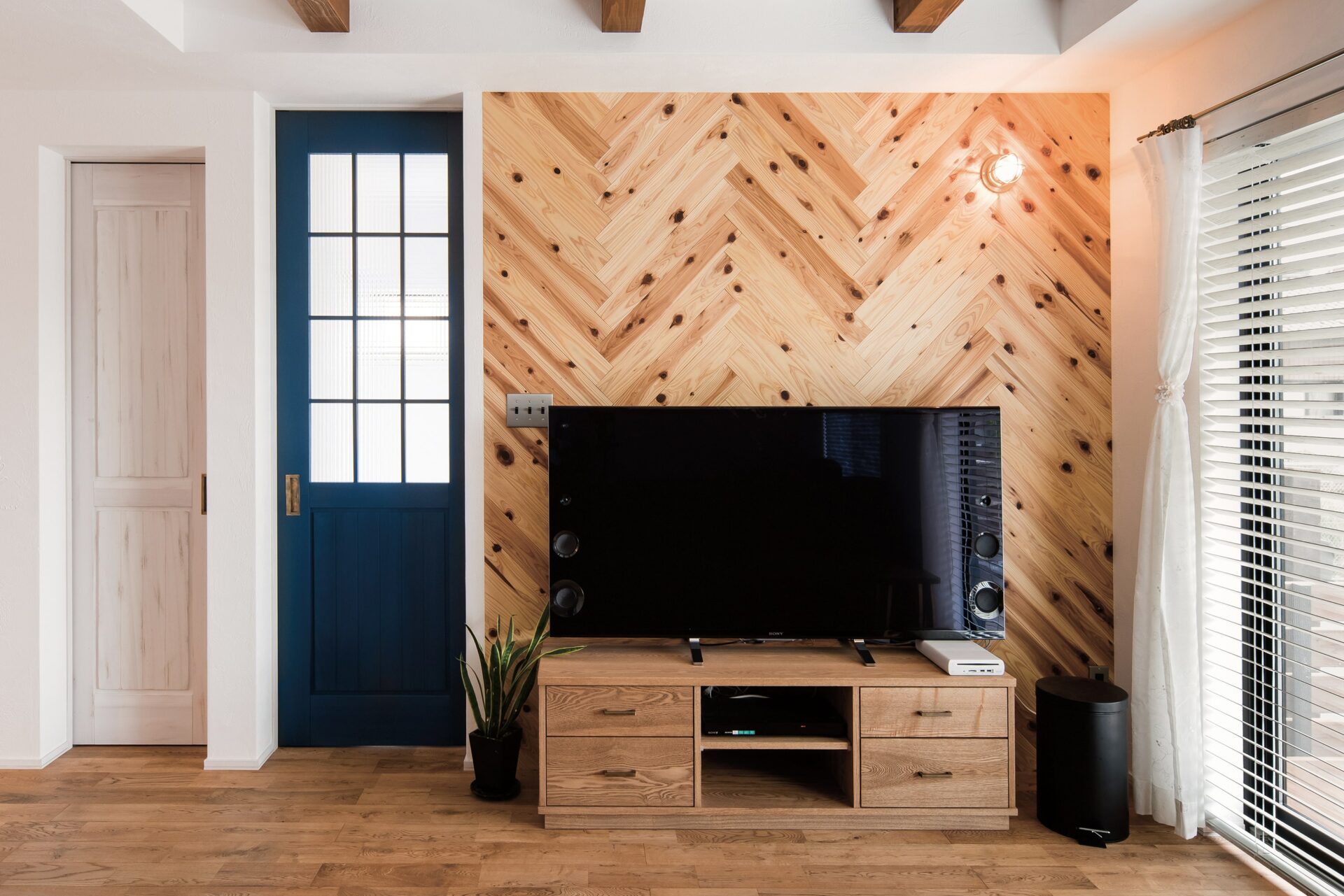 ハニー塗装仕上げのヘリンボーンのアクセントウォールや、マリンブルーのオリジナル建具など、リゾート感を演出しています。建具もTV台も自社で作られたものです。