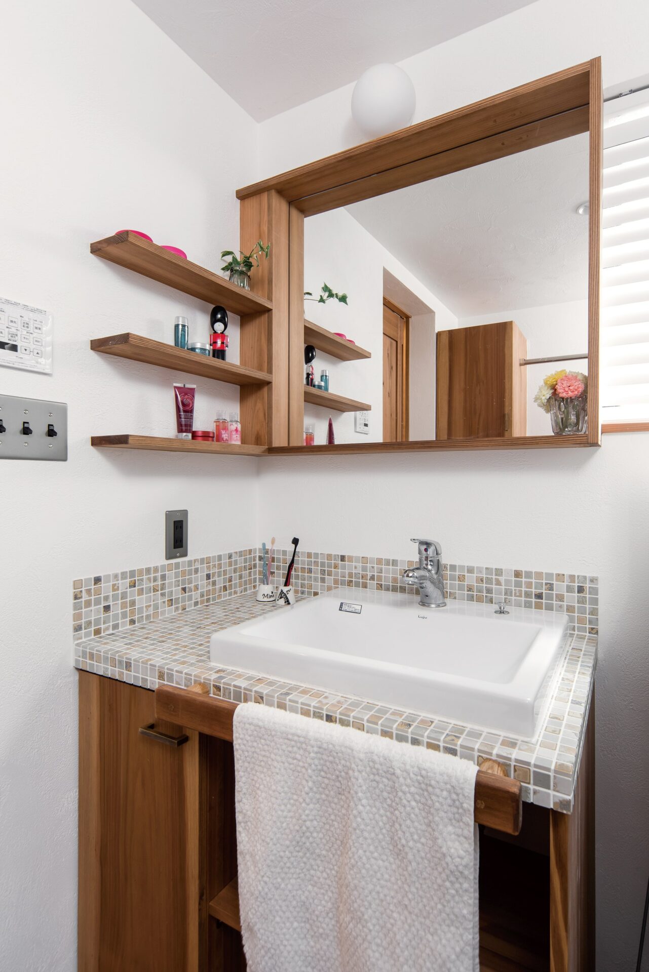無垢材と天然石のモザイクタイルで素材感豊かな洗面台は、レトロなアメリカンスイッチともよくマッチしています。漆喰の消臭殺菌作用で水廻りも爽やか。