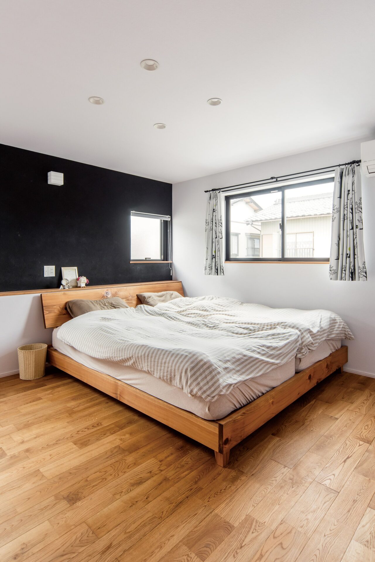 ネイビーのアクセントウォールがお洒落な寝室。気密・断熱性が高いので、夏も冬もぐっすりと眠れるのだそう。また、ベッドは長身のMさんに合うマットレスを基に設計。「既製品に無いサイズで手放せません」