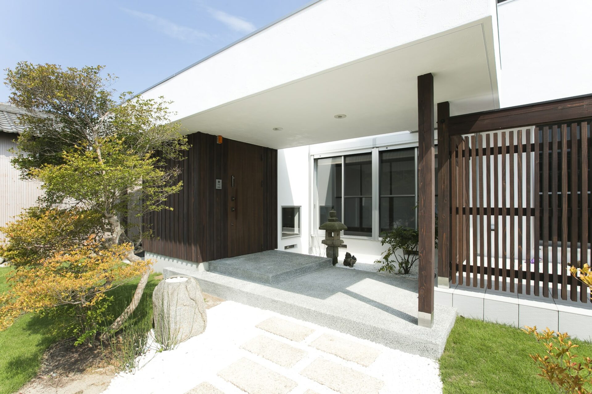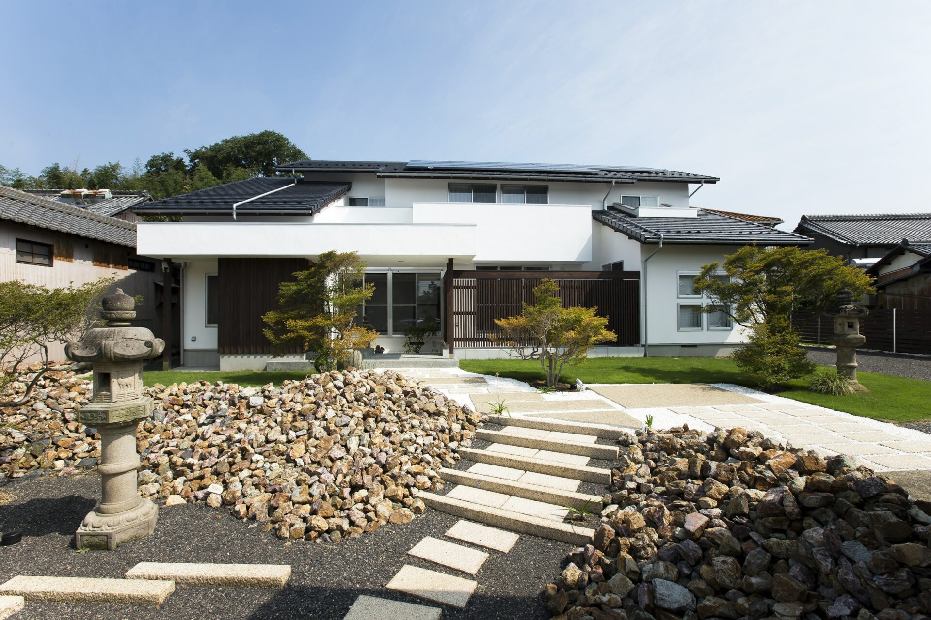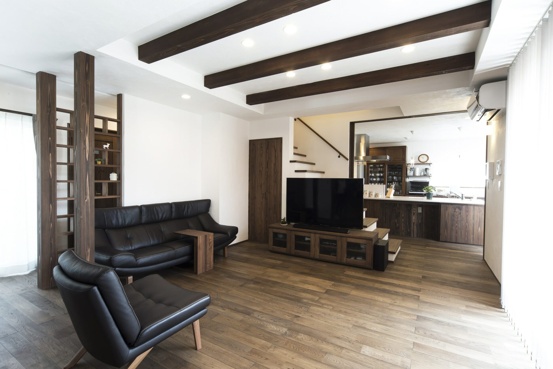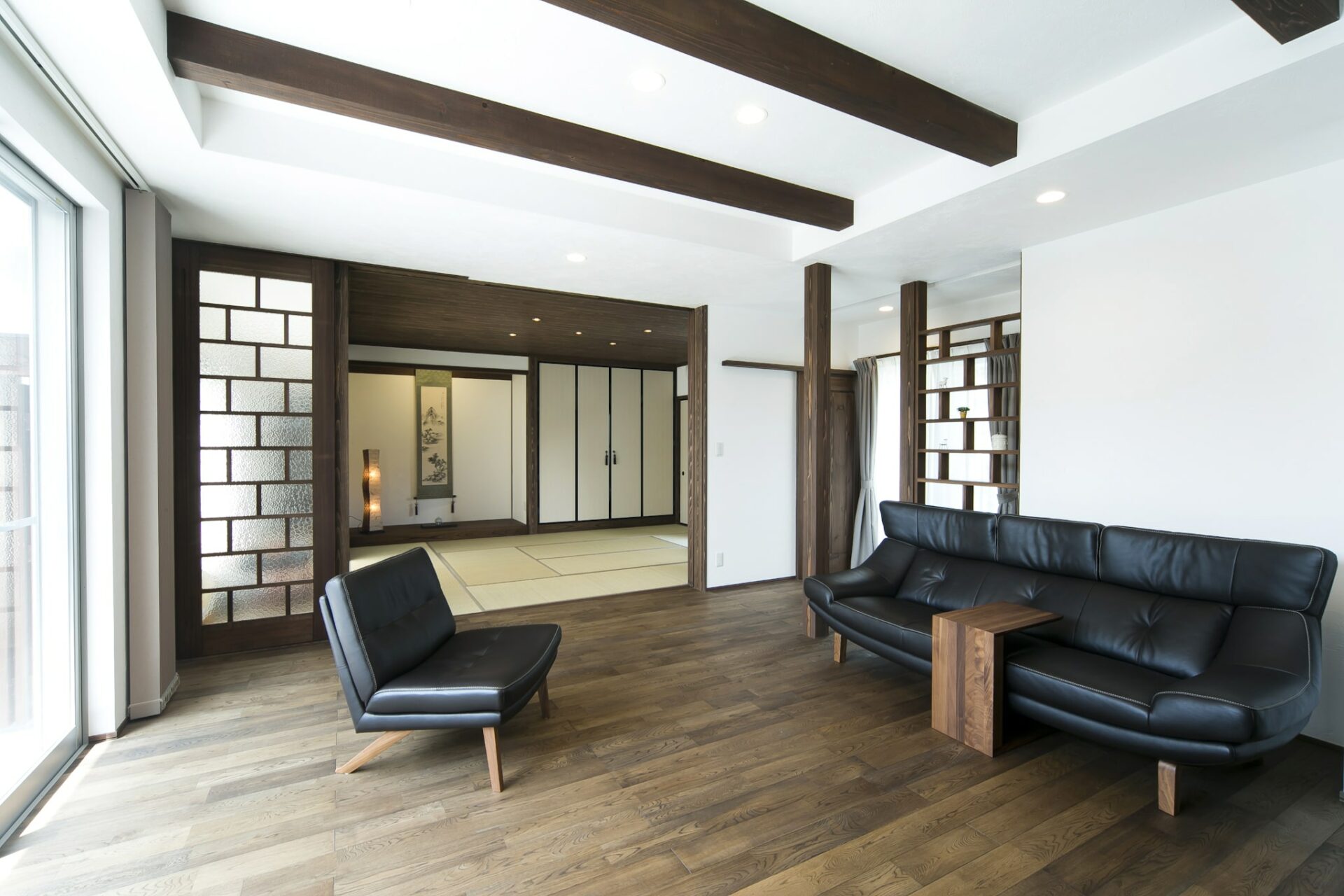 ソファでくつろぐ和モダンスタイルの岐阜県各務原市のM様邸。「木を使った和モダンに強い会社を探していたところ、見つけたのが同社でした。」江戸時代から続く立派な門が迎える、歴史あるお住まい。「当初は改築予定でしたが『予算内に収めるから新築に』というご提案を頂きました。有難かったです。