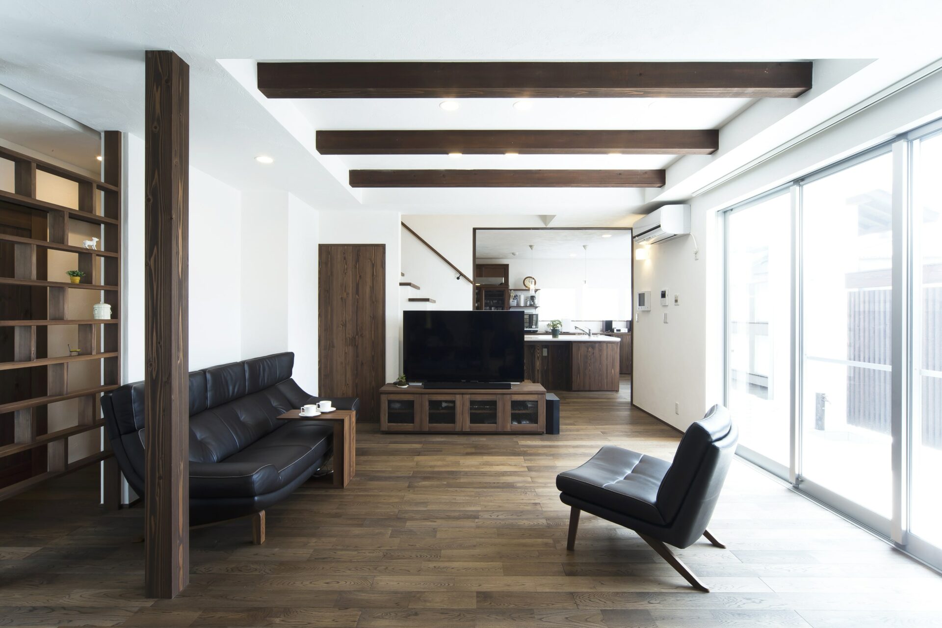 天井や壁は純白の漆喰塗りで、天気の悪い日でも柔らかい光に満たされています。一段高くした天井に見える梁で開放感あるリビングに。