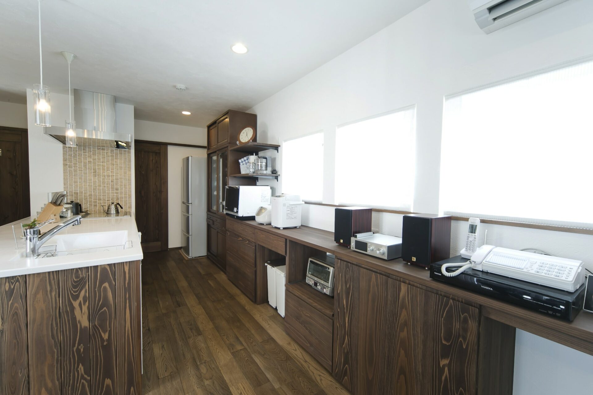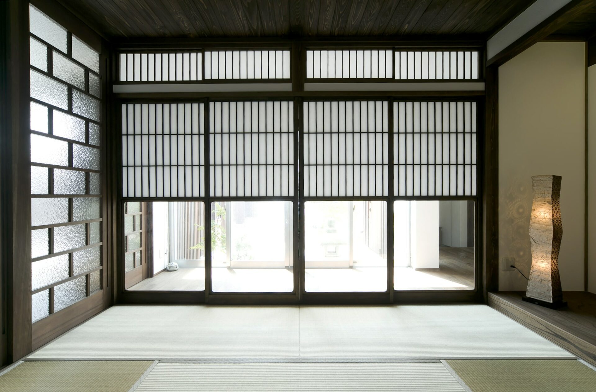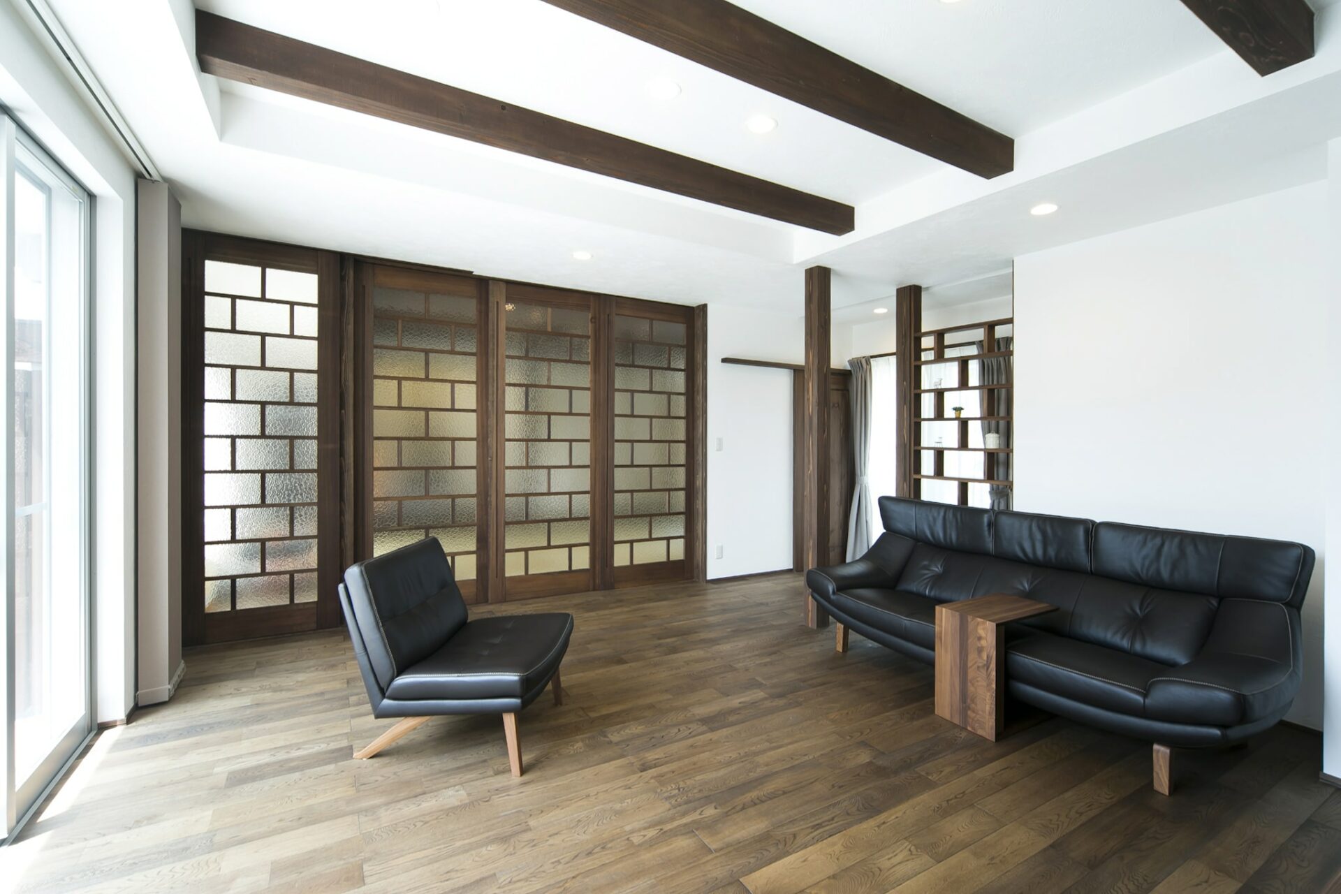 ダーク色の木目とどこか懐かしさを感じるガラス戸が特徴的です。建具も本社自社工房でつくられているため様々なデザインからお選びいただけます。