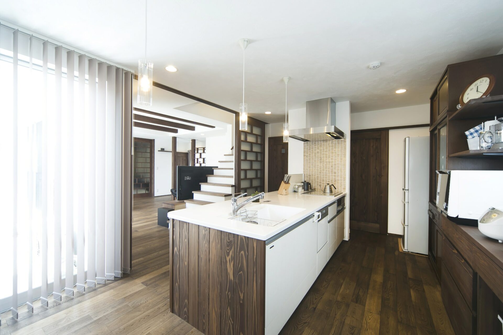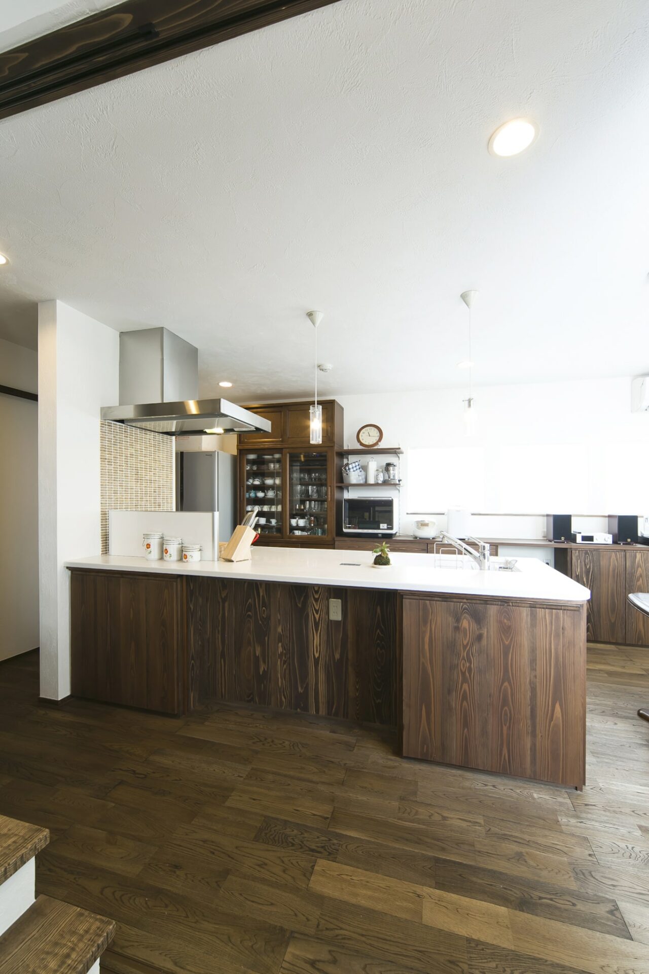 パンを焼いたり、パスタを作ったり…家族と料理をする機会が増えたというアイランド型のキッチン。既製品でも浮いてしまわないように、無垢材で囲うなど、違和感を感じさせないコーディネートになっています。
