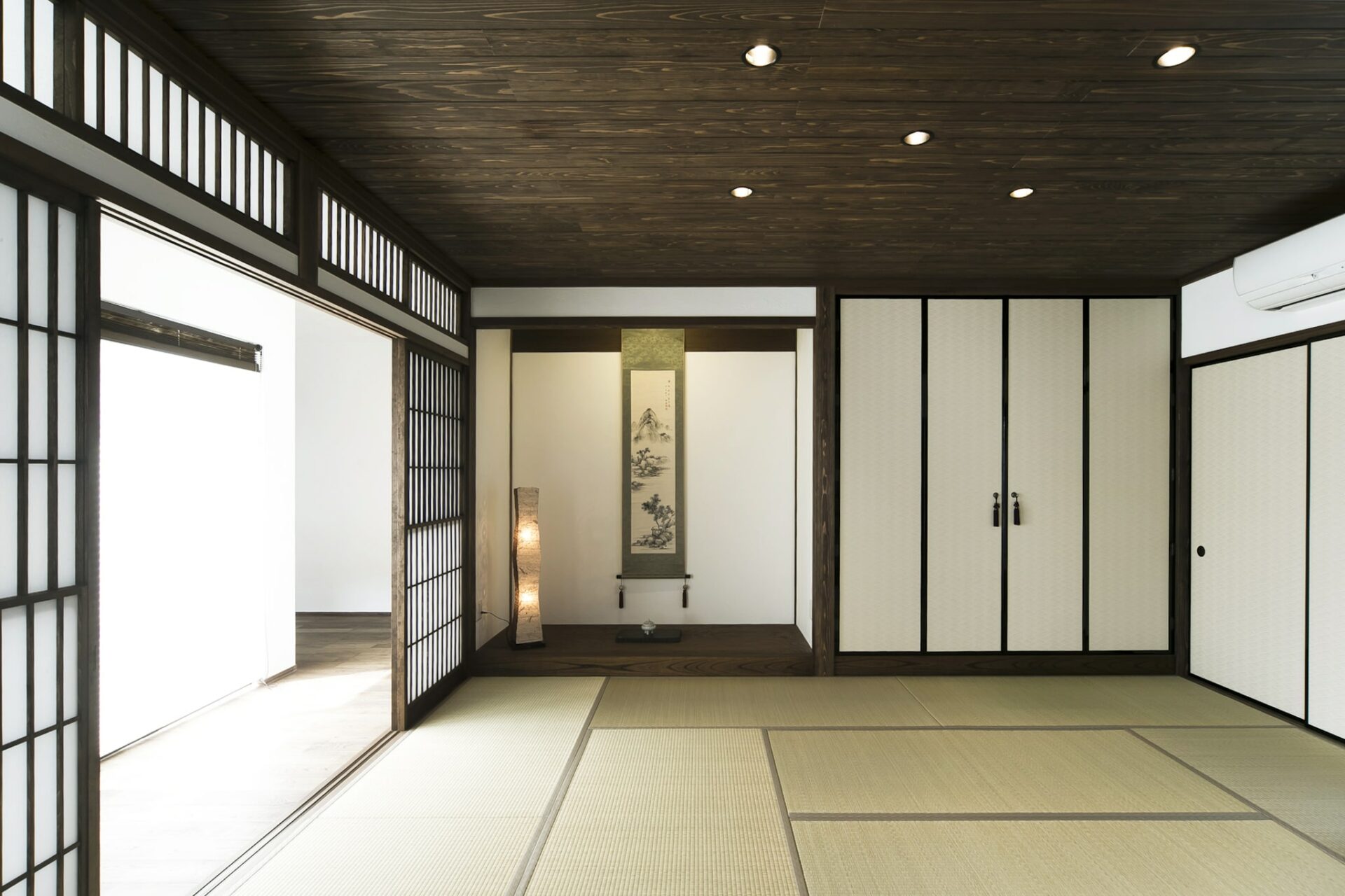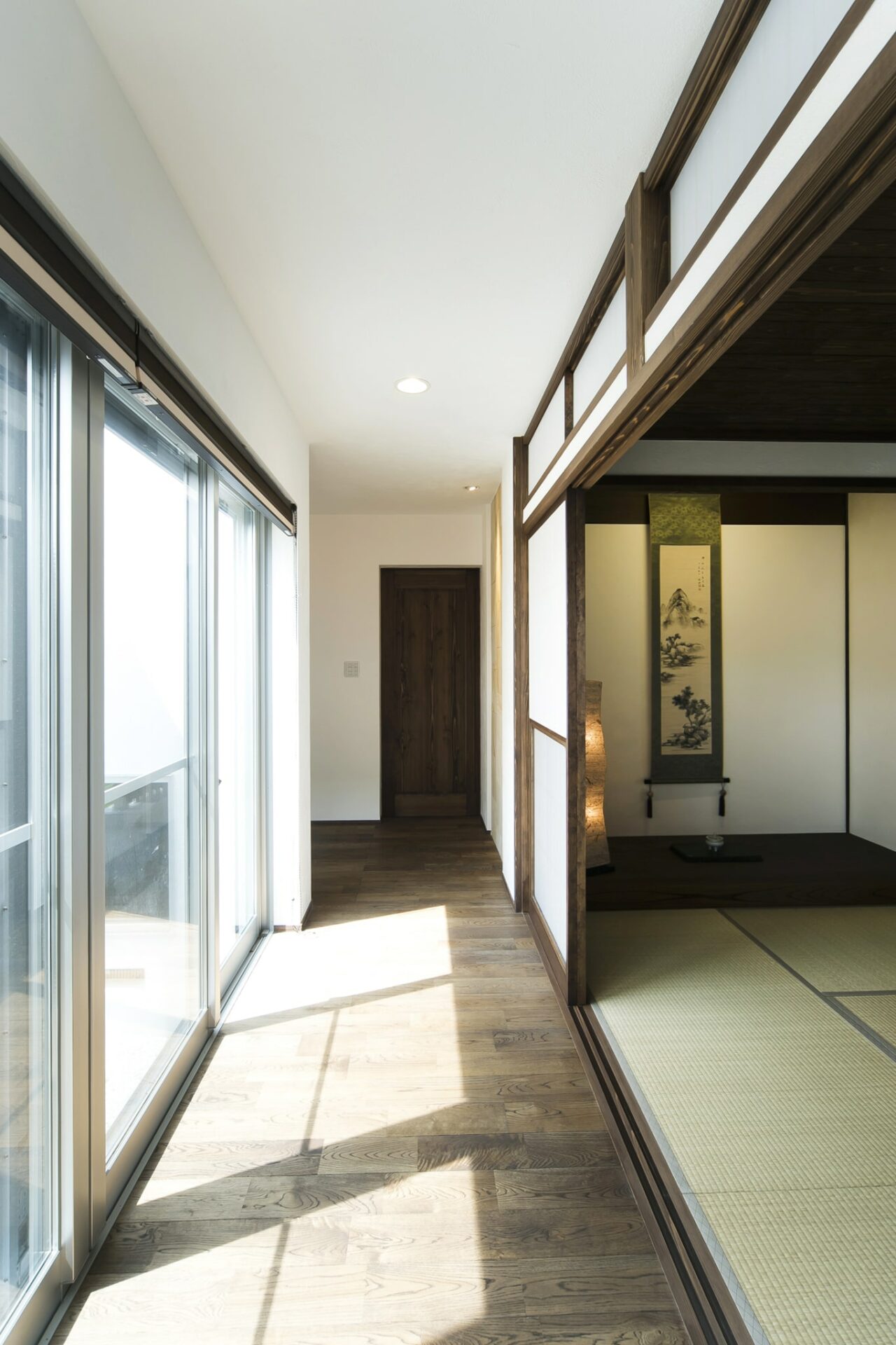 高級旅館を思わせる重厚感ある和室には、光を取り込めるよう雪見障子を造作。下部をすり上げ、庭の様子を見る事も出来ます。