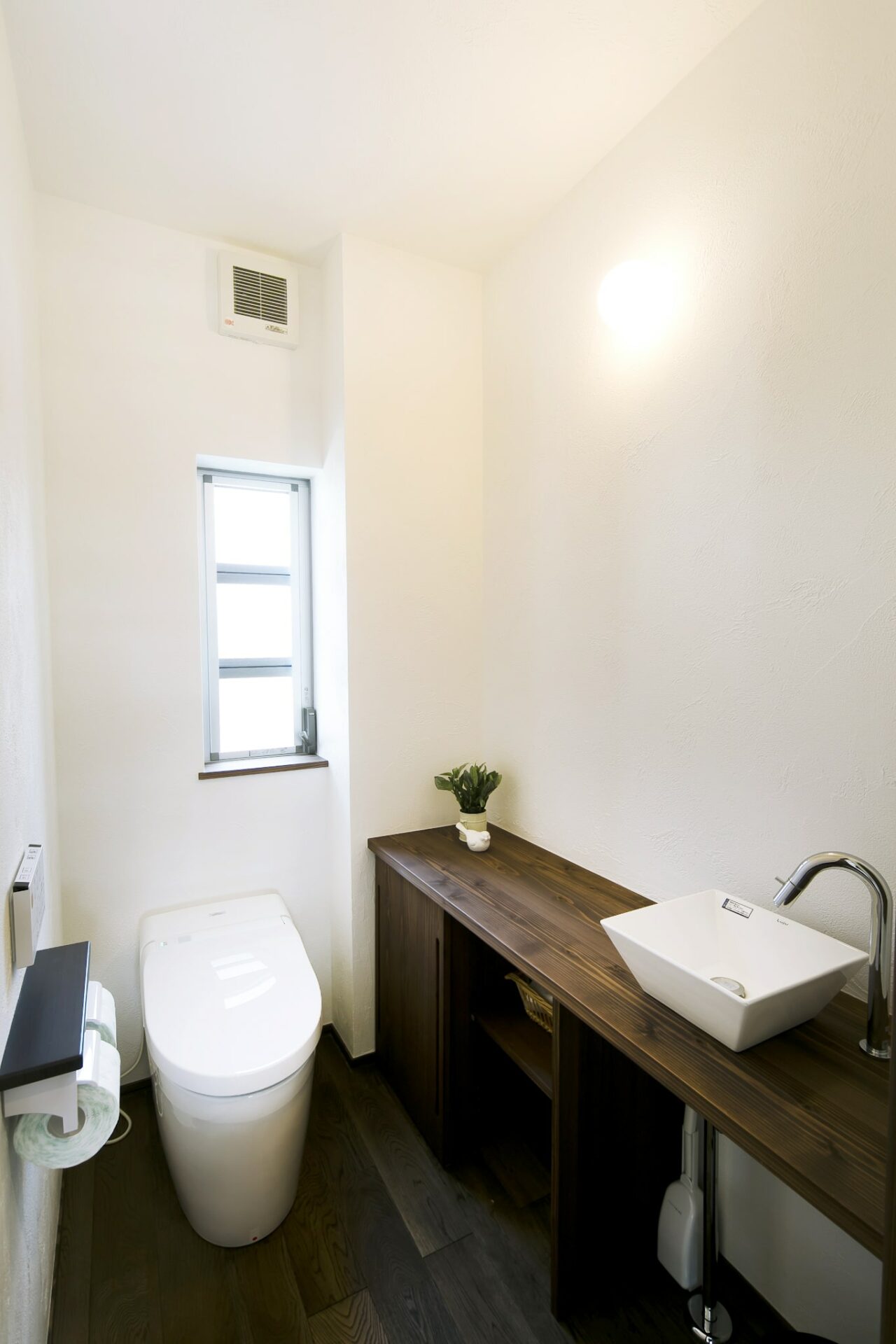 漆喰には浄化・消臭作用があるので、トイレにも最適。正方形の手洗いボウルがスタイリッシュなカウンターも自社で作られたものです。