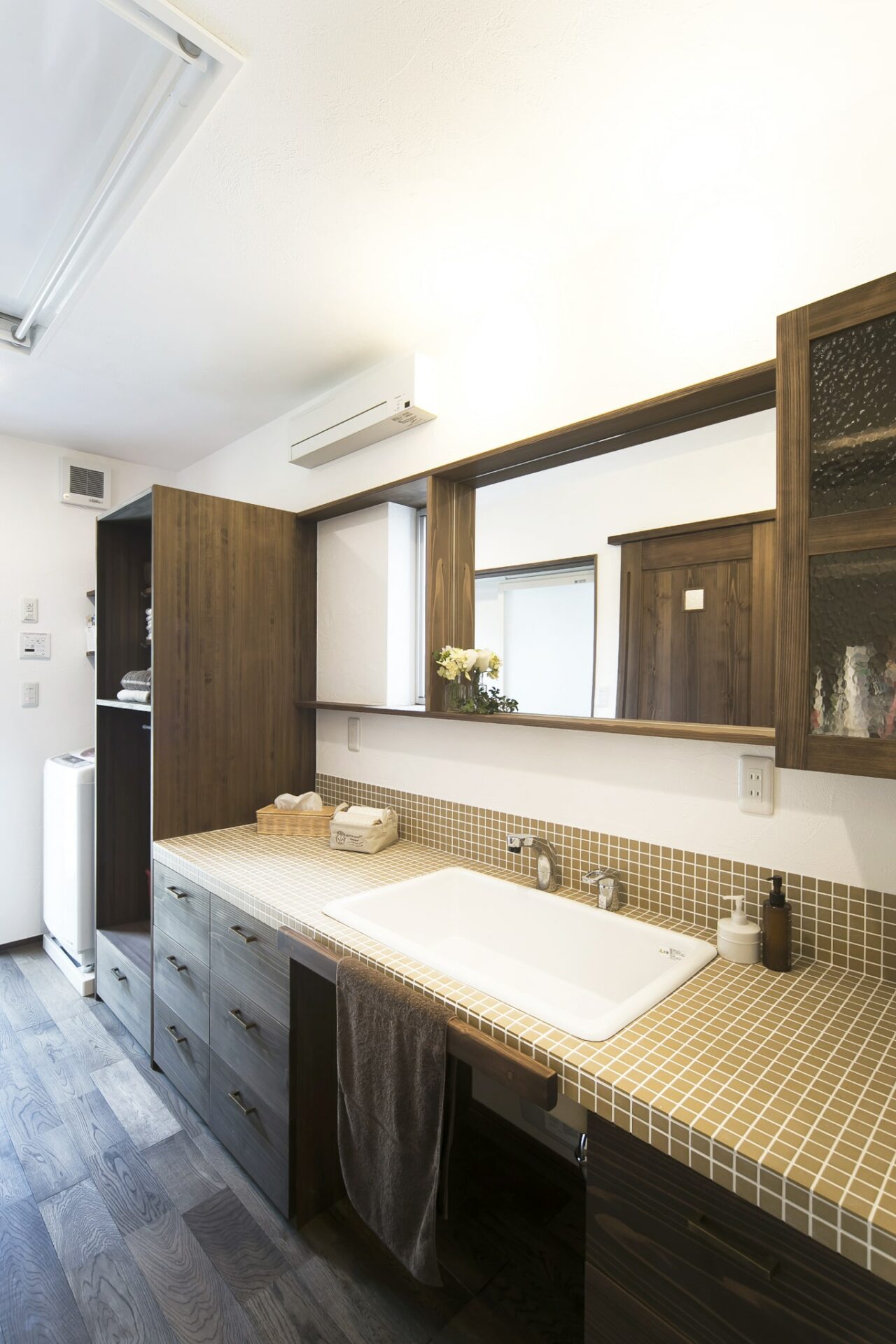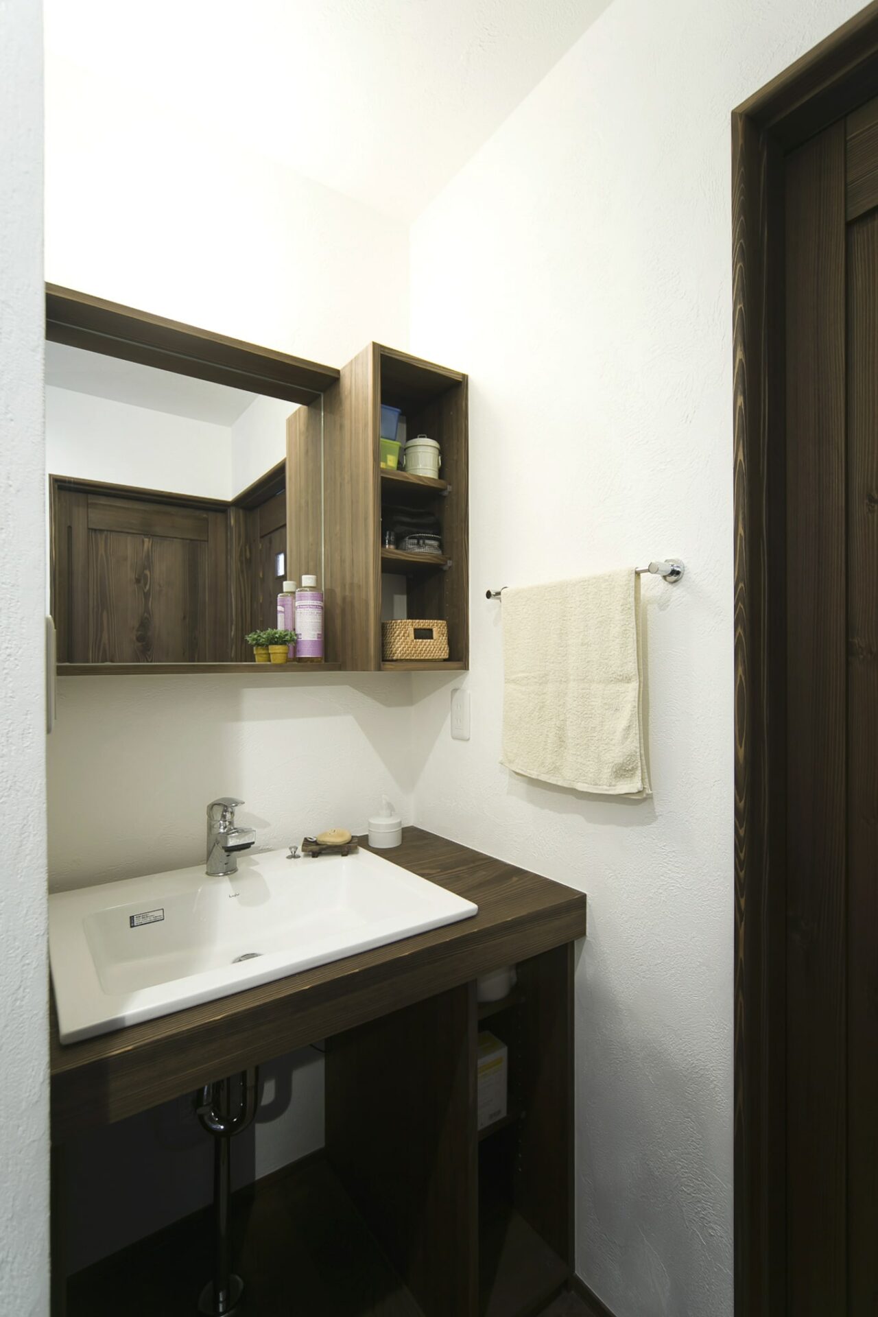洗面化粧台もまるで古民家風のカフェのよう。細かい所までこだわることができるのは注文住宅だからこそ。