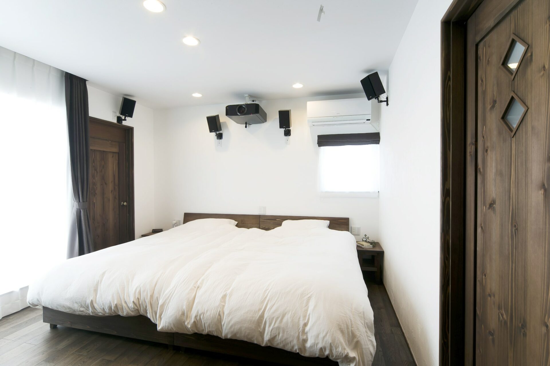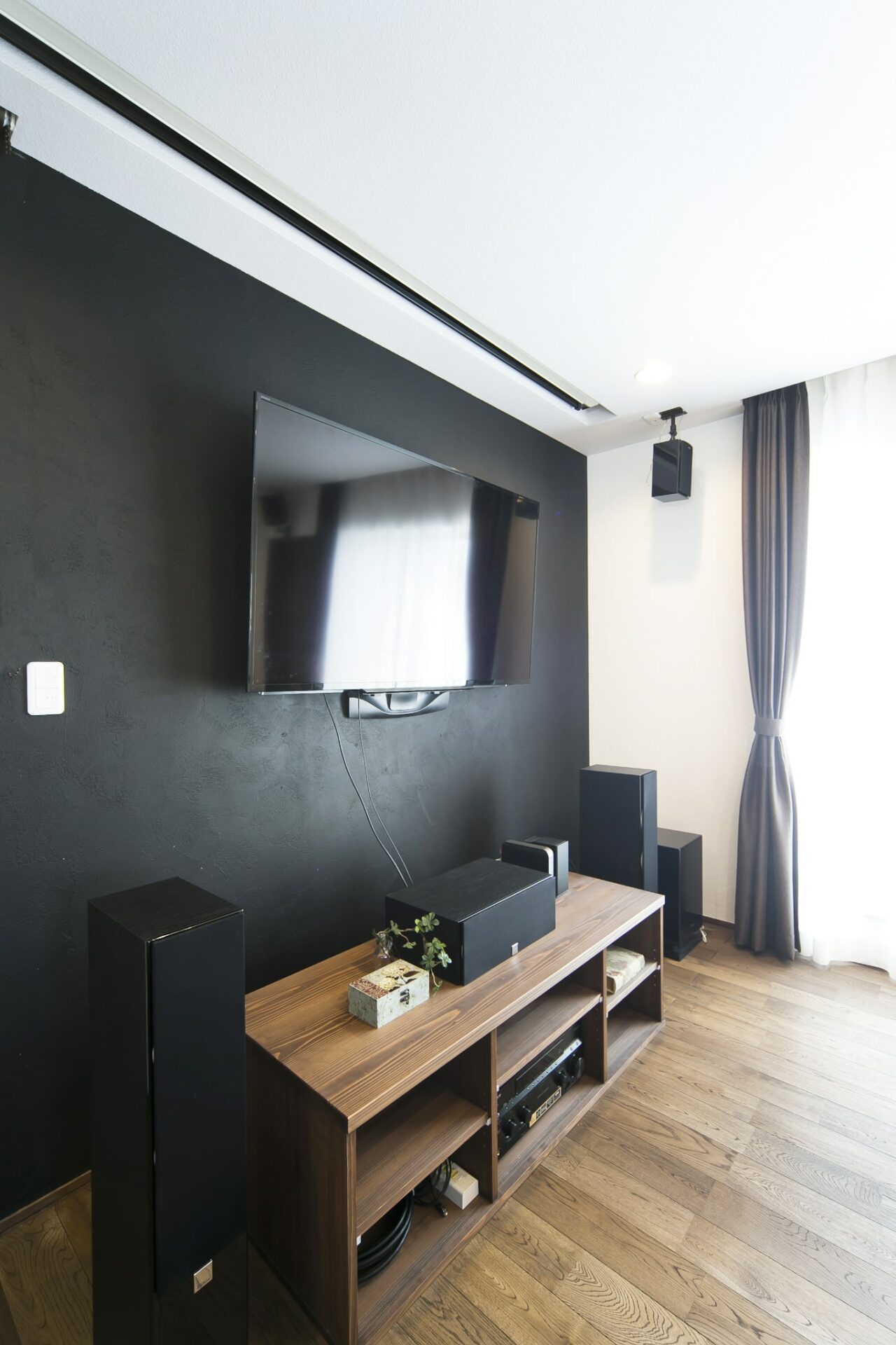 寝室には、本格的なオーディオ機器が備えられています。壁1面を黒漆喰にすることで、反射を抑えて映像を美しくみせてくれます。