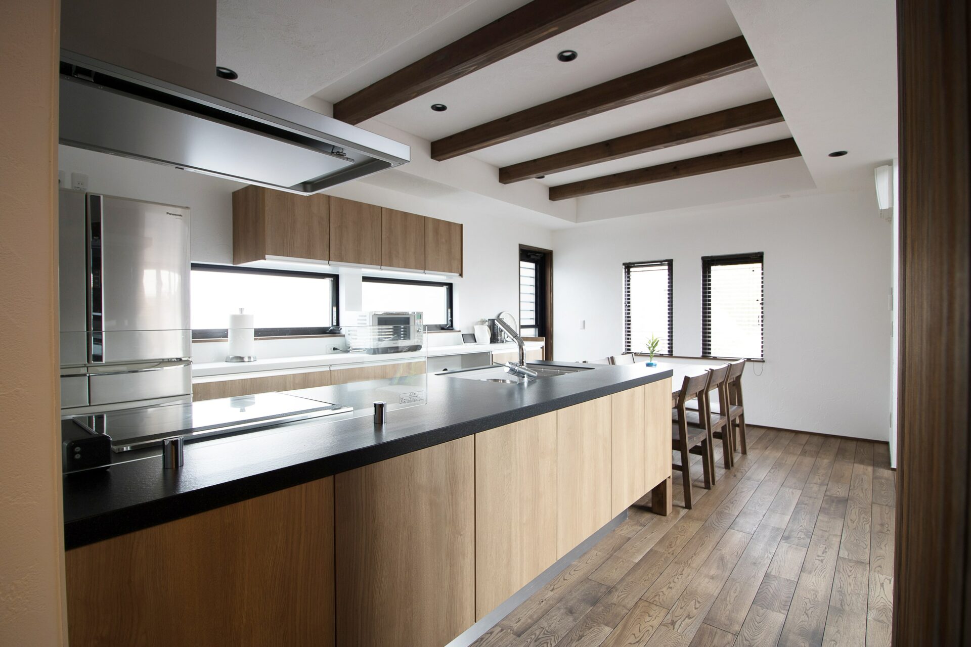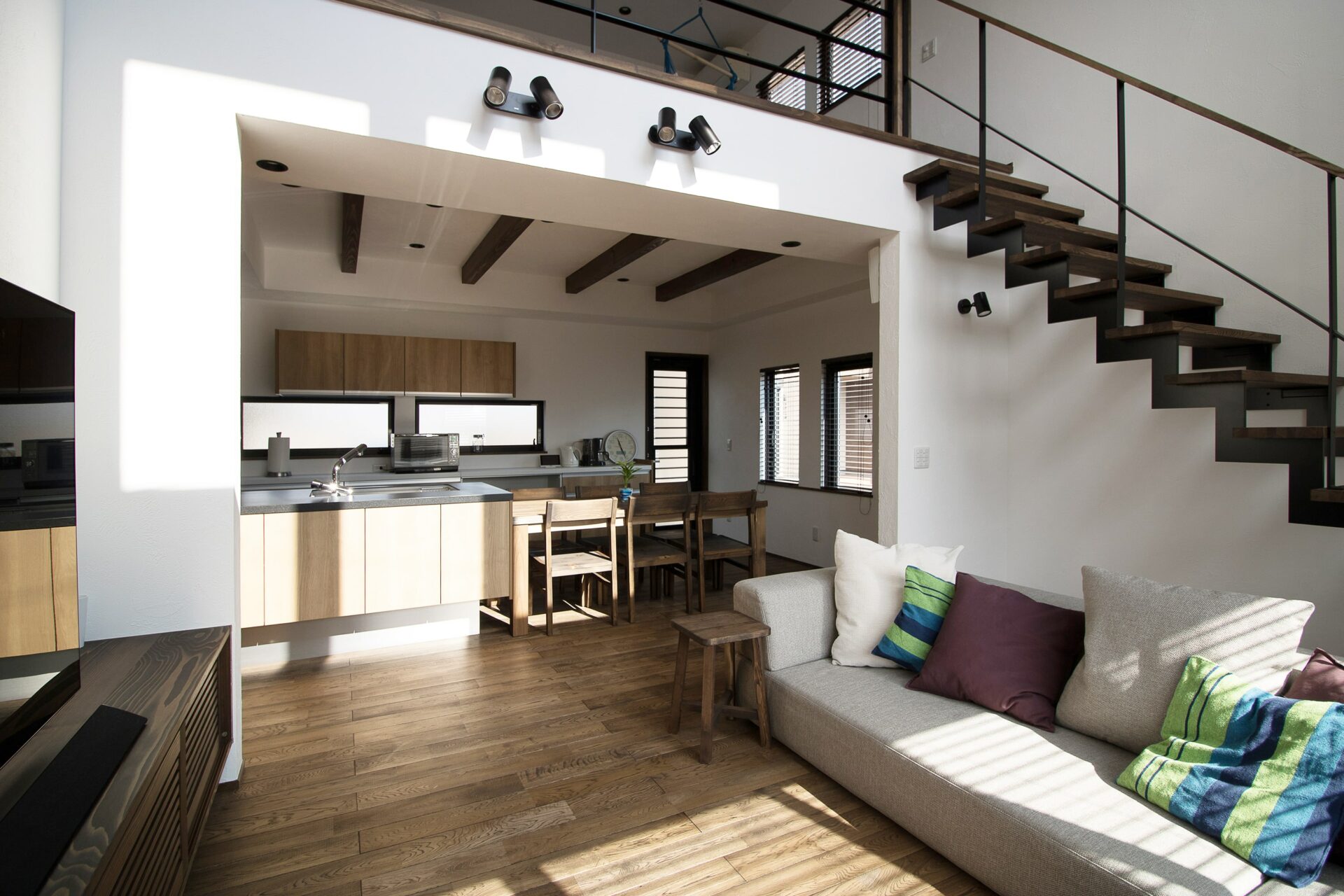 回遊動線のカウンターキッチンに陽光がたっぷり入る吹抜けとストレスのない生活ができるLDK。