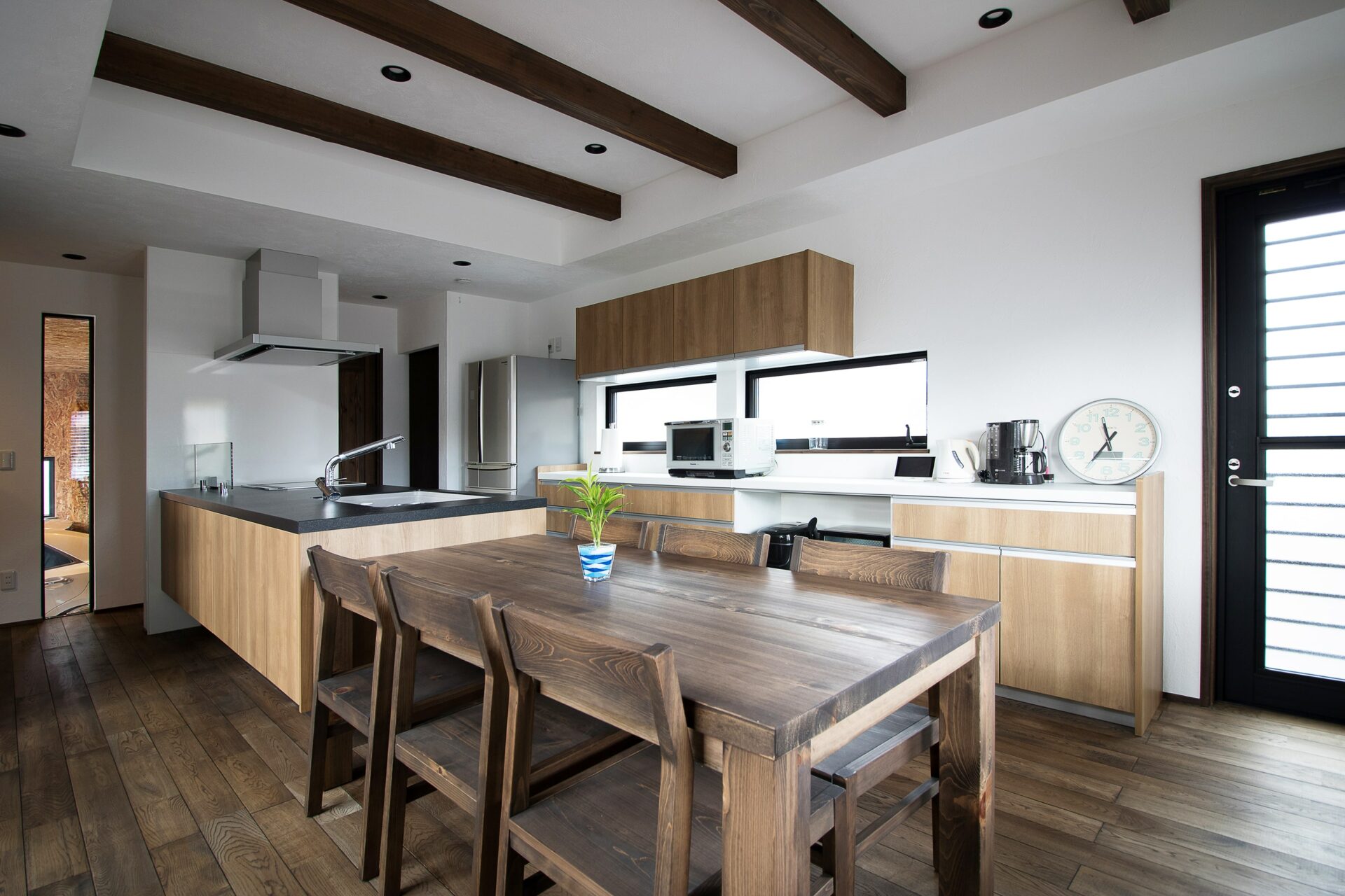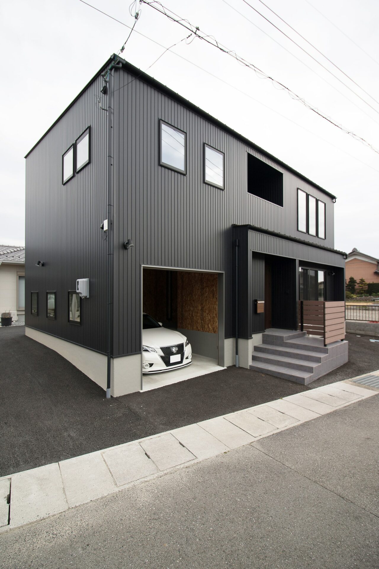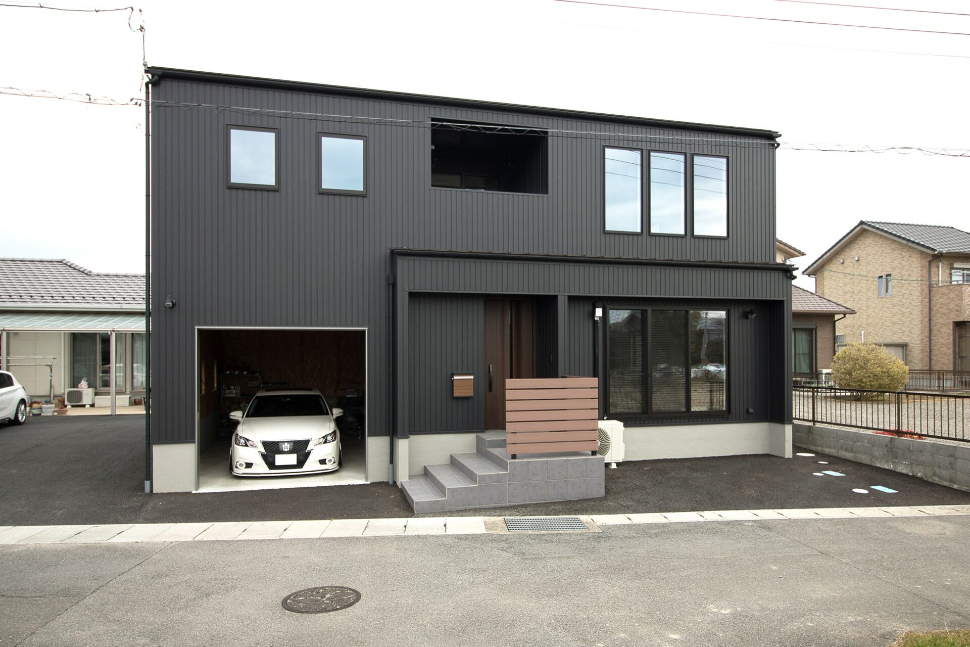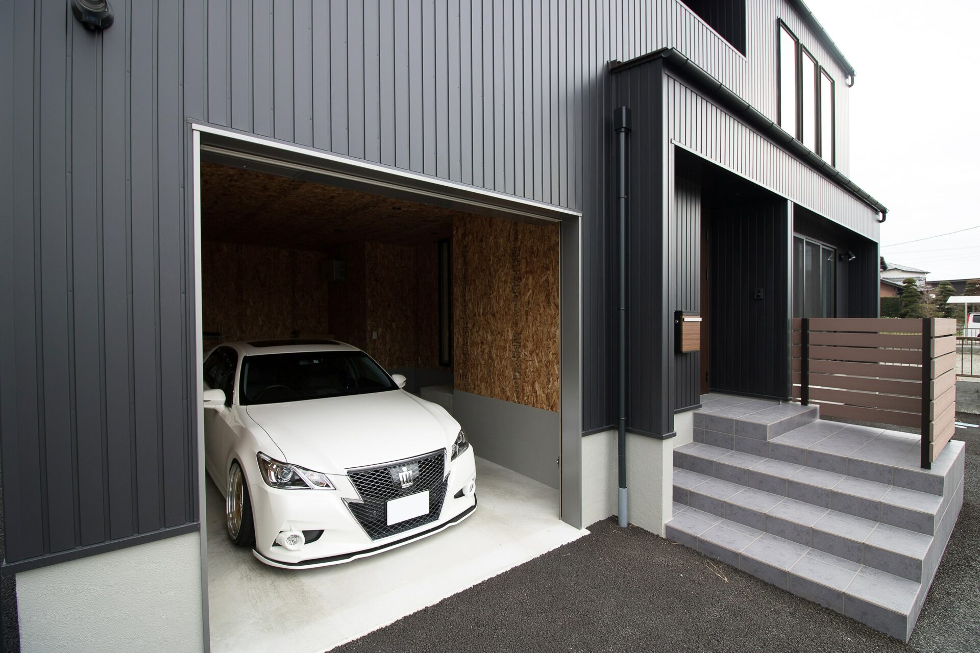 大きなガレージと大きな吹抜けが特徴的なヴィンテージ風のお住まいです。黒ガルバリウムの外観とビターな色の無垢材がシックでかっこいいデザインになりました。