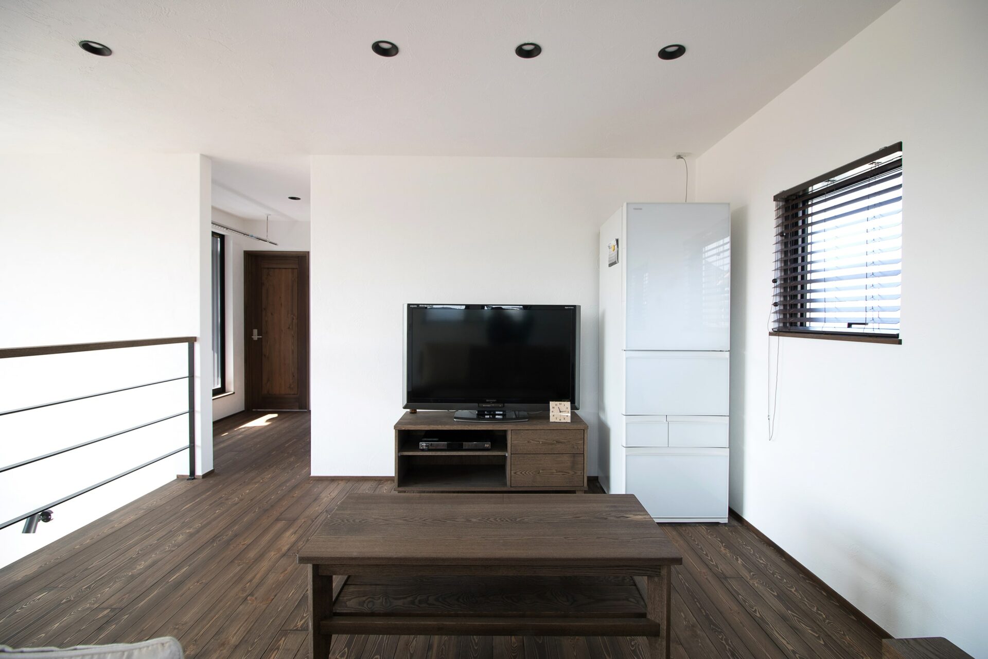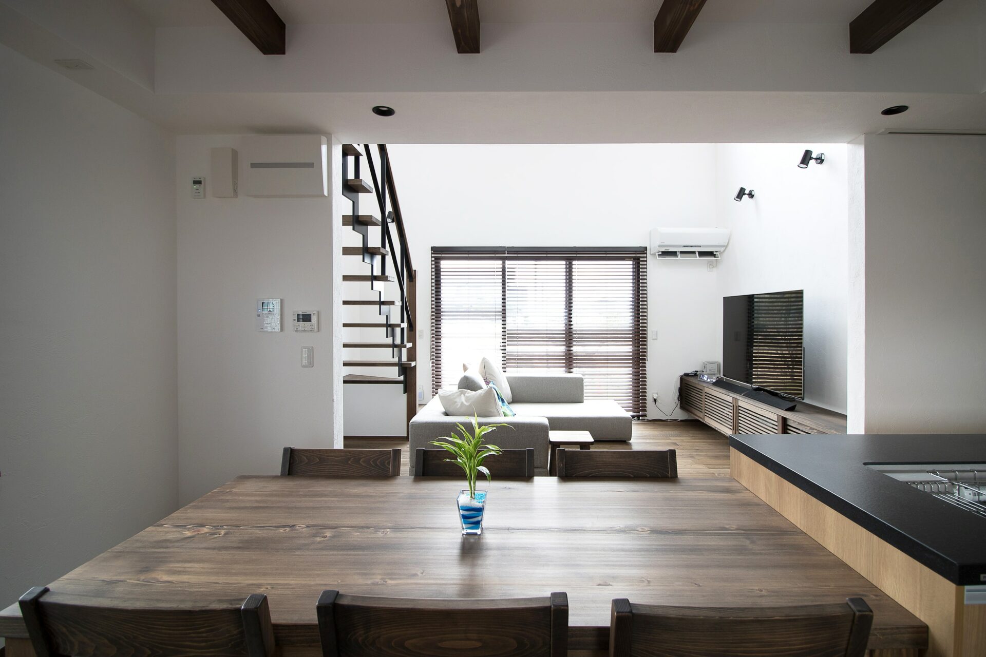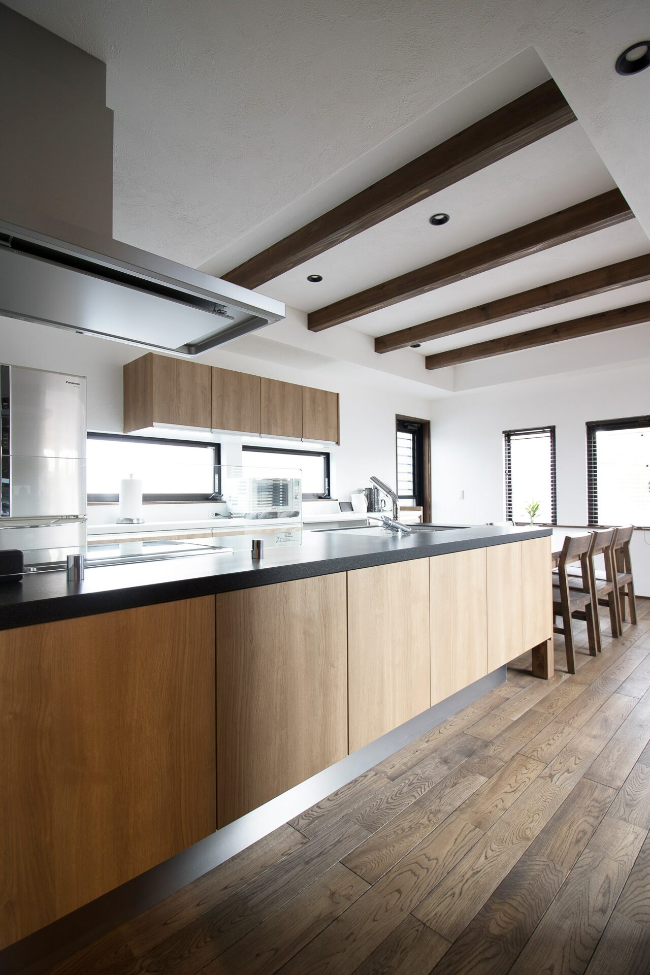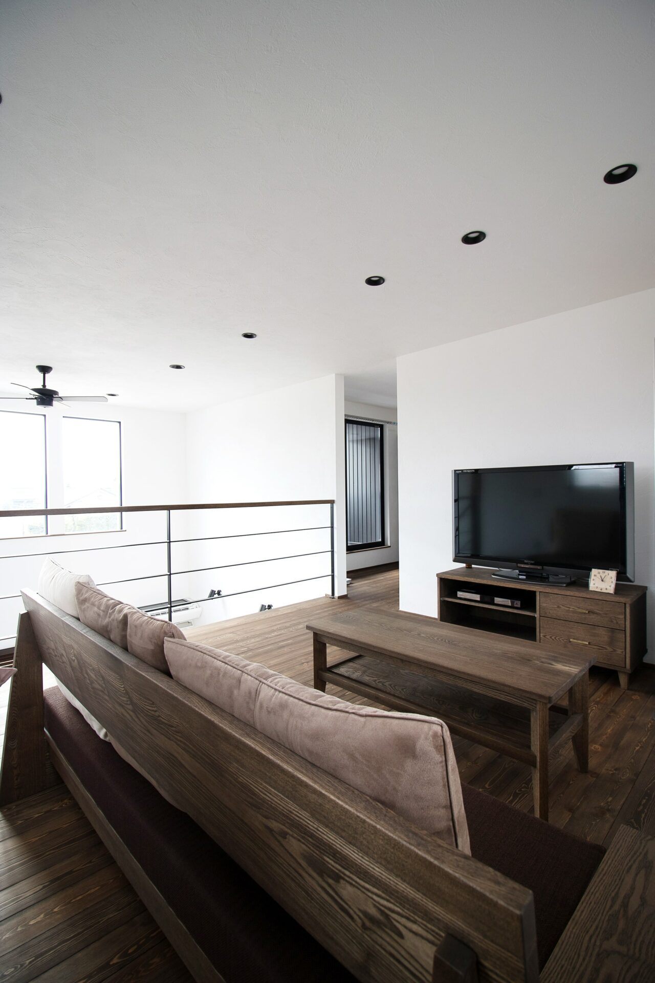 大きなガレージと大きな吹抜けが特徴的なヴィンテージ風のお住まいです。黒ガルバリウムの外観とビターな色の無垢材がシックでかっこいいデザインになりました。