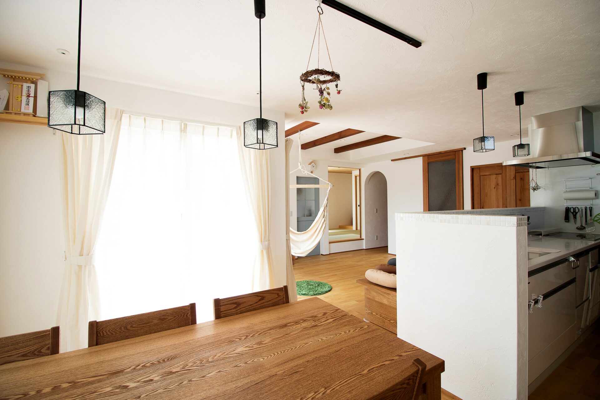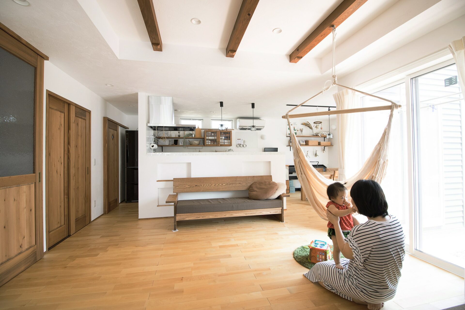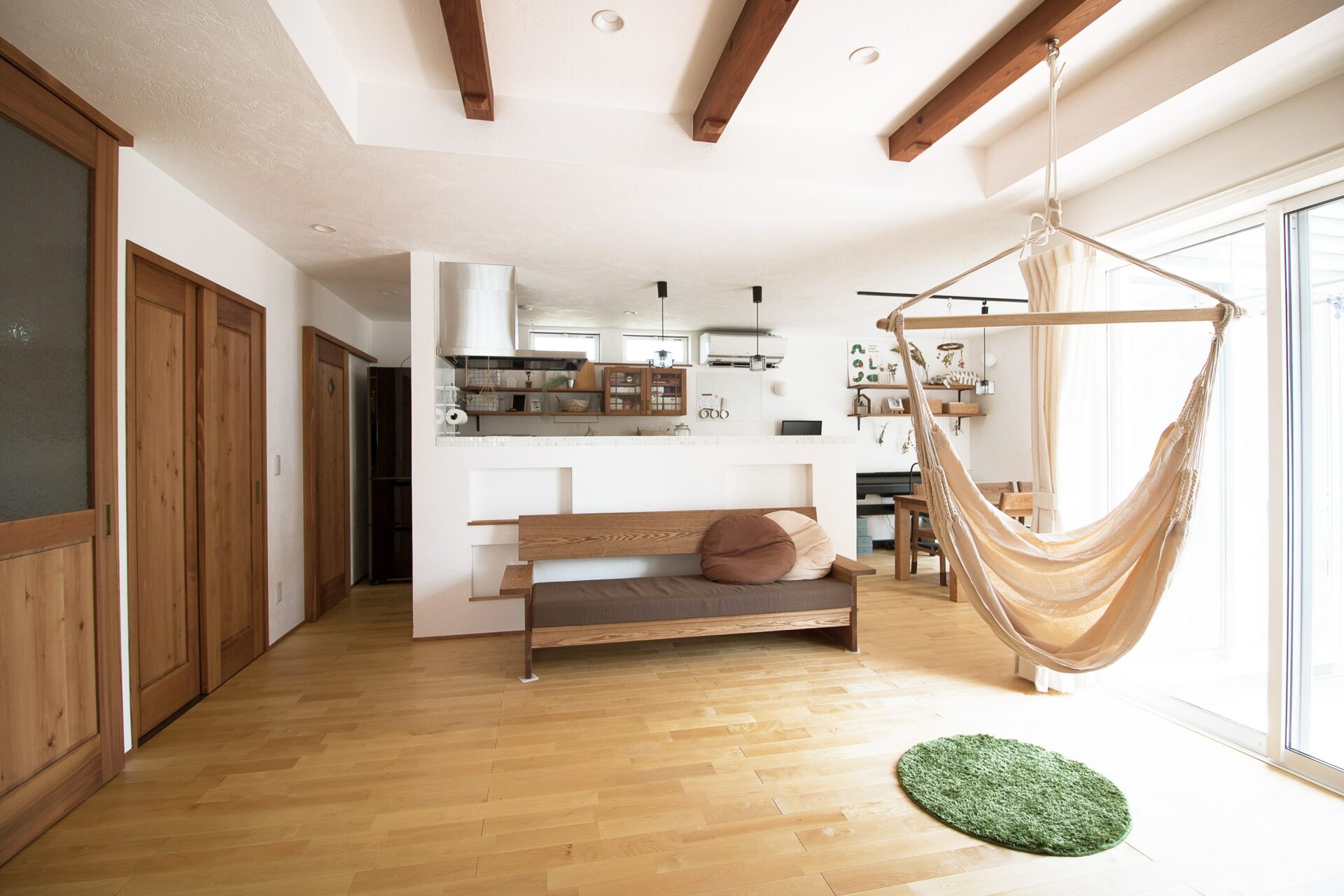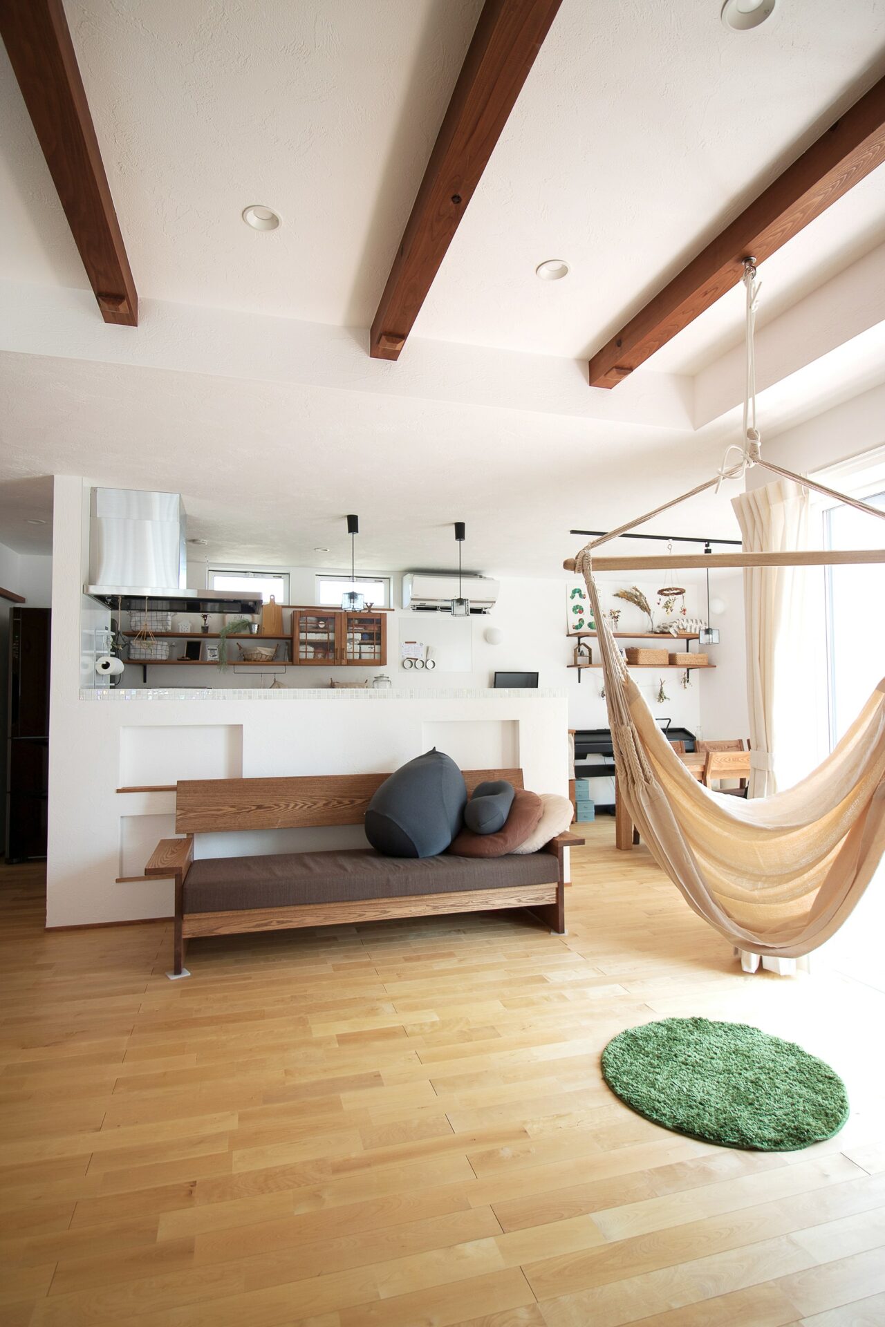 キッチンに立てば和室まで見渡せて、子育て中の奥様も安心して子どもを見守れます。 「今じゃクロスなんて考えられないほど、漆喰に魅了されています」と自然素材を楽しむK様。漆喰と無垢材の雰囲気や効果に満足されています。 注文住宅を建てる工務店だからこそできる、ハンモックにゆらりくつろげるこだわりのお住まいが完成しました。