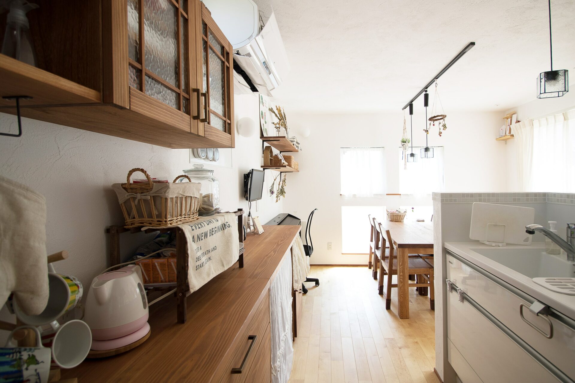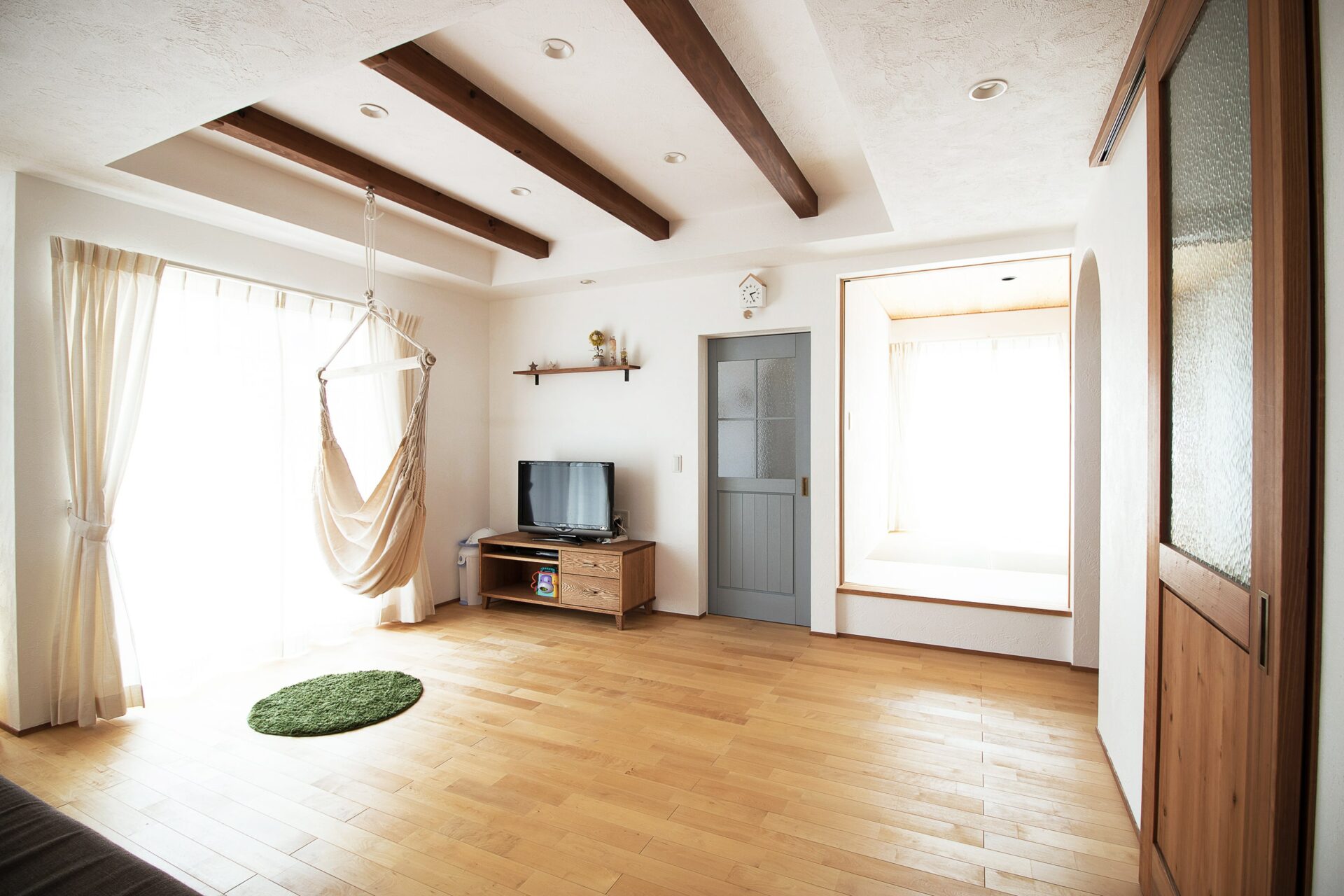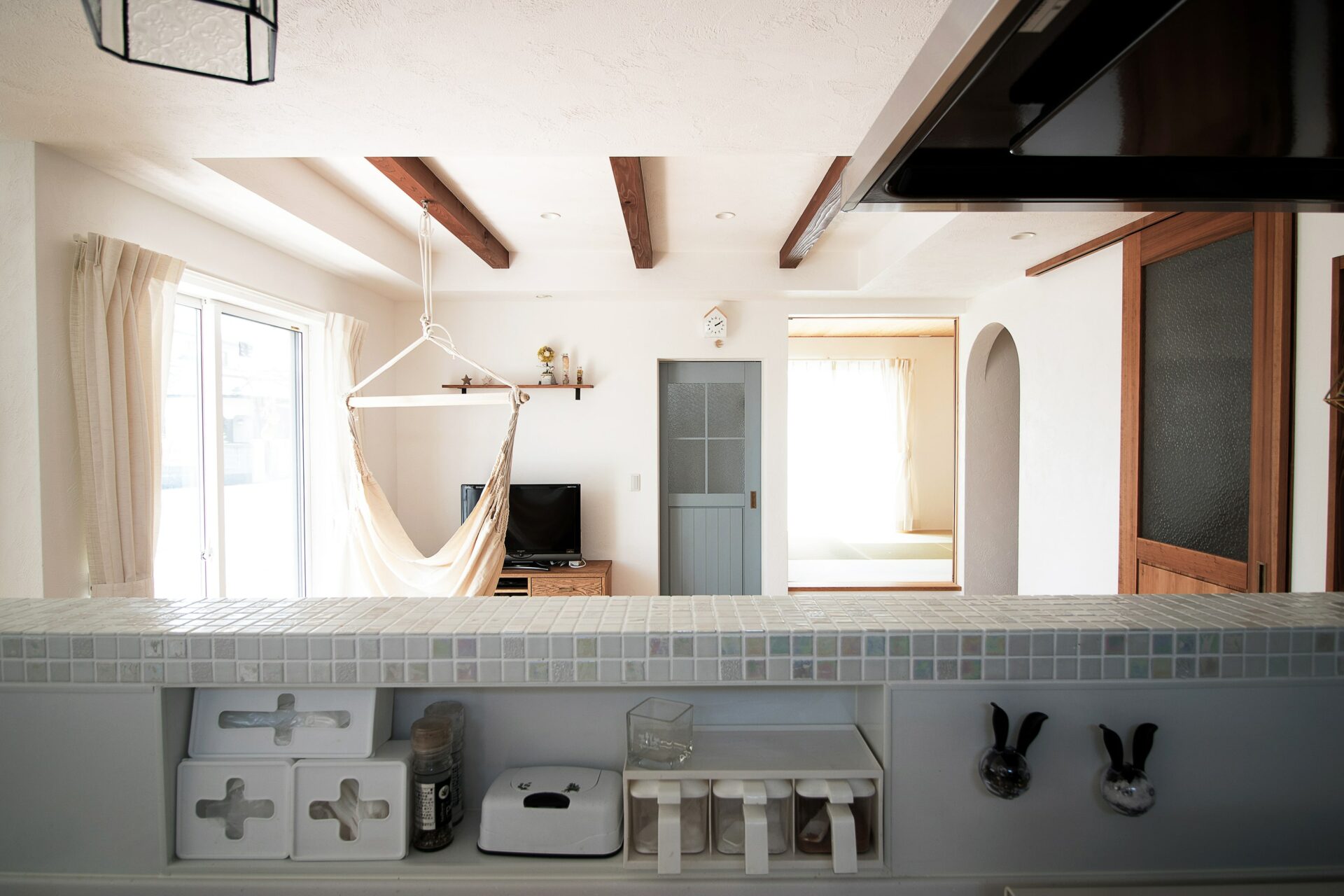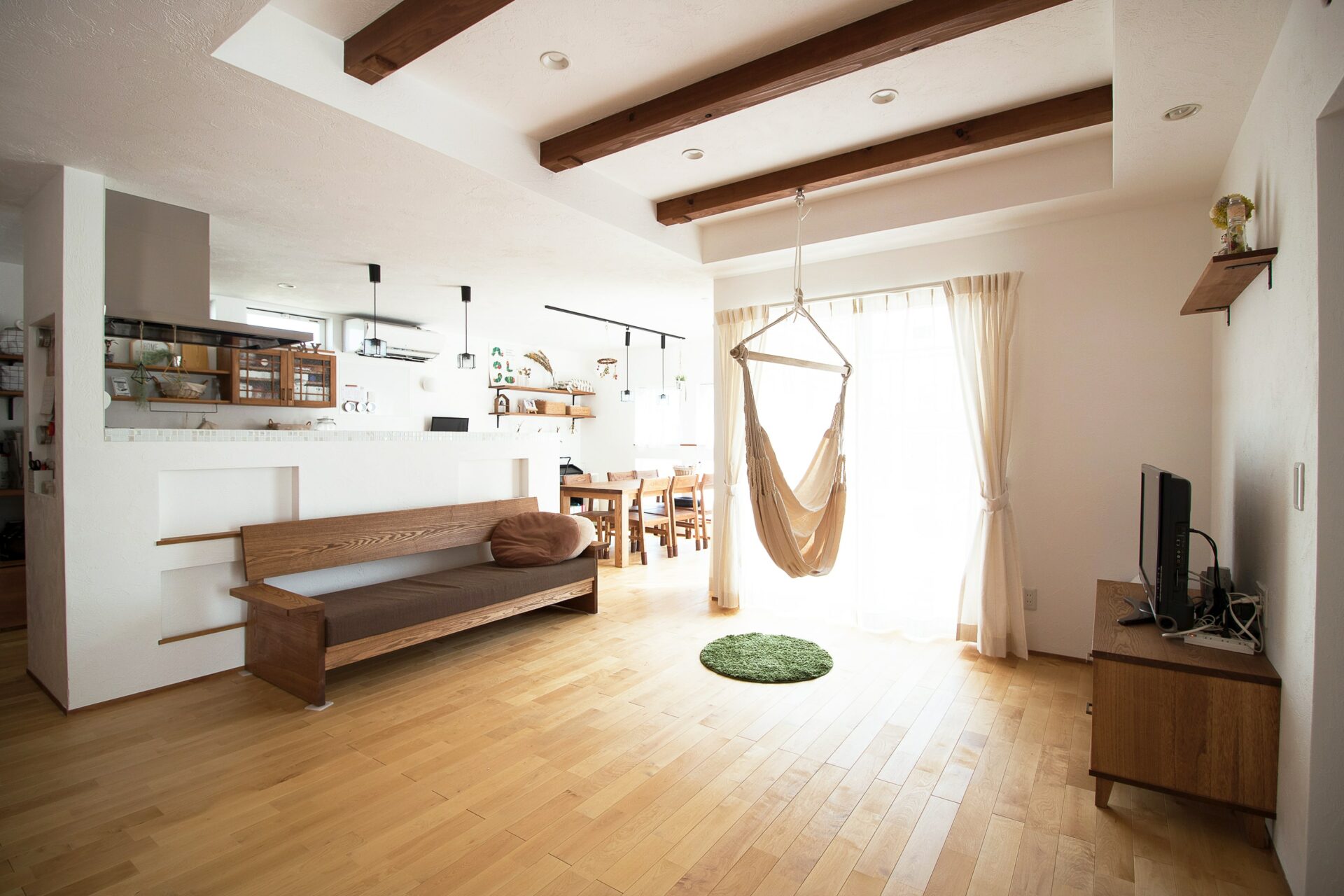 キッチンに立てば和室まで見渡せて、子育て中の奥様も安心して子どもを見守れます。 「今じゃクロスなんて考えられないほど、漆喰に魅了されています」と自然素材を楽しむK様。漆喰と無垢材の雰囲気や効果に満足されています。 注文住宅を建てる工務店だからこそできる、ハンモックにゆらりくつろげるこだわりのお住まいが完成しました。