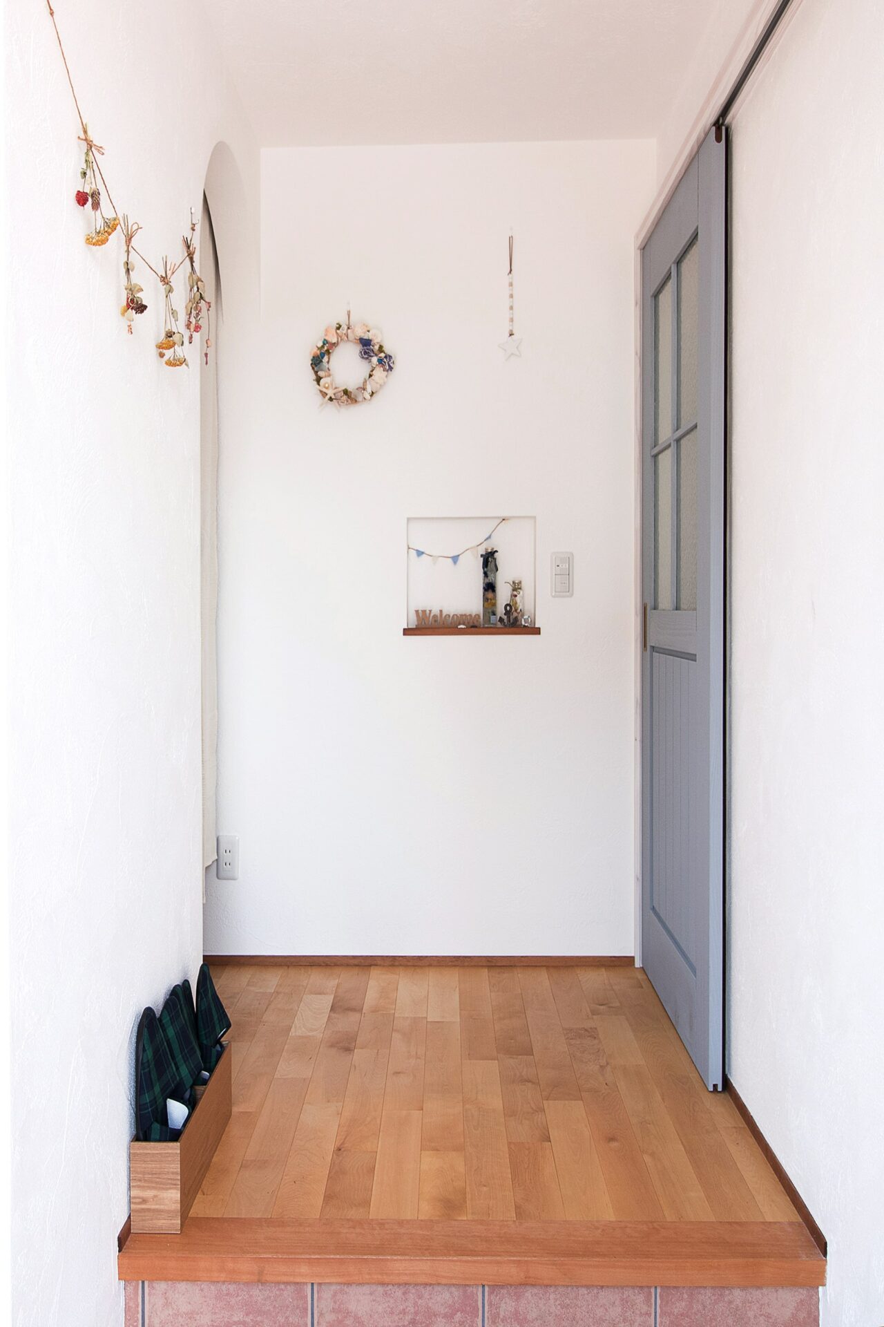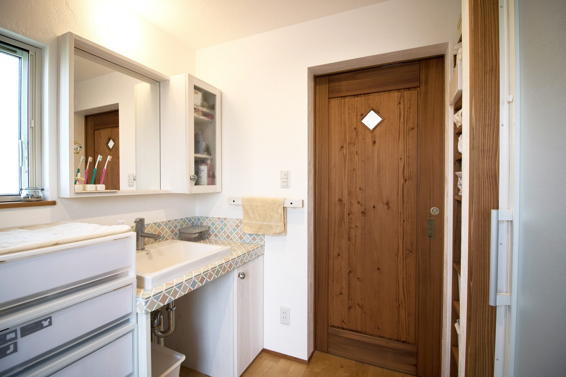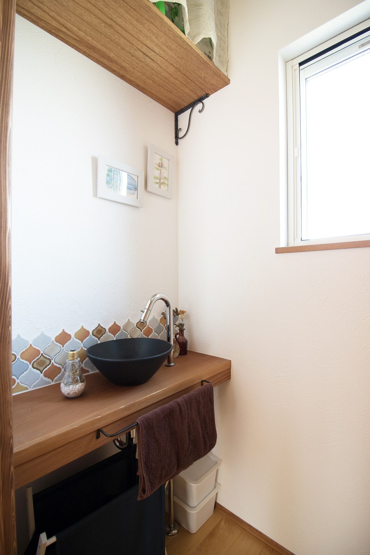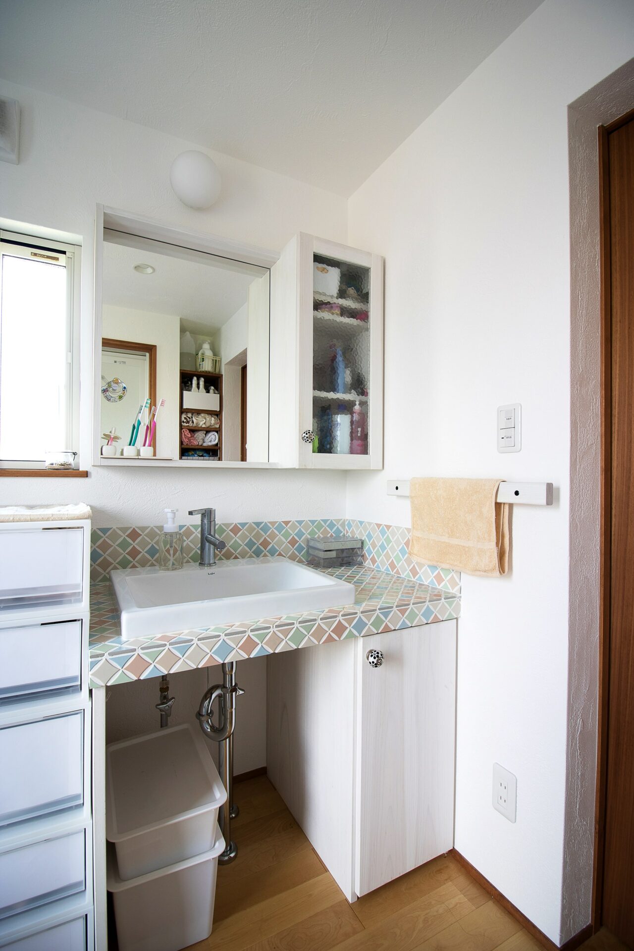 タイルが大好きなK様のお住まいには、個性的なタイルがあしらわれ洗面化粧台や手洗いを彩っています。 特に洗面化粧台はお気に入り。無垢材を白く塗装し、ファンシーな印象になりました。毎朝の身支度が楽しくなります。