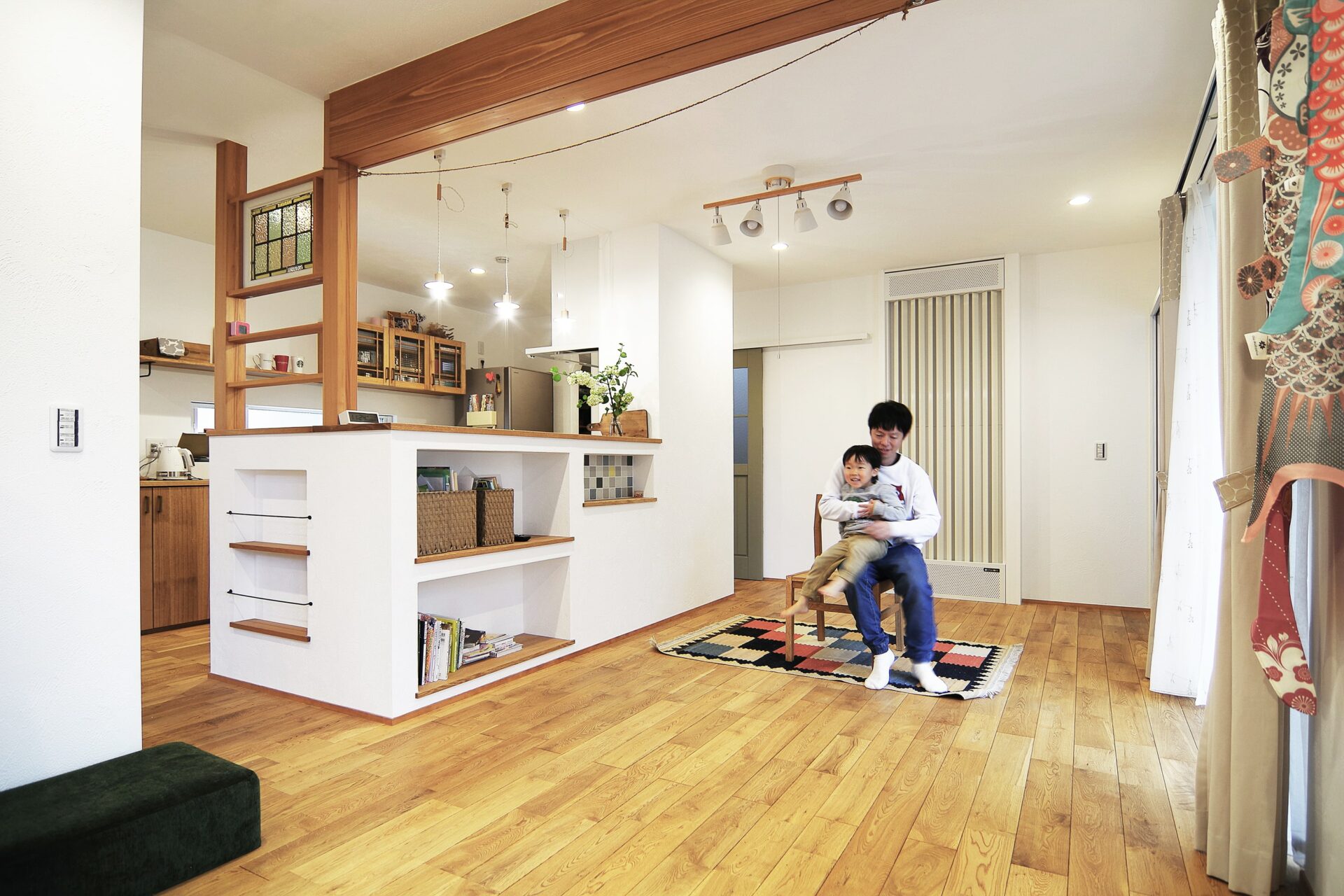 漆喰と無垢材のコントラストがよく映えるLDK。後ろの白いパネルは一台のエアコンと連動し家全体を暖める「輻射式冷暖房パネル」です。