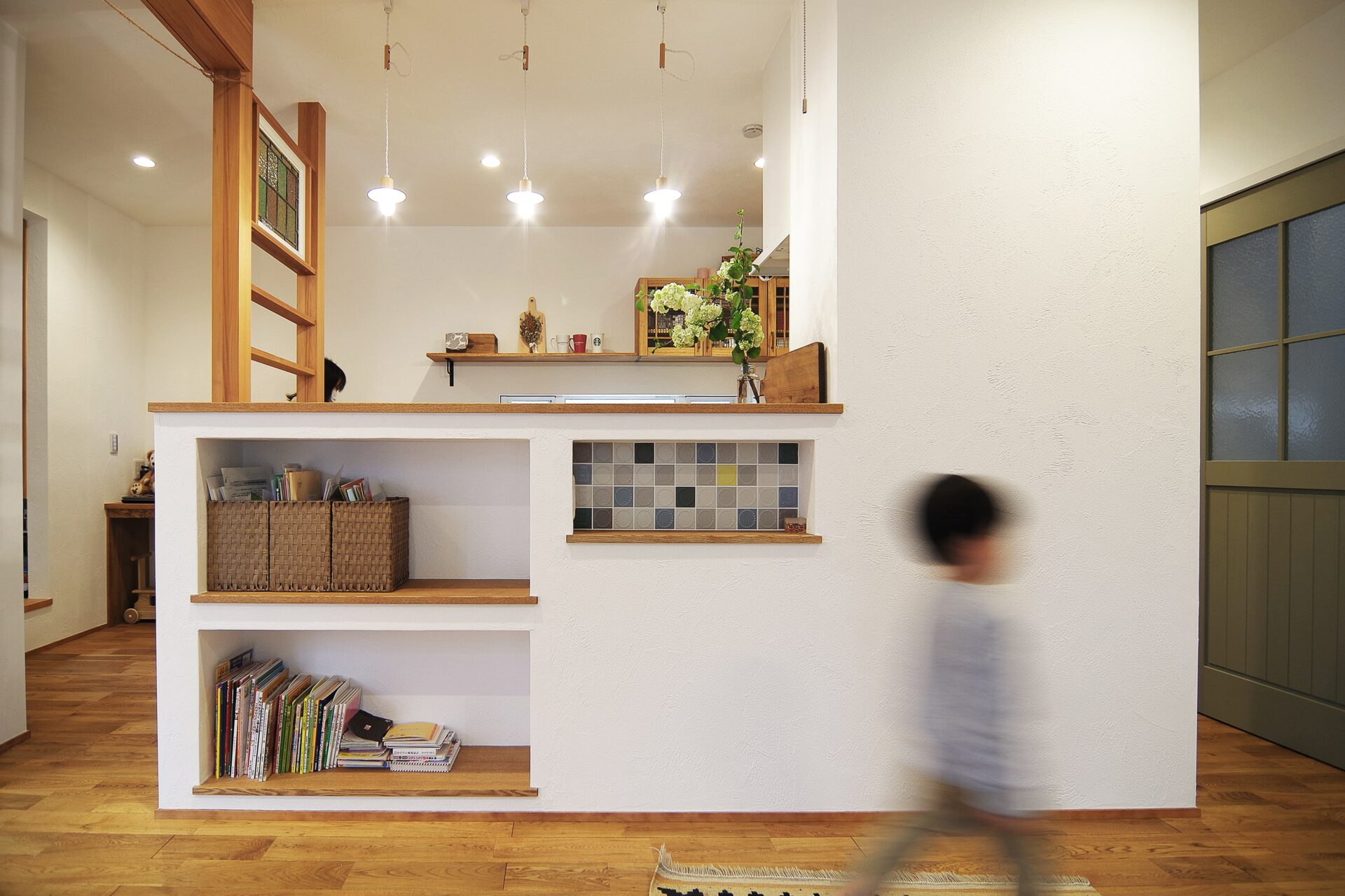 キッチン前収納に埋め込まれたカラフルなタイルをアクセントに。