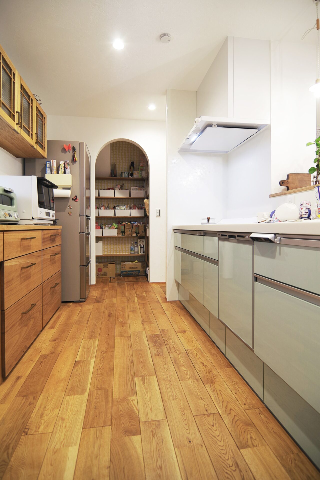 アーチ形の垂れ壁のパントリーが空間を柔らかく見せます。デザイン的にもとてもおしゃれ!