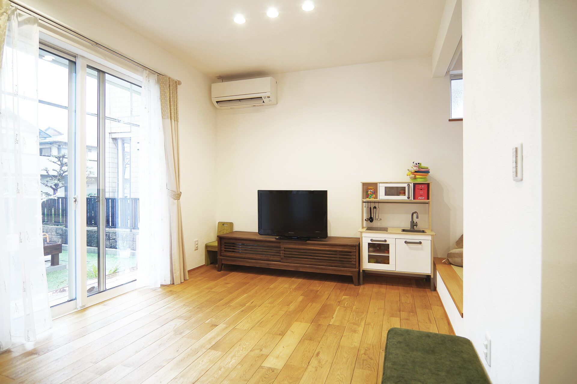 ナラ無垢の床が気持ちのいいリビング。大きな掃き出し窓から風と光を取り込みます。