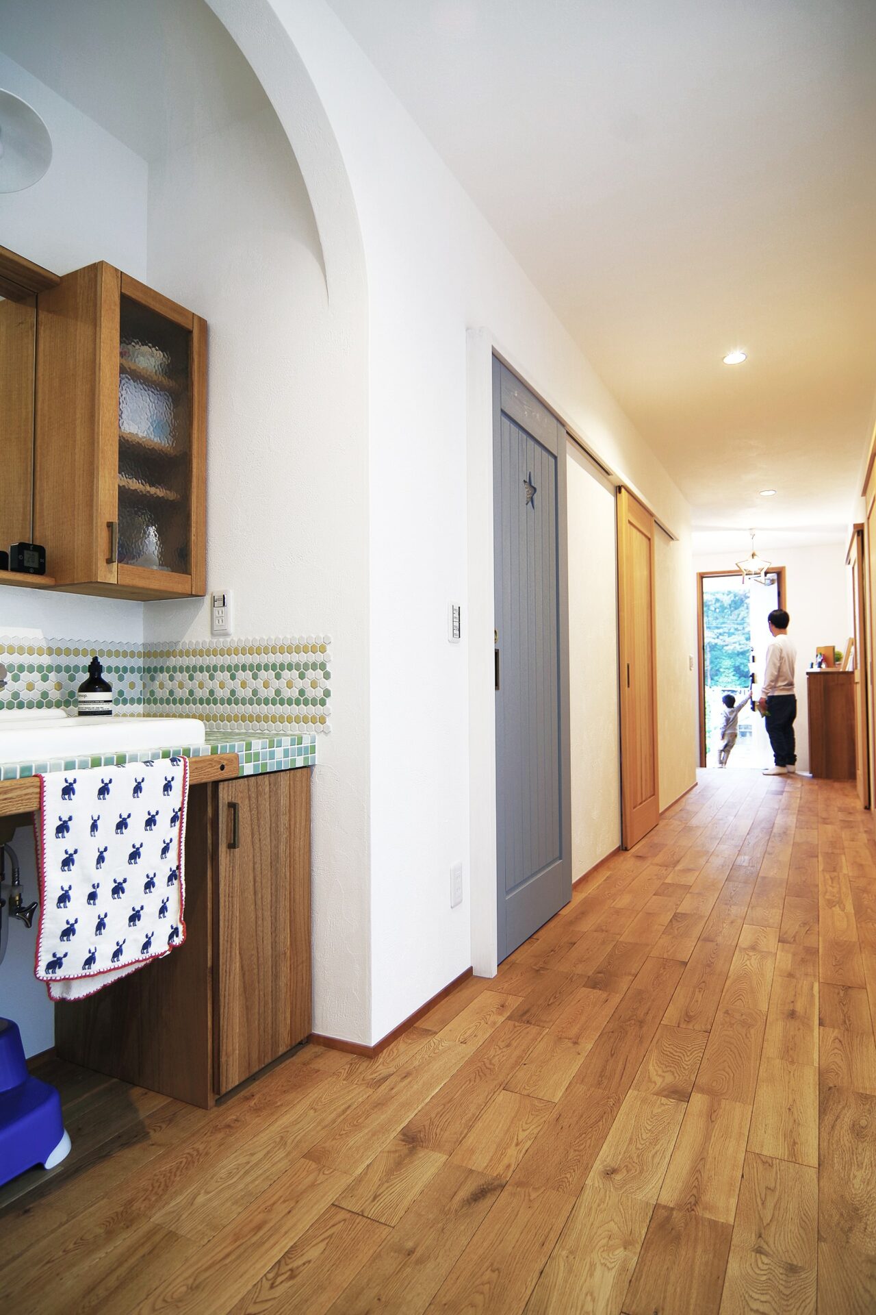 玄関をはいって手前がご両親の空間。奥がオーナー様ご家族の空間となります。ご両親の使うスペースは建具を木の木目をそのまま生かしたものにしました。