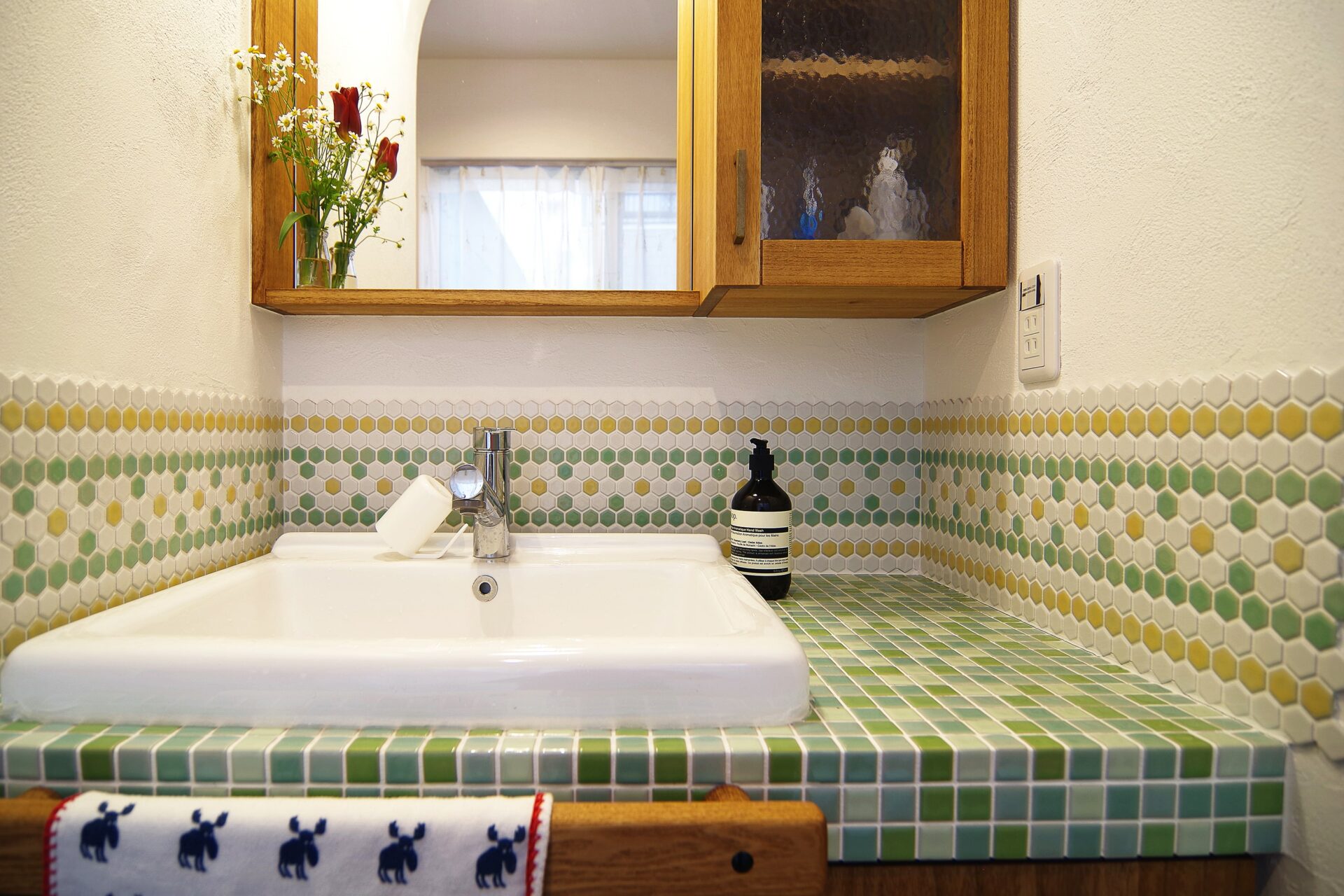花柄にタイルを施工した洗面化粧台は奥様のデザイン。自社で作っているからこそそんなオーダーにお応えできます。