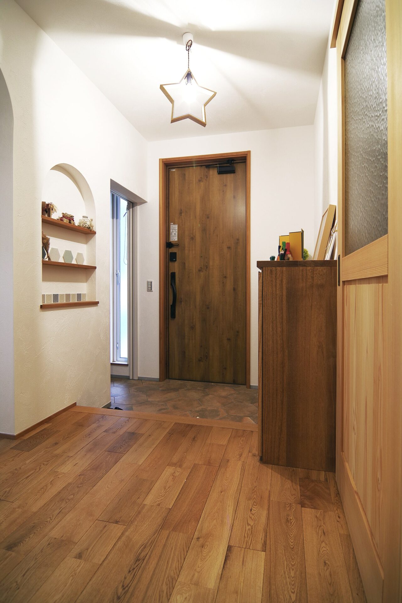玄関ホールは収納もたっぷり!アーチ形のニッチにもお気に入りのタイルを張りました。
