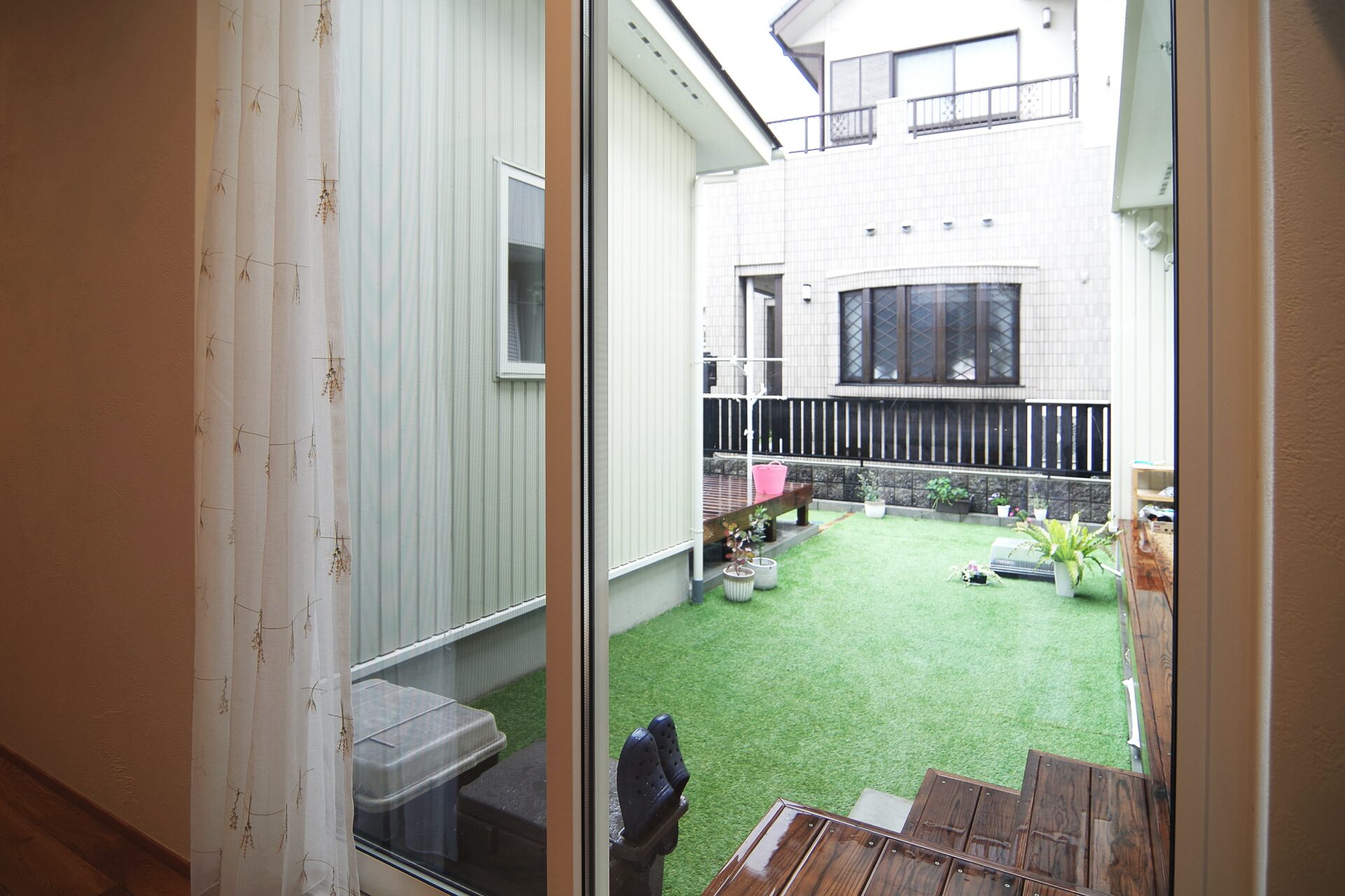 ウッドデッキのある中庭。中庭はプライベートな空間を保てるのでバーベキューをしたり、お子様のプールを置いたりいろんな楽しみ方ができます。