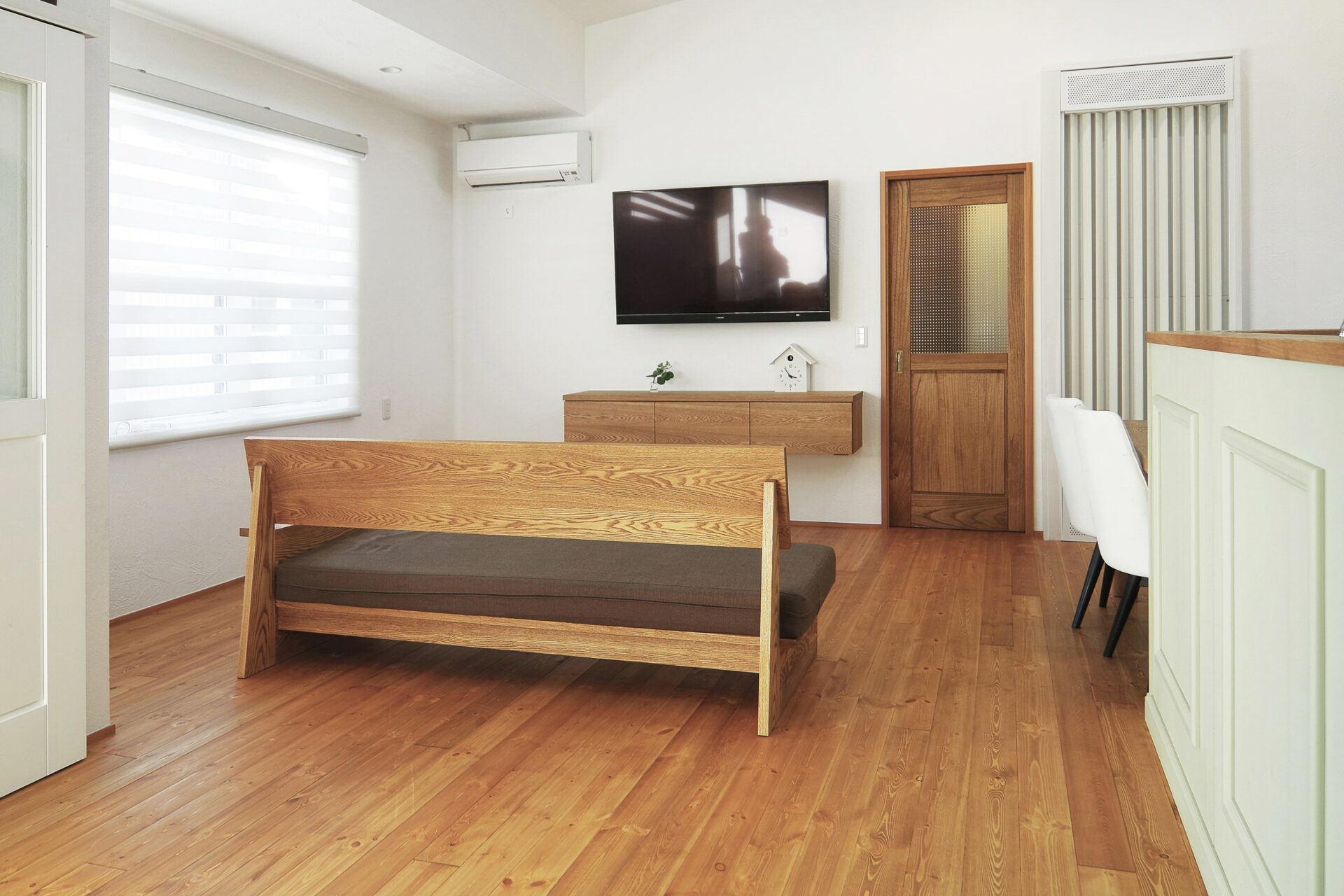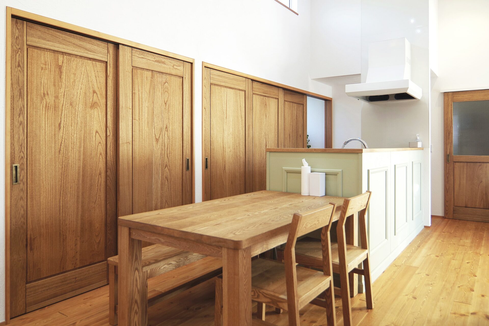 どうしても生活感が出てしまう背面収納は全て扉で隠す事ができます。扉は全て本社工場でつくられ、素材は桐の無垢材を使っています。