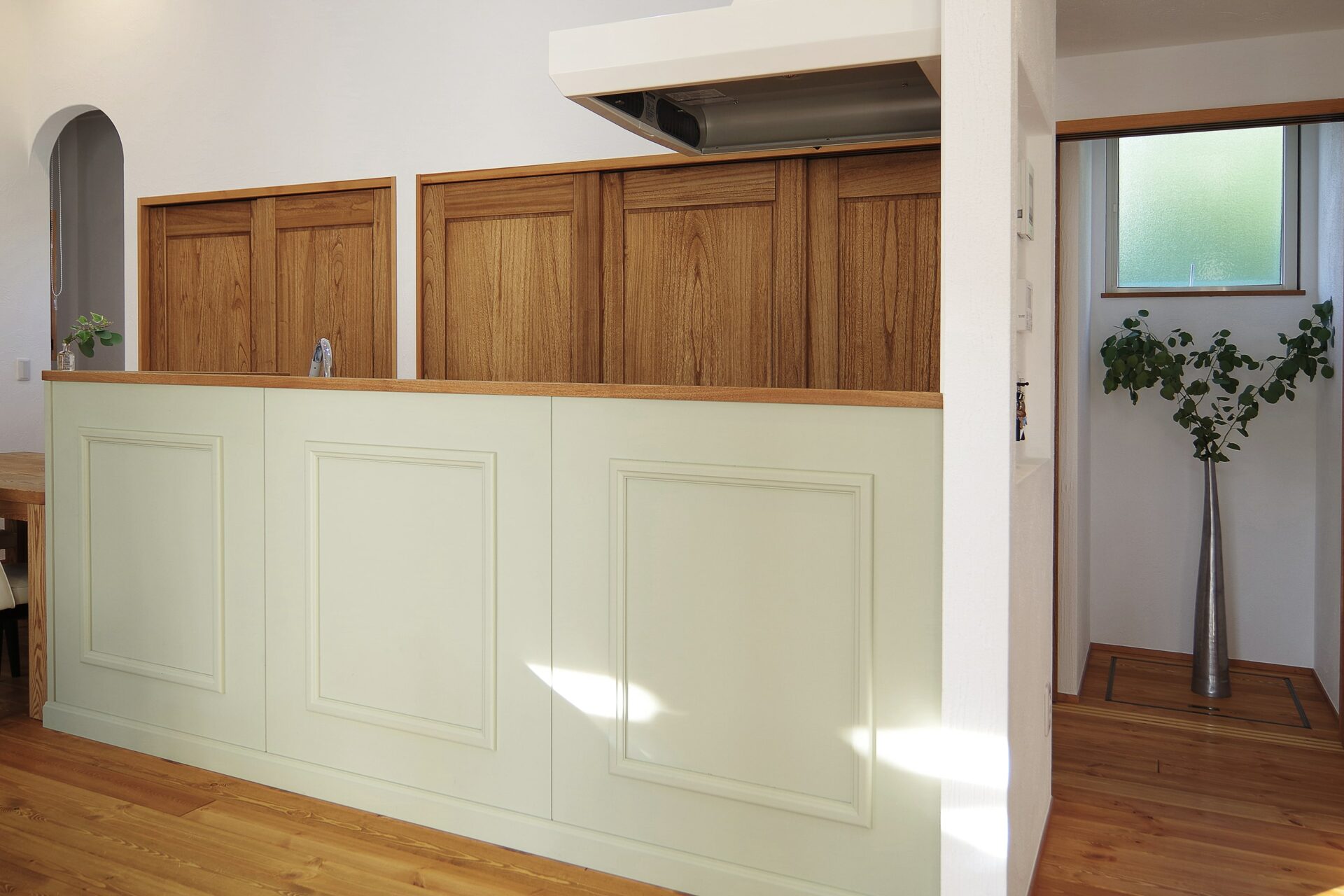 キャメルか白色で塗装された家具や建具の中で、キッチンのみ淡いグリーンで塗装し空間を引き締めます。色の見本をオーナー様に何週類も提案し、お客様のこだわりをとことん追求し、イメージに合う色に決めてもらいました。