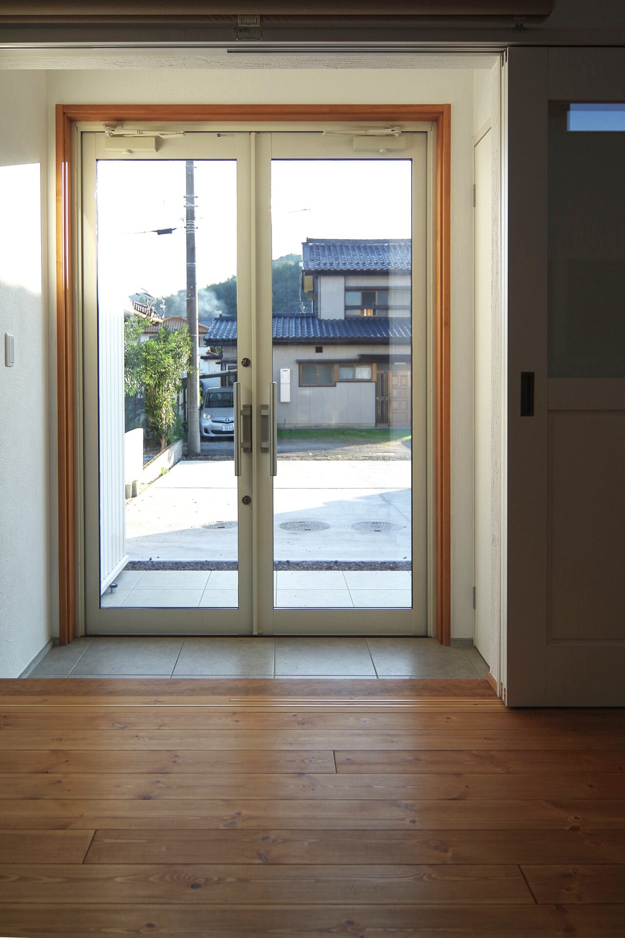 リビングの掃き出し窓はいらないというオーナー様の考えから、玄関を掃き出し窓と兼ね、お店のような硝子扉に。廊下のない無駄な間取りと、LDKの掃き出し窓もいらない、勝手口もいらない、ベランダもいらない、玄関ホールもいらない…オーナ様が考えるいらないものを省いた内装はこだわりの感じるシンプルで洗練された空間になりました。