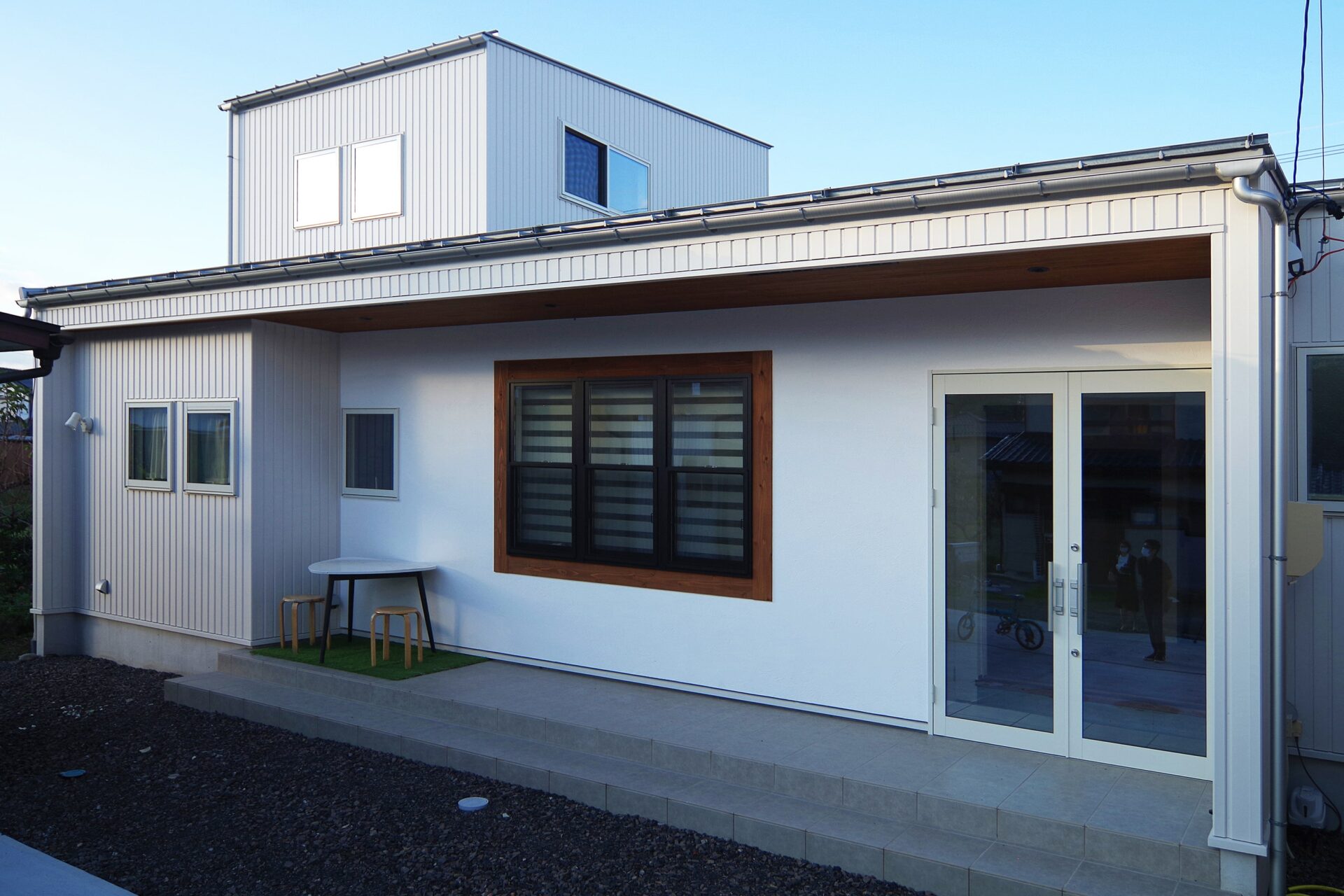 白いガルバリウムと漆喰の外壁に無垢材と黒の窓枠がアクセントに。おしゃれなCafeのような外観。