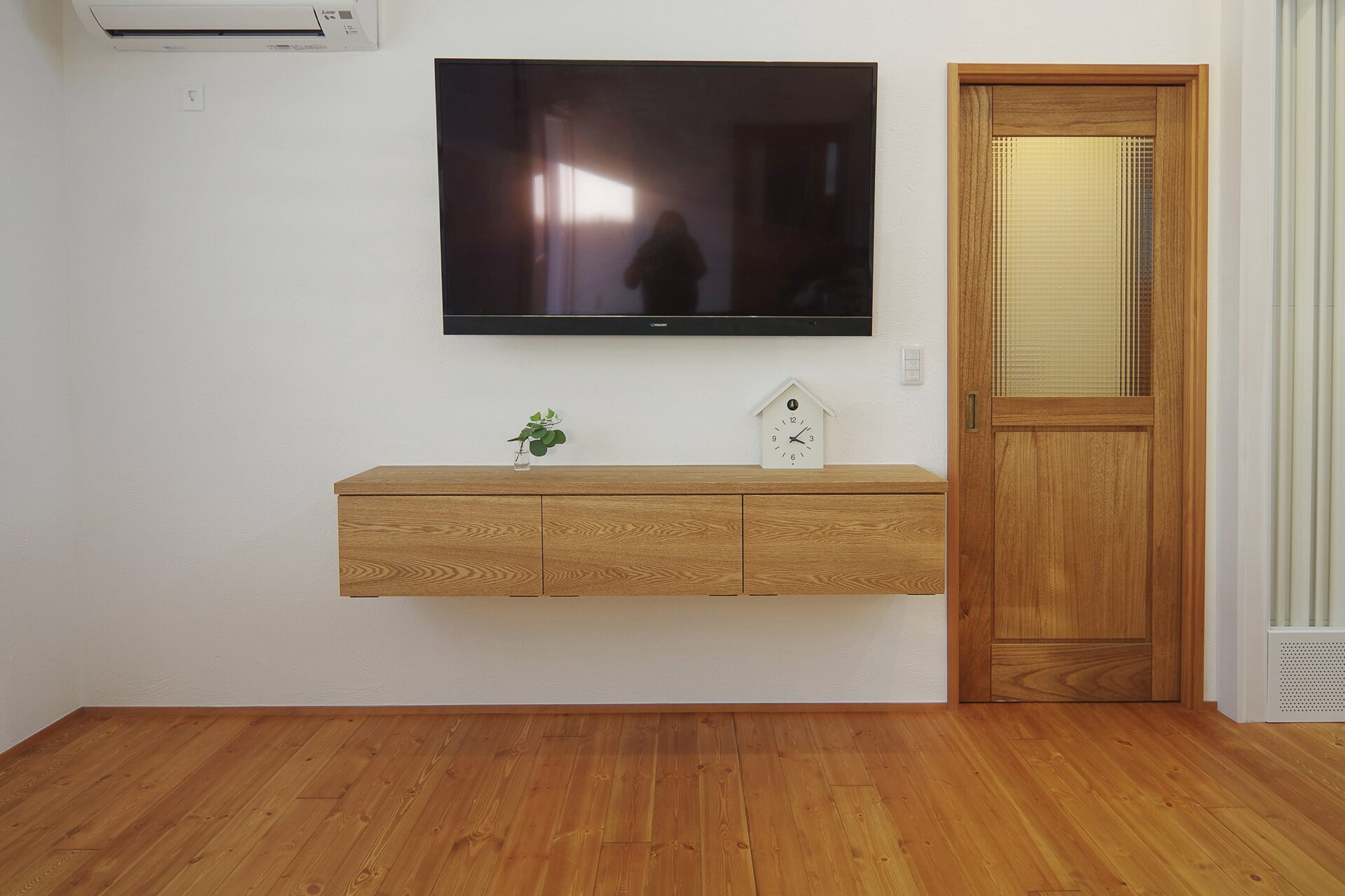 木目の流れが美しい造作のテレビボードは奥様のこだわり。シンプルで主張しすぎないデザイン。